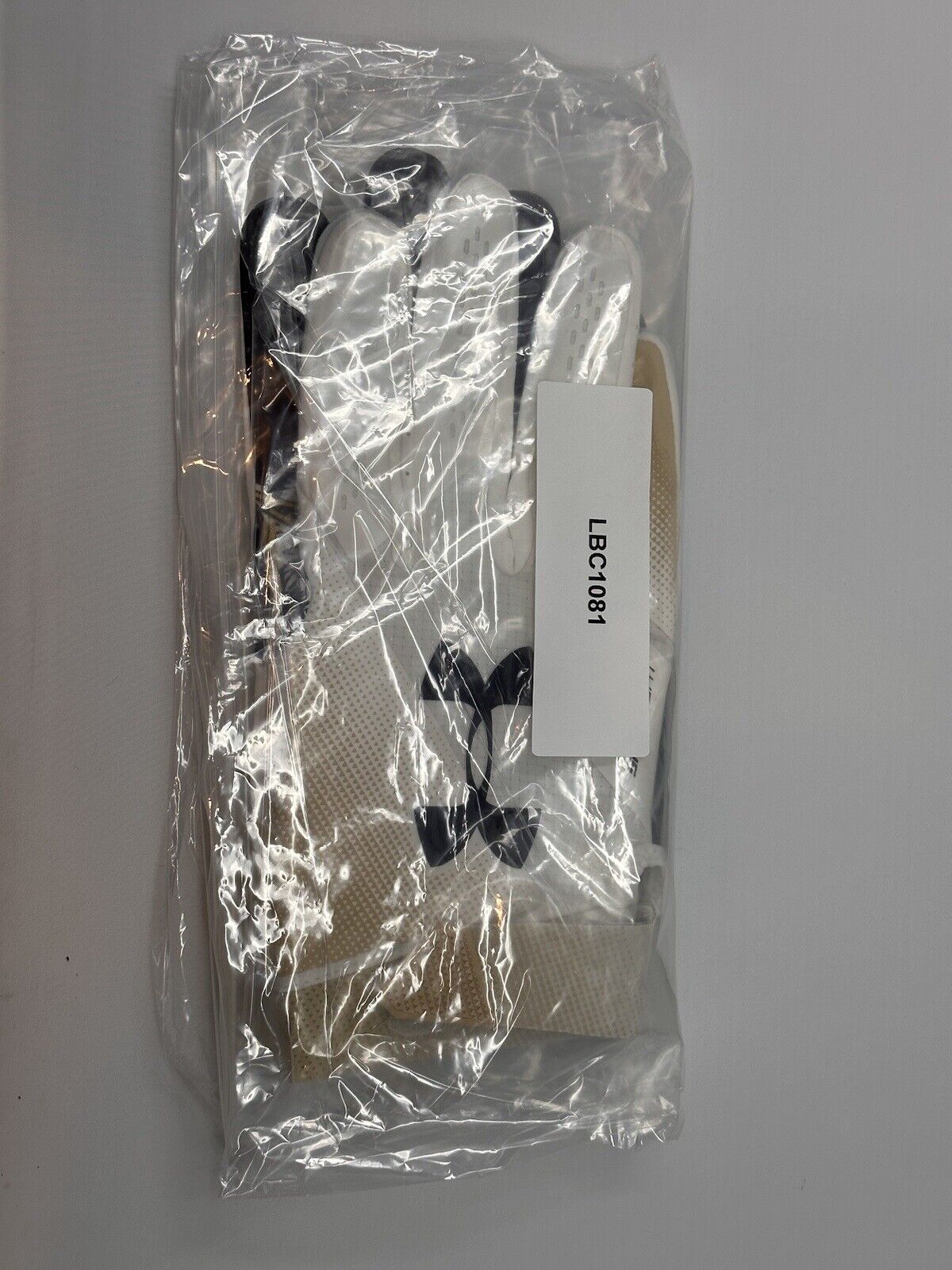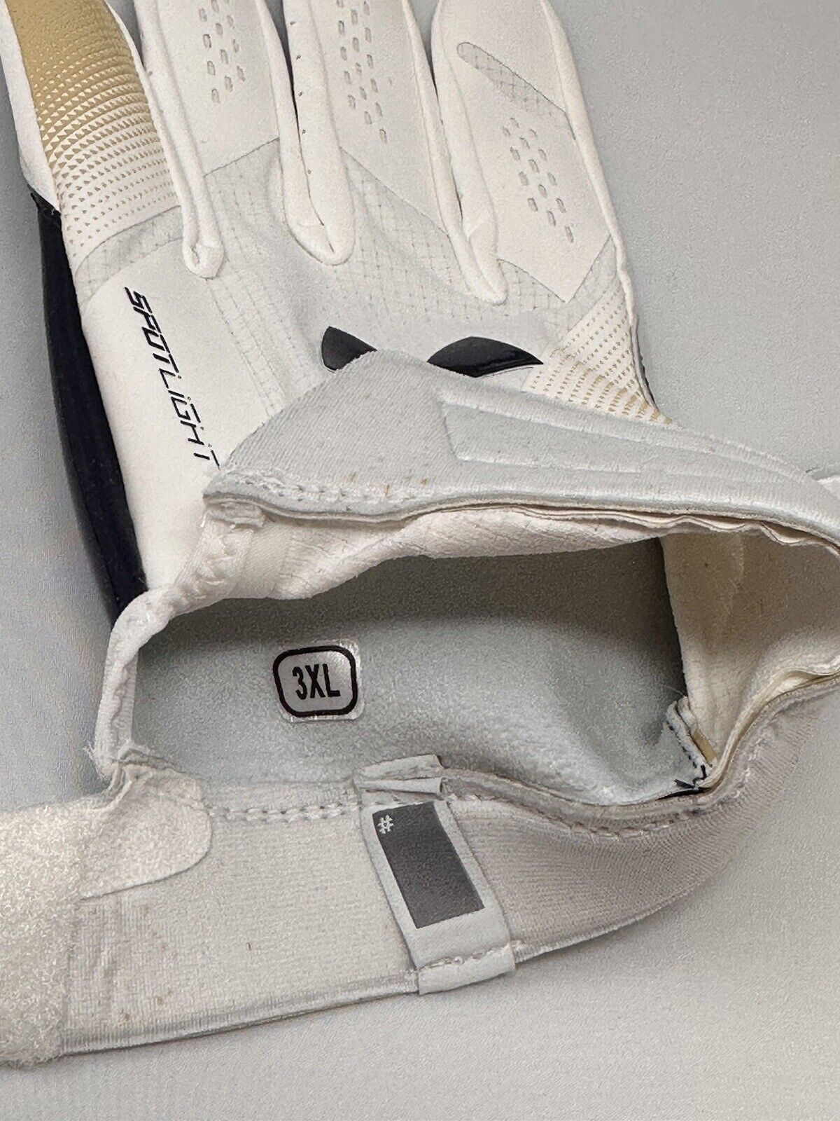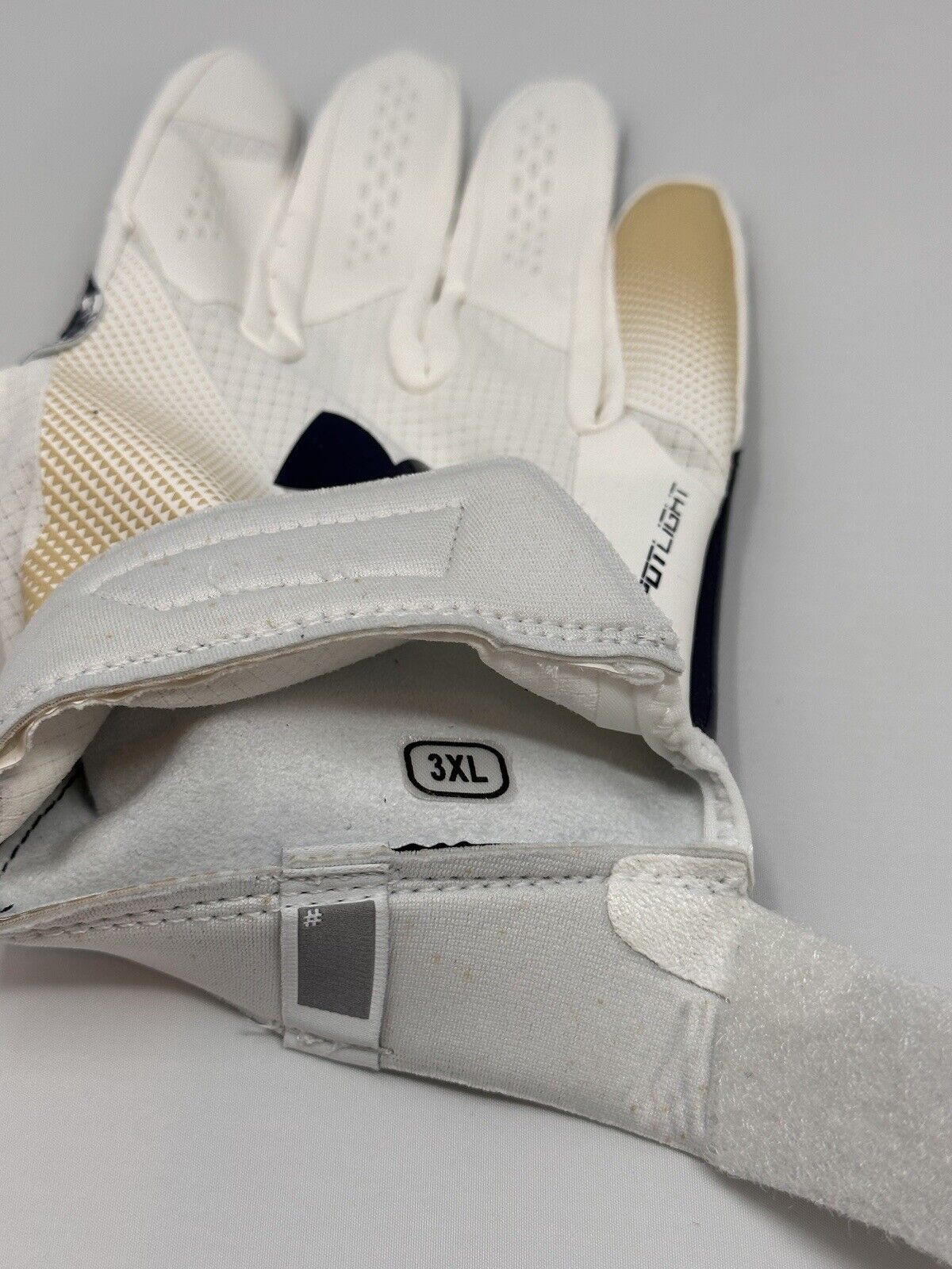 This extremely rare pair of Navy receiving gloves comes from the 2018 Army vs Navy game. The Navy logo design is displayed on palm side and the Navy colors on the back side. This set of gloves is a size 3XL and shows nice evidence of usage and comes in the original packaging that was provided with the gloves from the program.