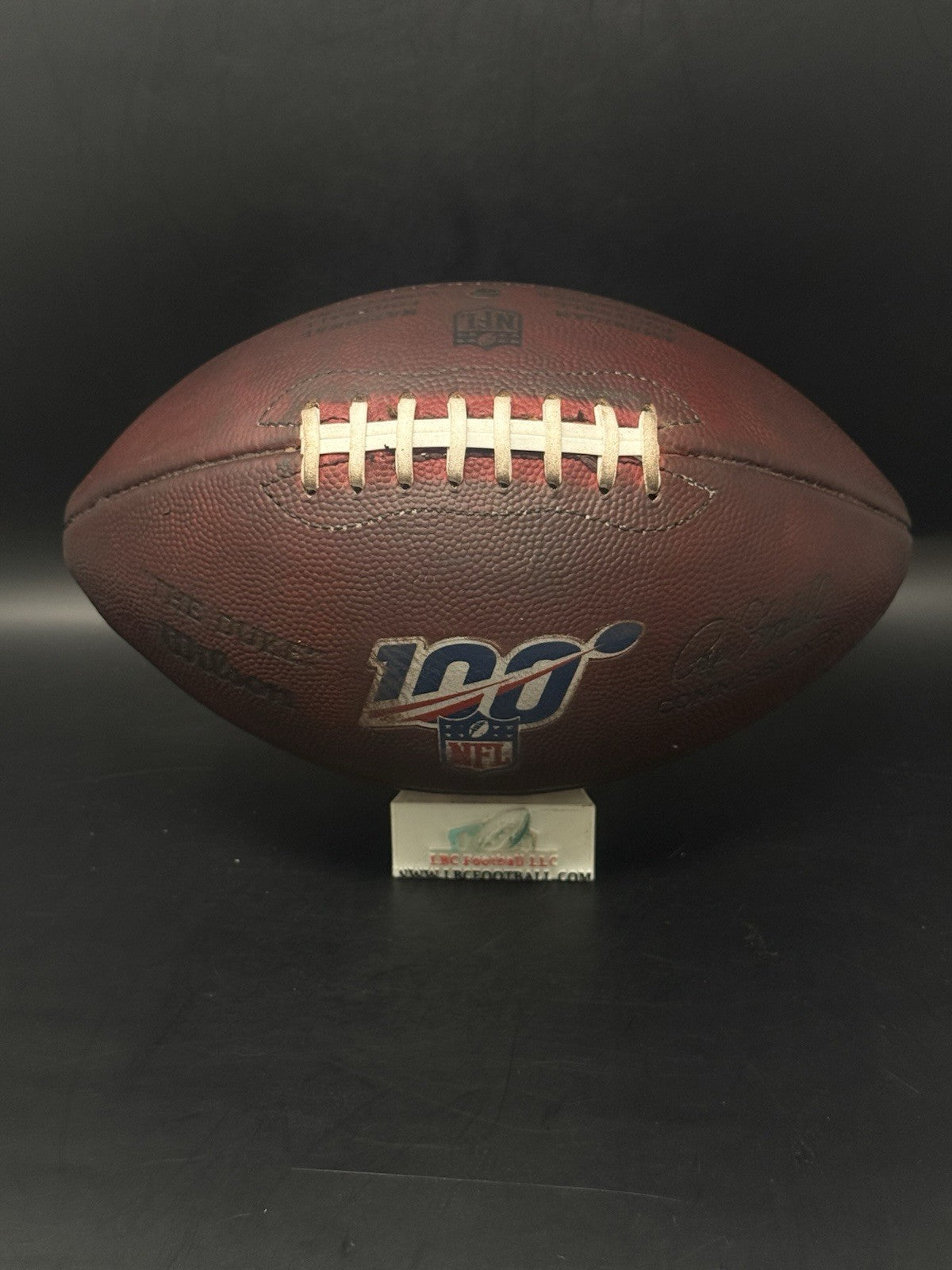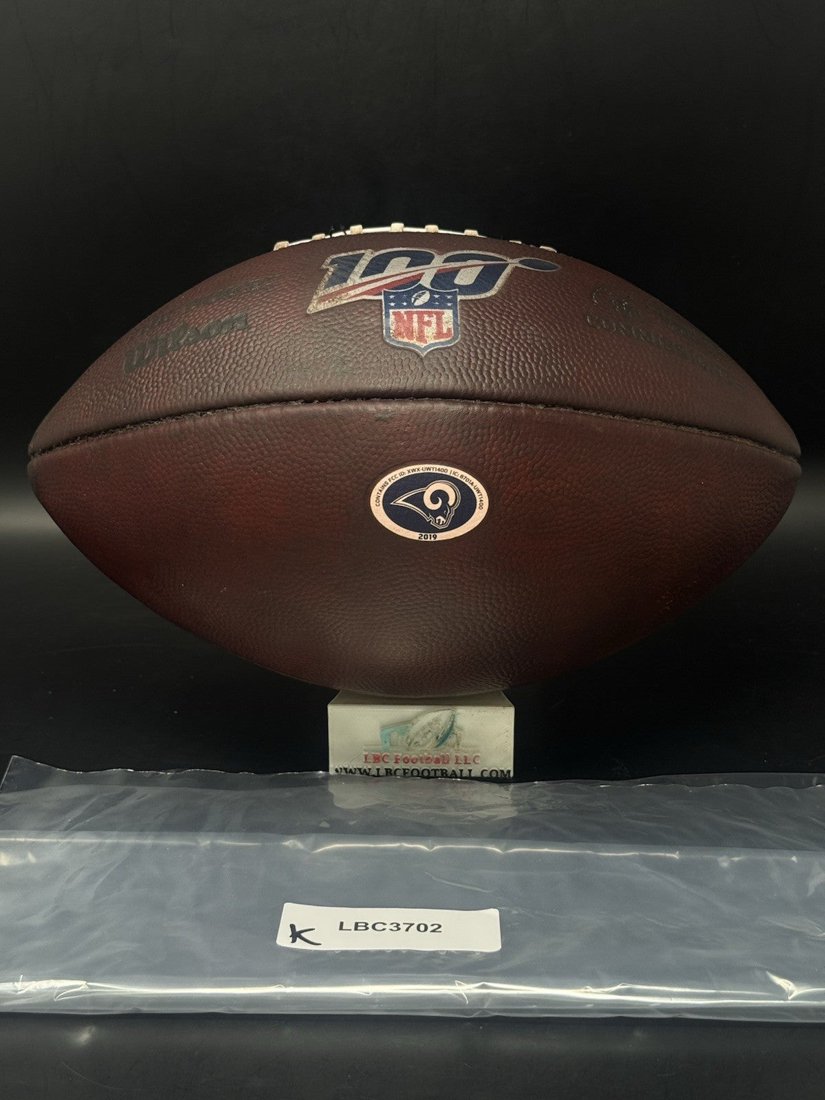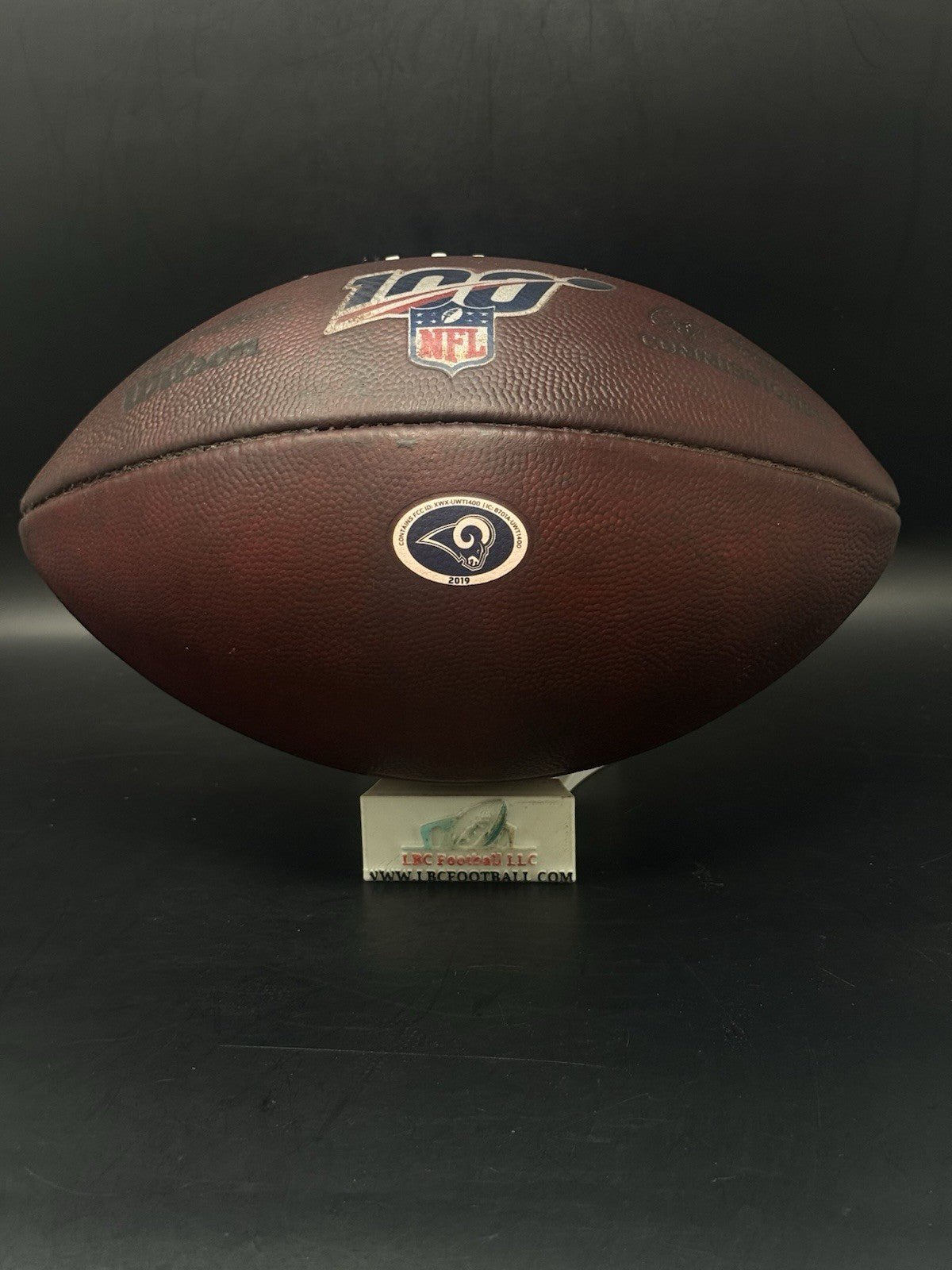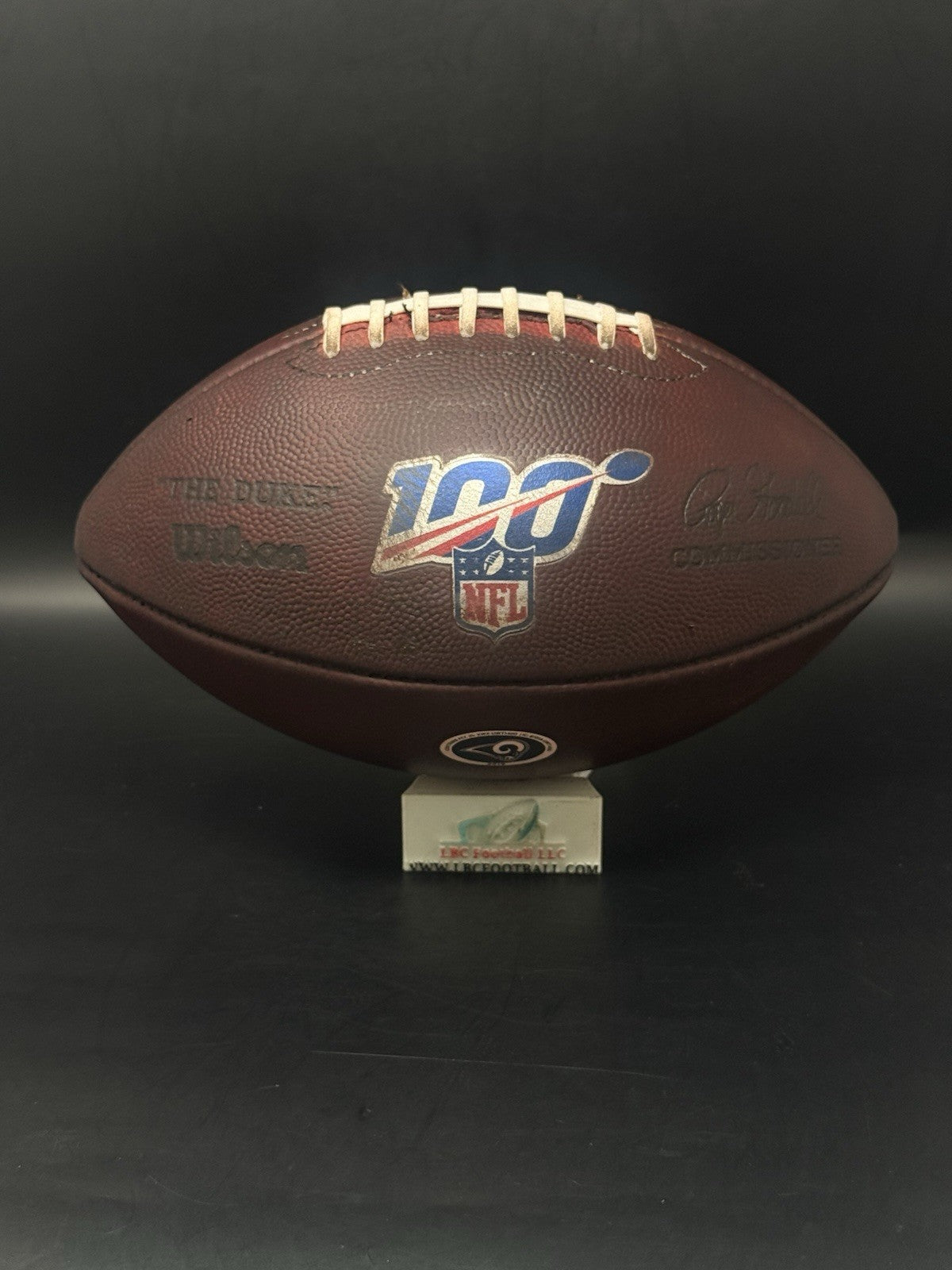 This Rams game ball comes with the team logo, season year and RFID serial number for the microchip inserted inside this football. This football also has the 100yr Anniversary logo embossed on the leather panel which was used by every team during the 2019 NFL season.