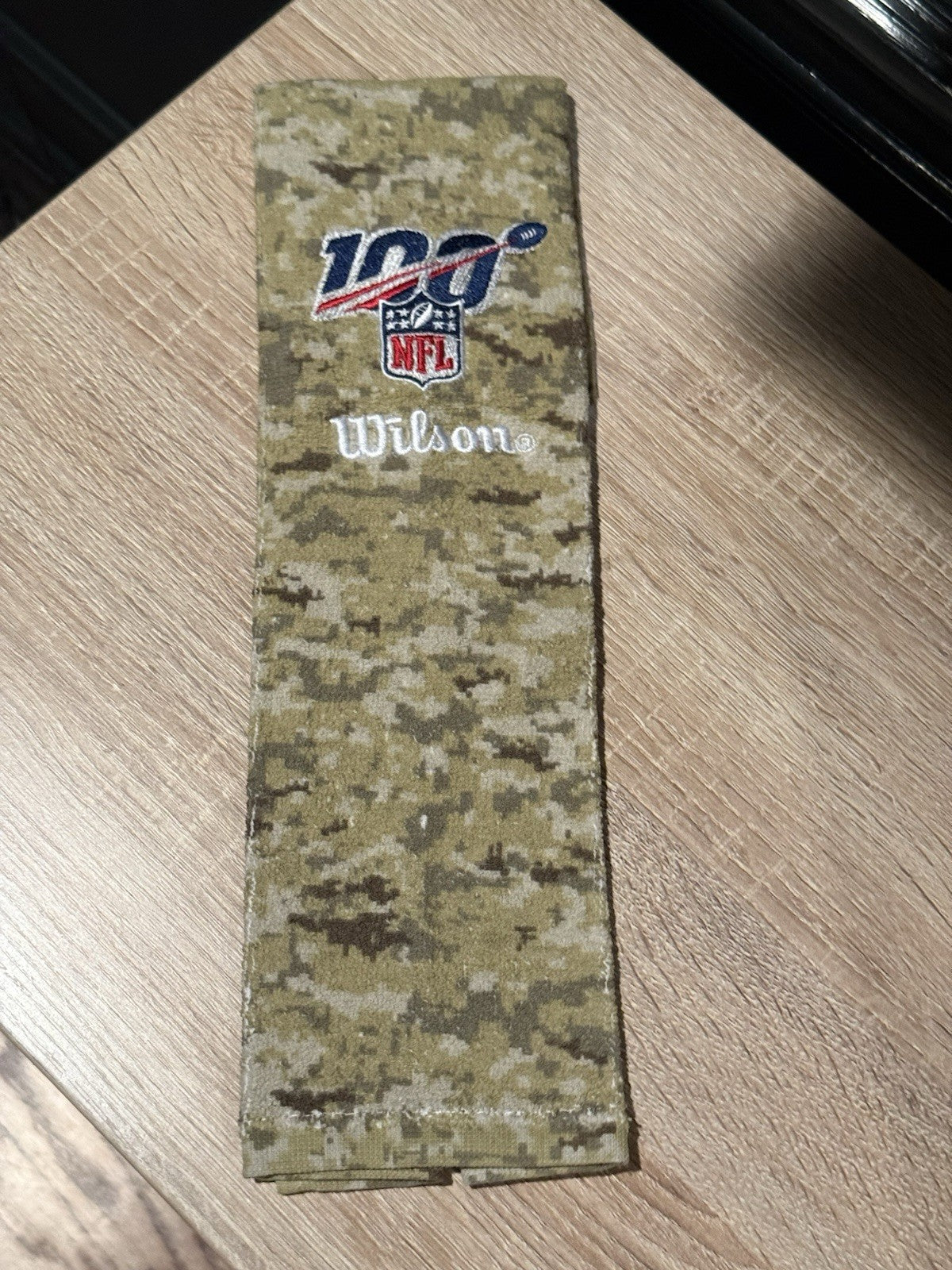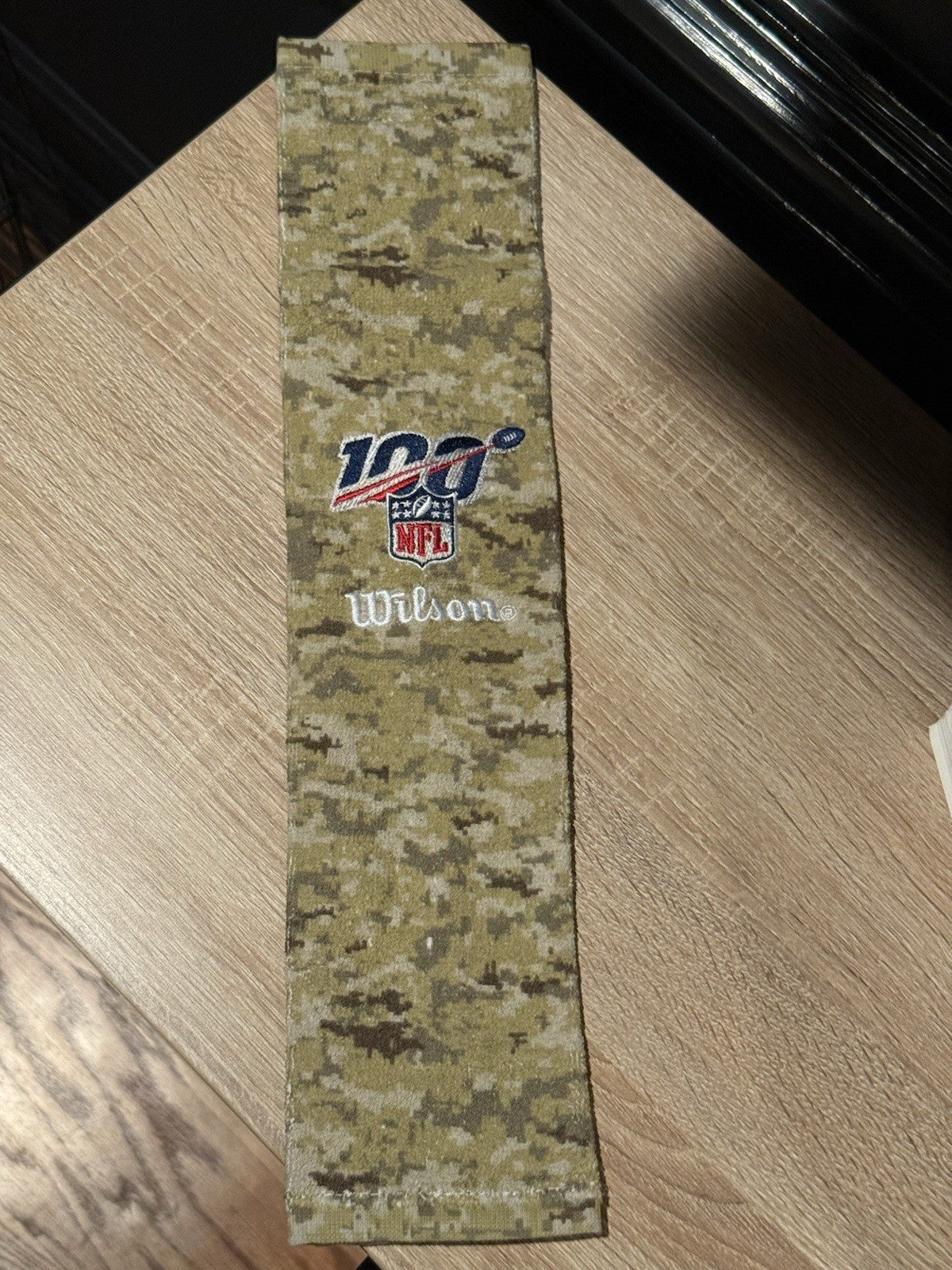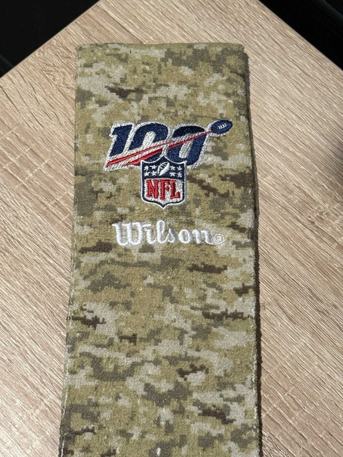 Authentic Brand-New NFL Football QB Sweat Towel in the limited-edition Salute to Service Camouflage design. What makes this towel even more unique is the 100yr logo which was only used during the 2019 season.