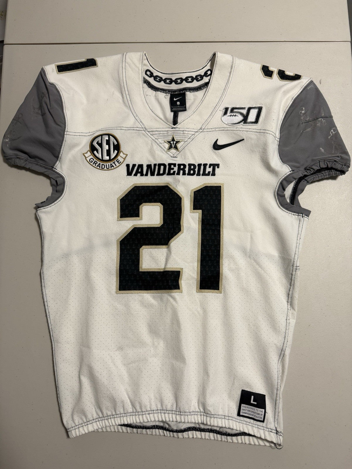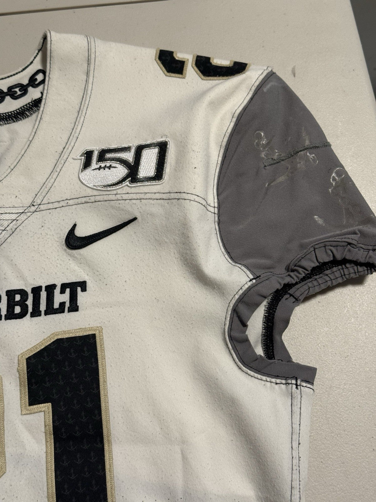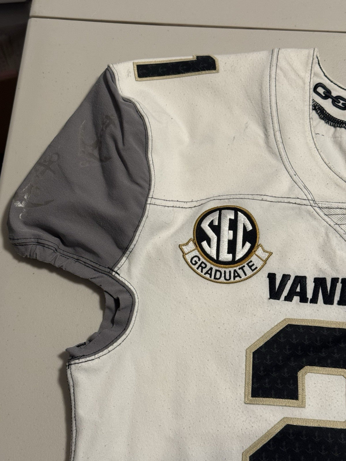 Rare Vandy jersey from the program, used several seasons ago. This particular jersey comes with the 150yr anniversary patch, worn in 2019 by numerous college teams and with the "SEC Graduate" patch.