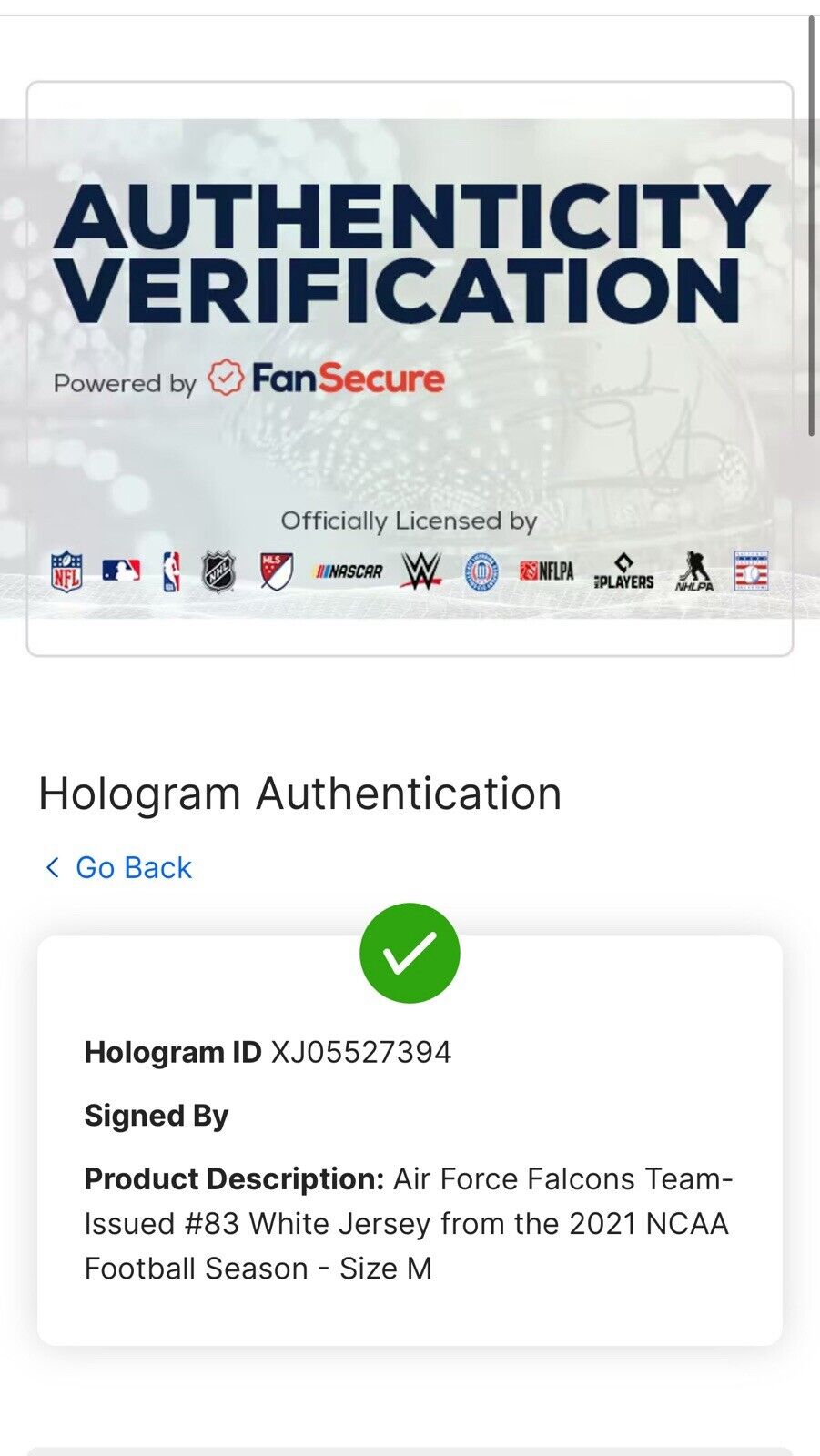 Authentic 2021 Air Force Falcons Team Issued Nike Football Jersey with traceable Fanatics Hologram Authentication COA affixed to the jersey tag.