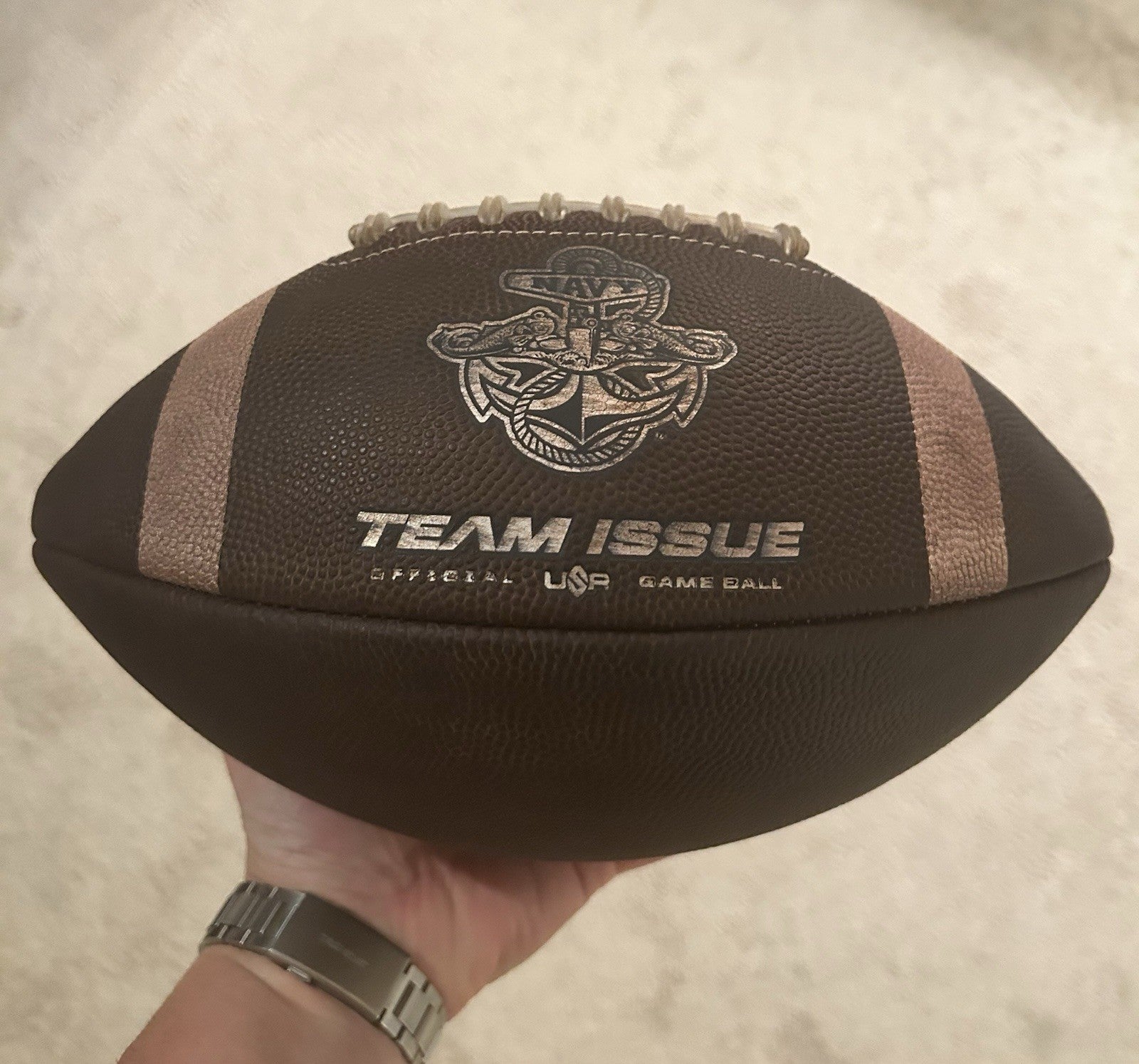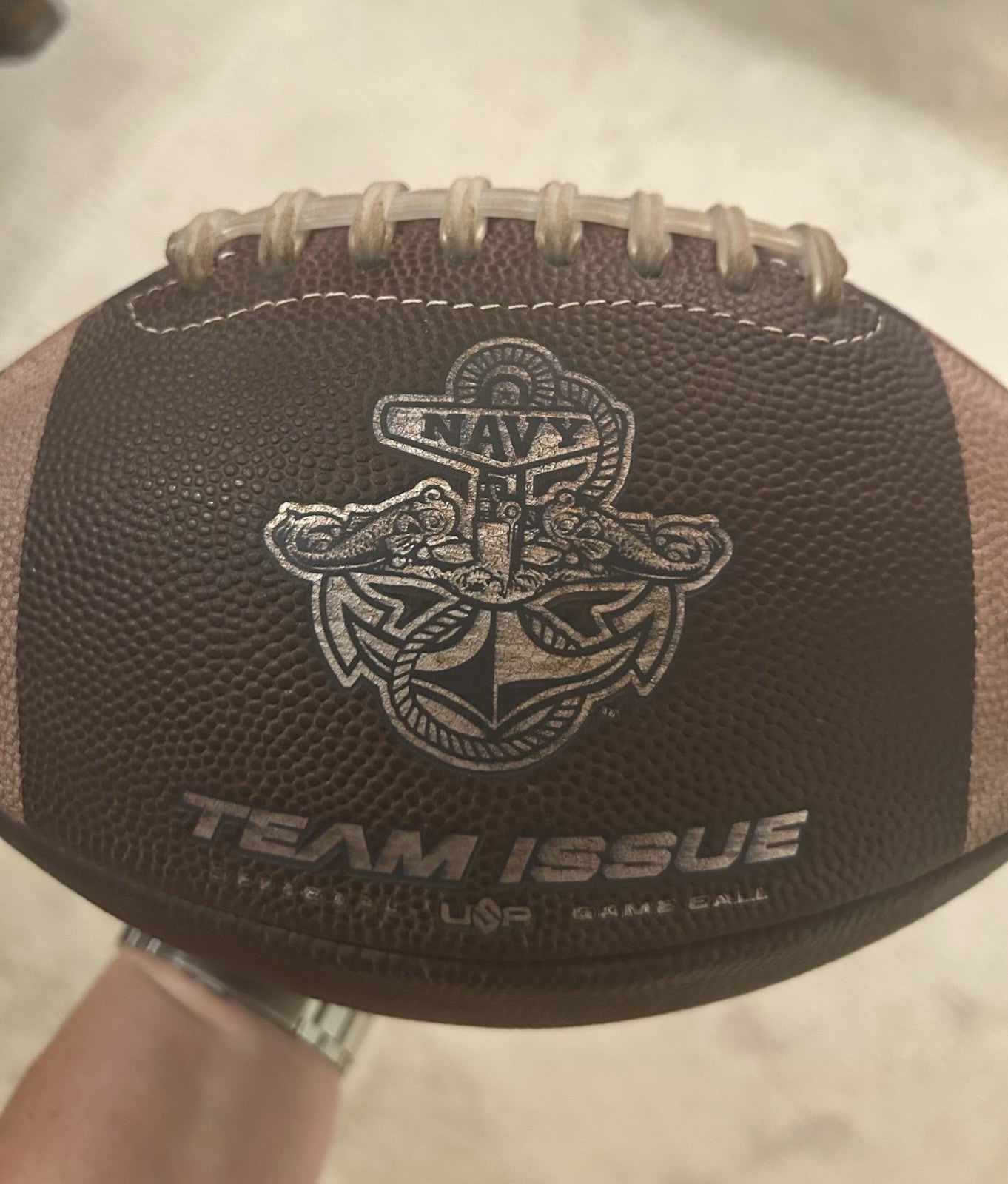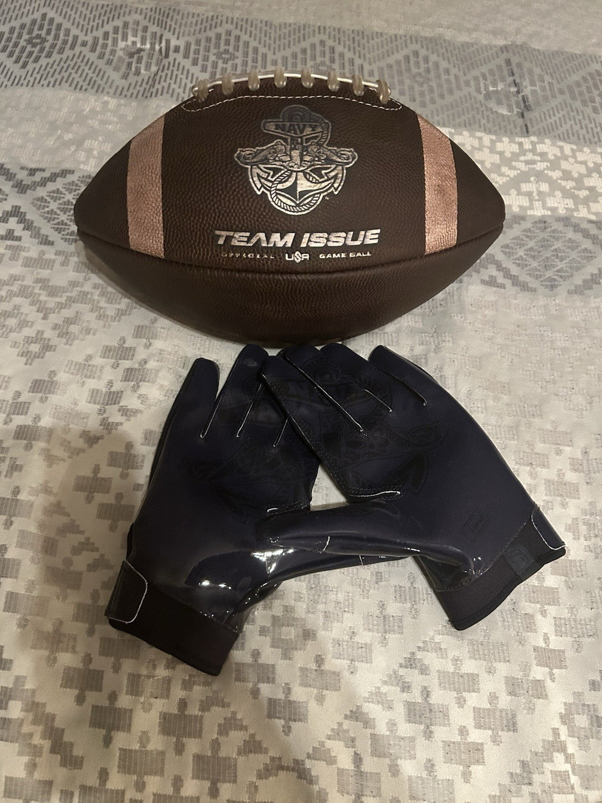 2023 Navy practice used ball and game gloves size L from the Army Navy game. They would only allow this ball to be used in practice because of the porthole on the side of the ball officials would not allow them to be used in the game so a very similar ball was used in the game.