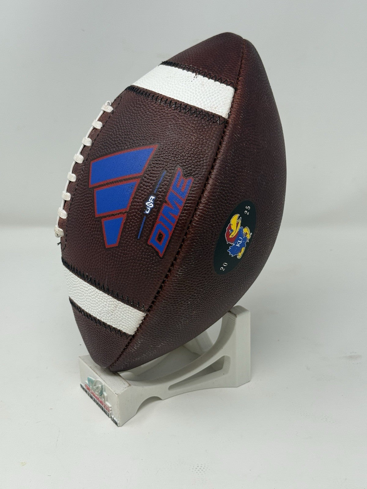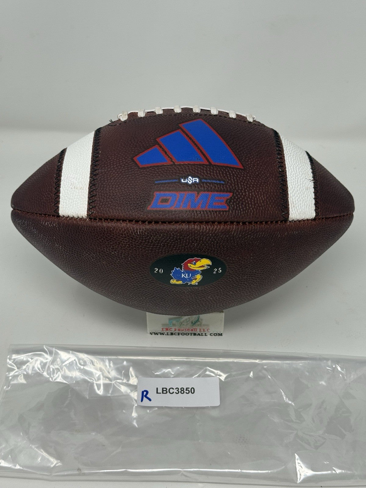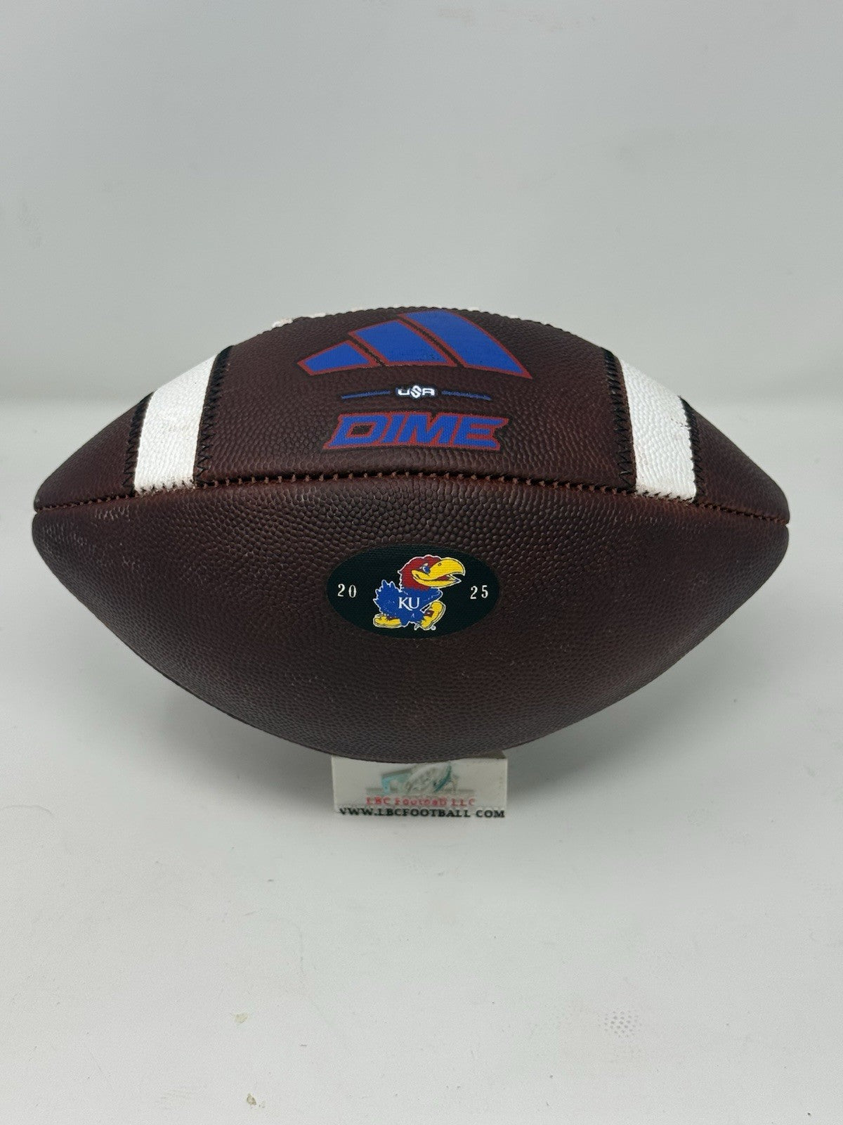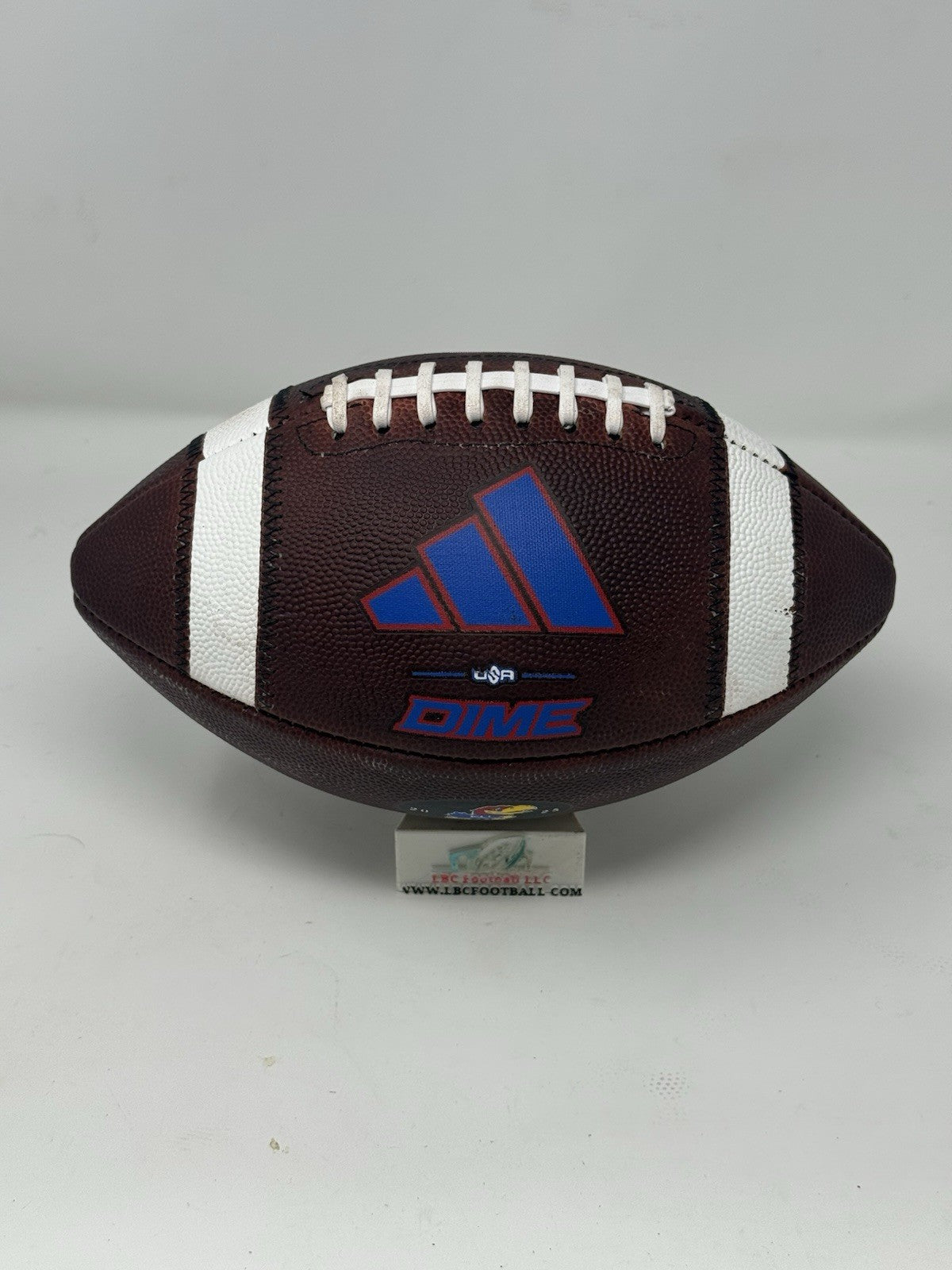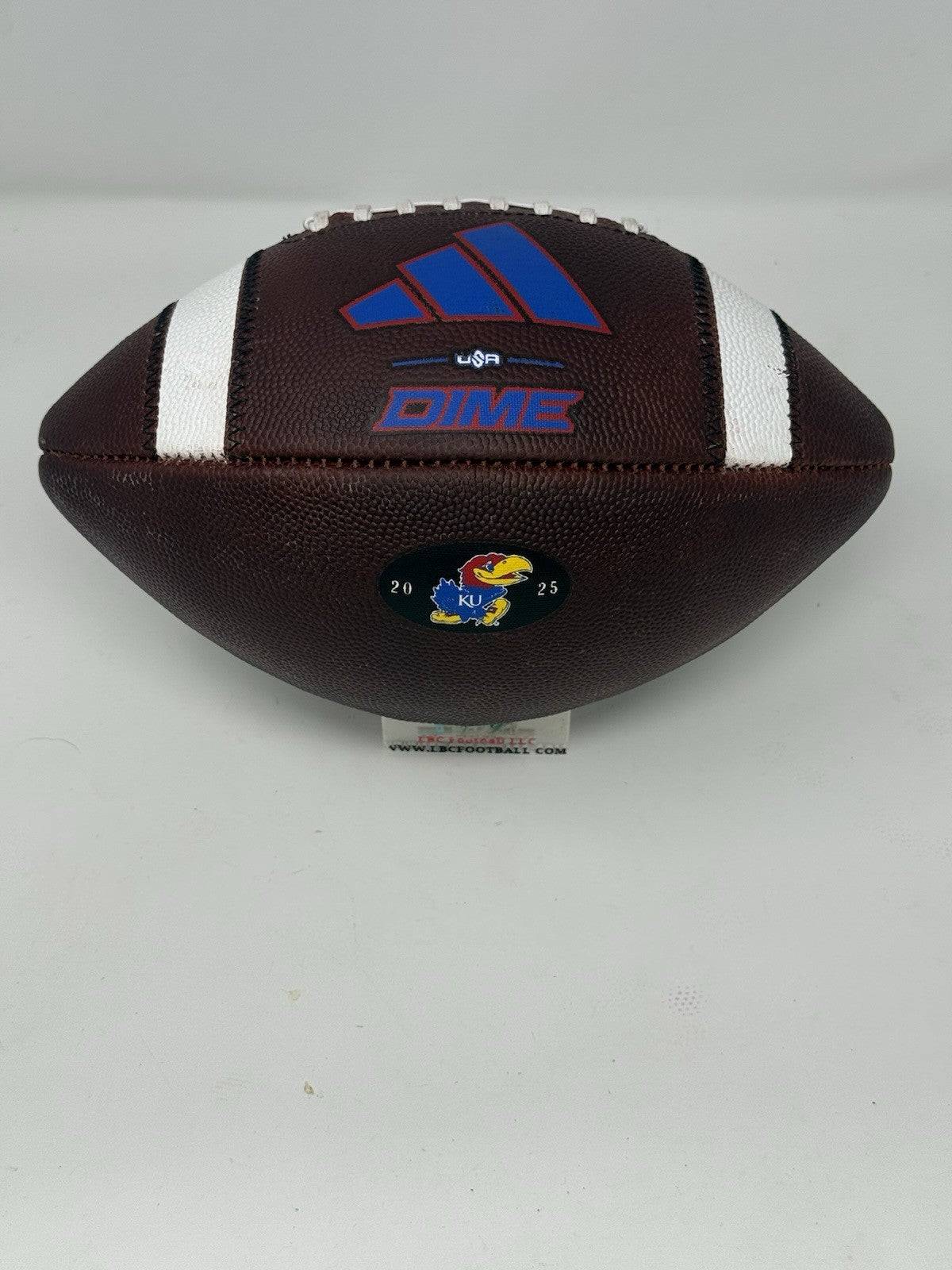 Authentic University of Kansas Jayhawks Game Issued Adidas Dime NCAA Football. The leather has been brushed, conditioned and tacked. The bladder holds air just fine, logos very well intact making this a great ball for any Jayhawks fan or future star.