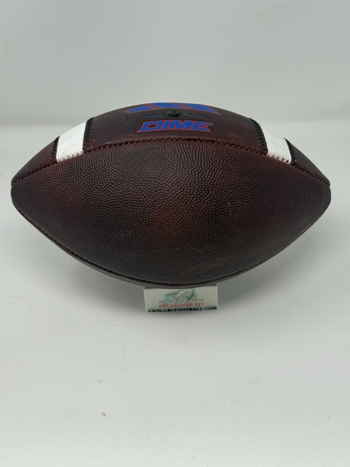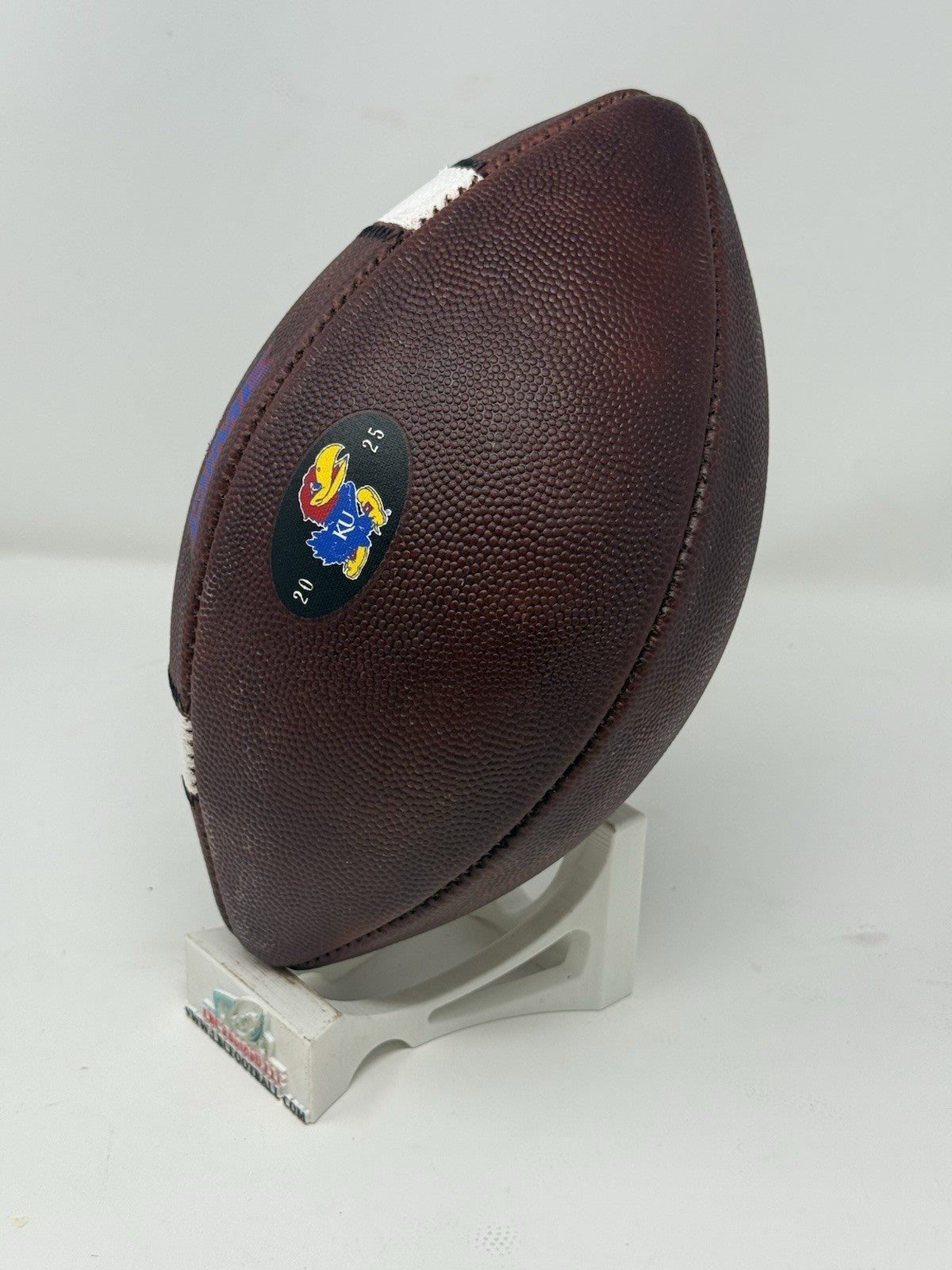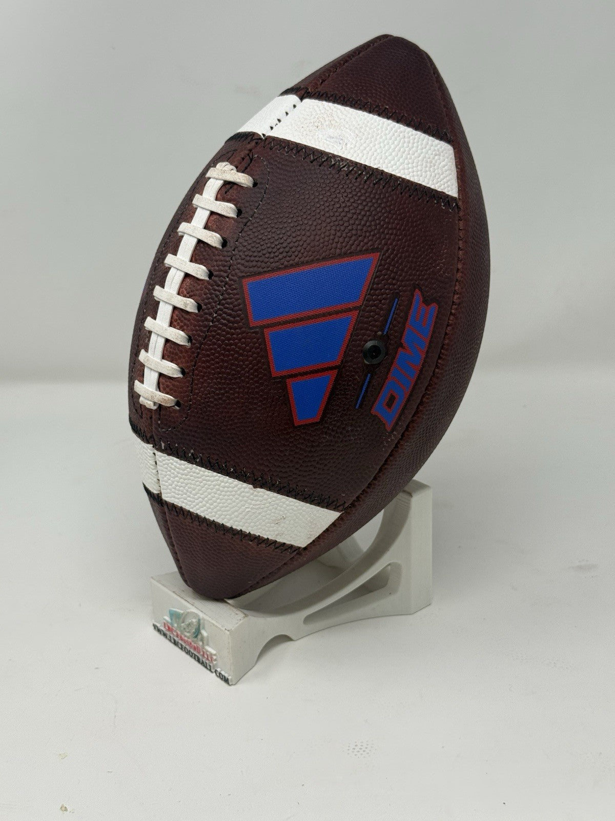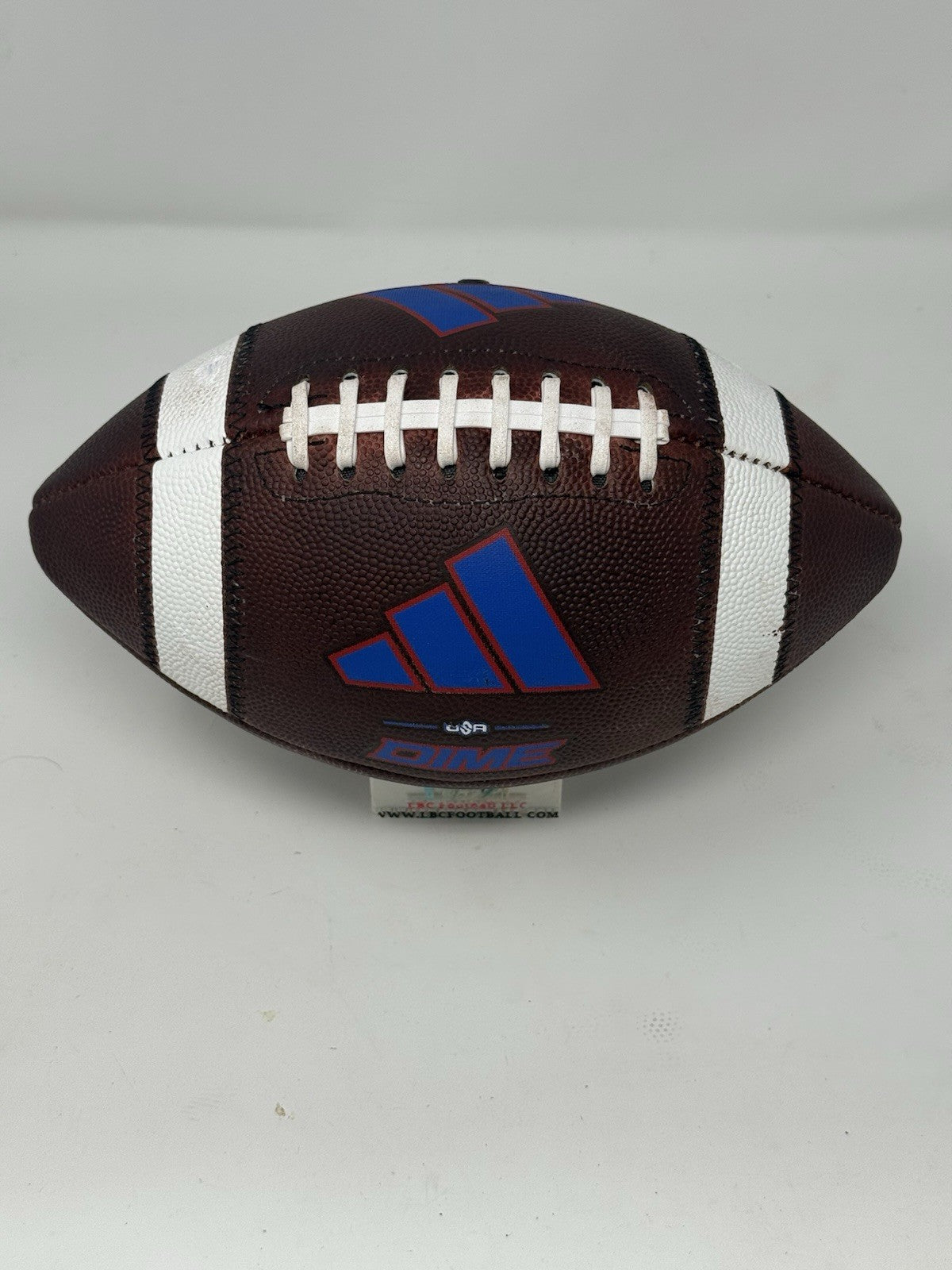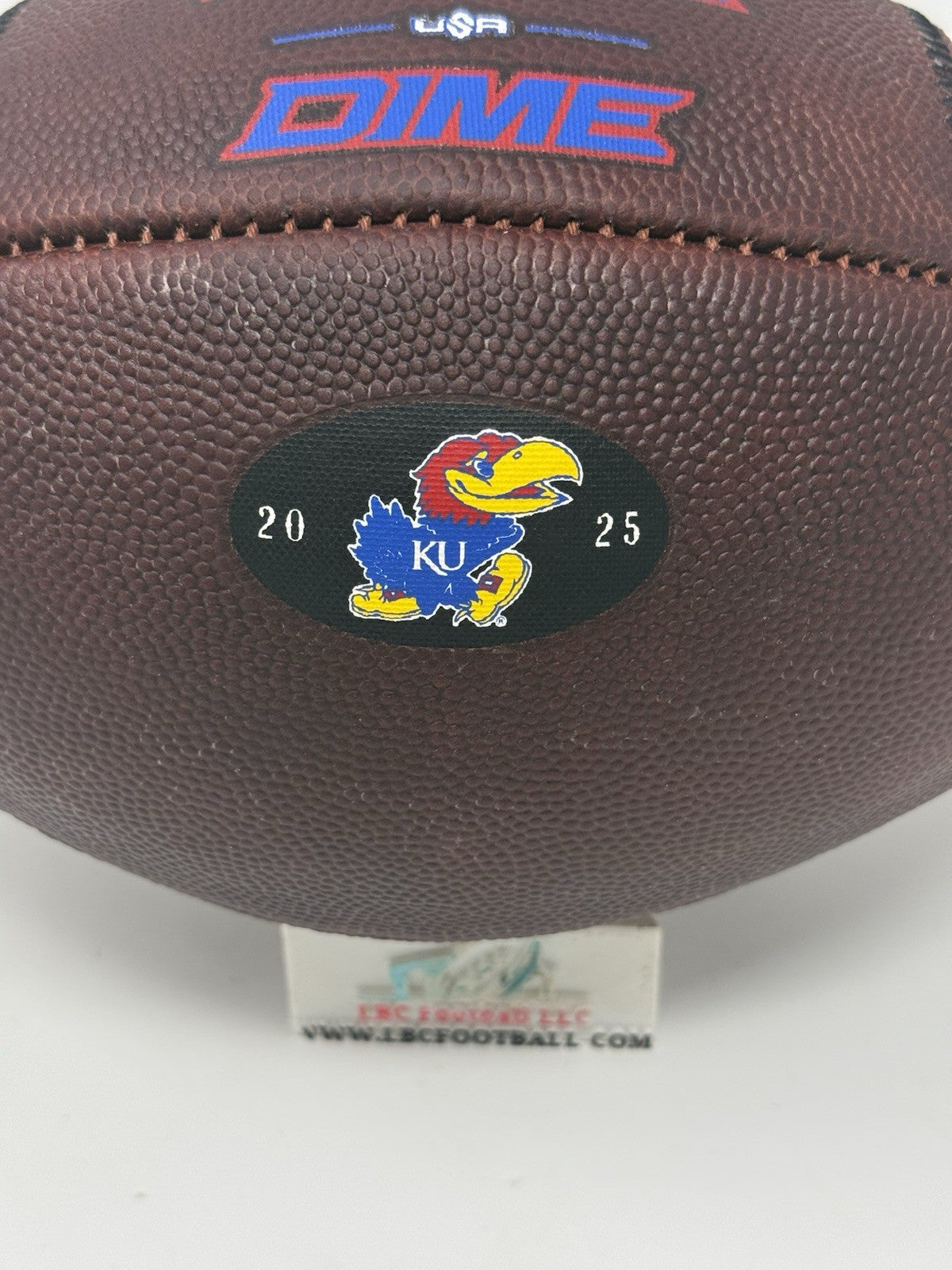 Authentic University of Kansas Jayhawks Game Issued Adidas Dime NCAA Football. The leather has been brushed, conditioned and tacked. The bladder holds air just fine, logos very well intact making this a great ball for any Jayhawks fan or future star.