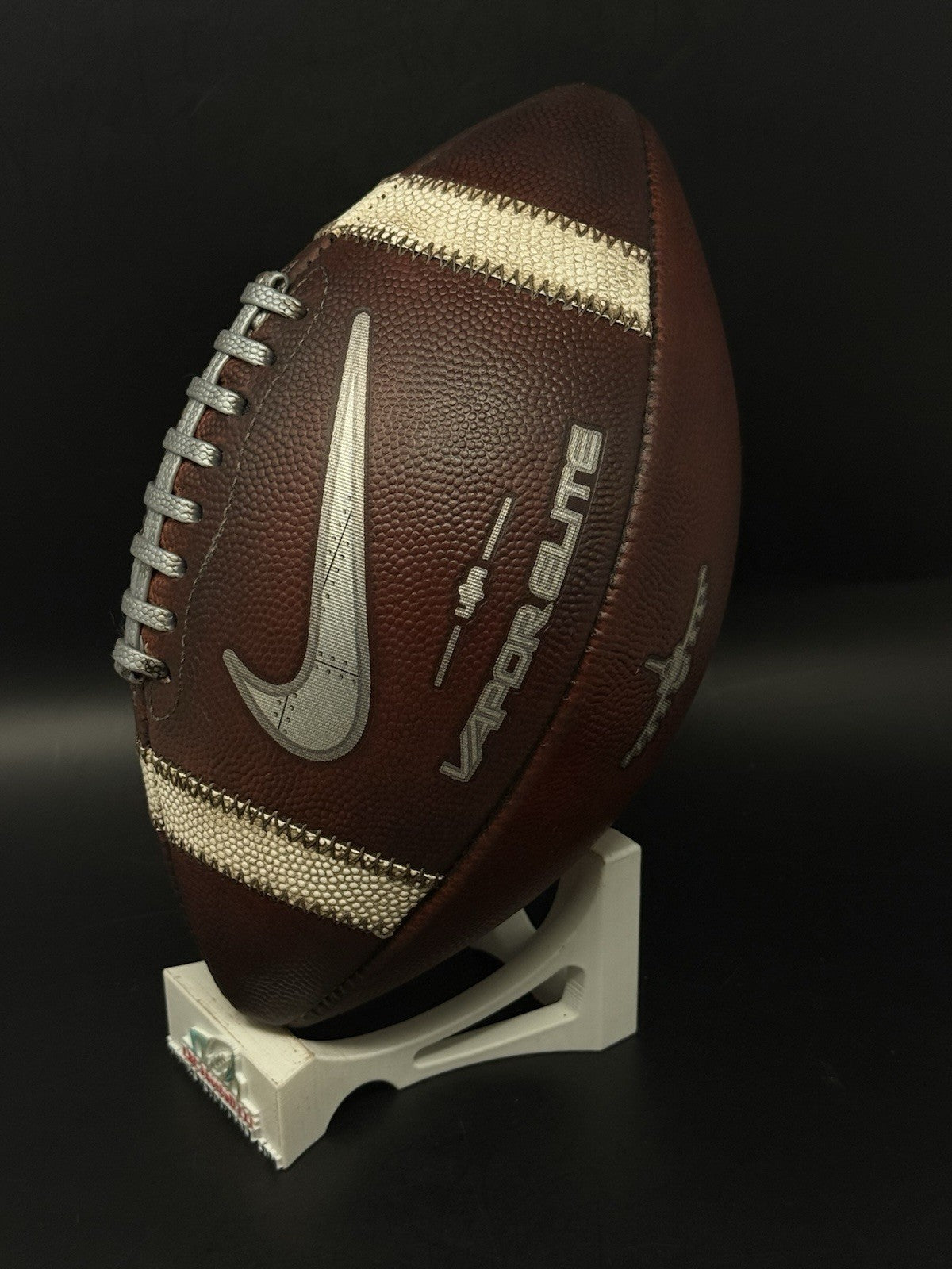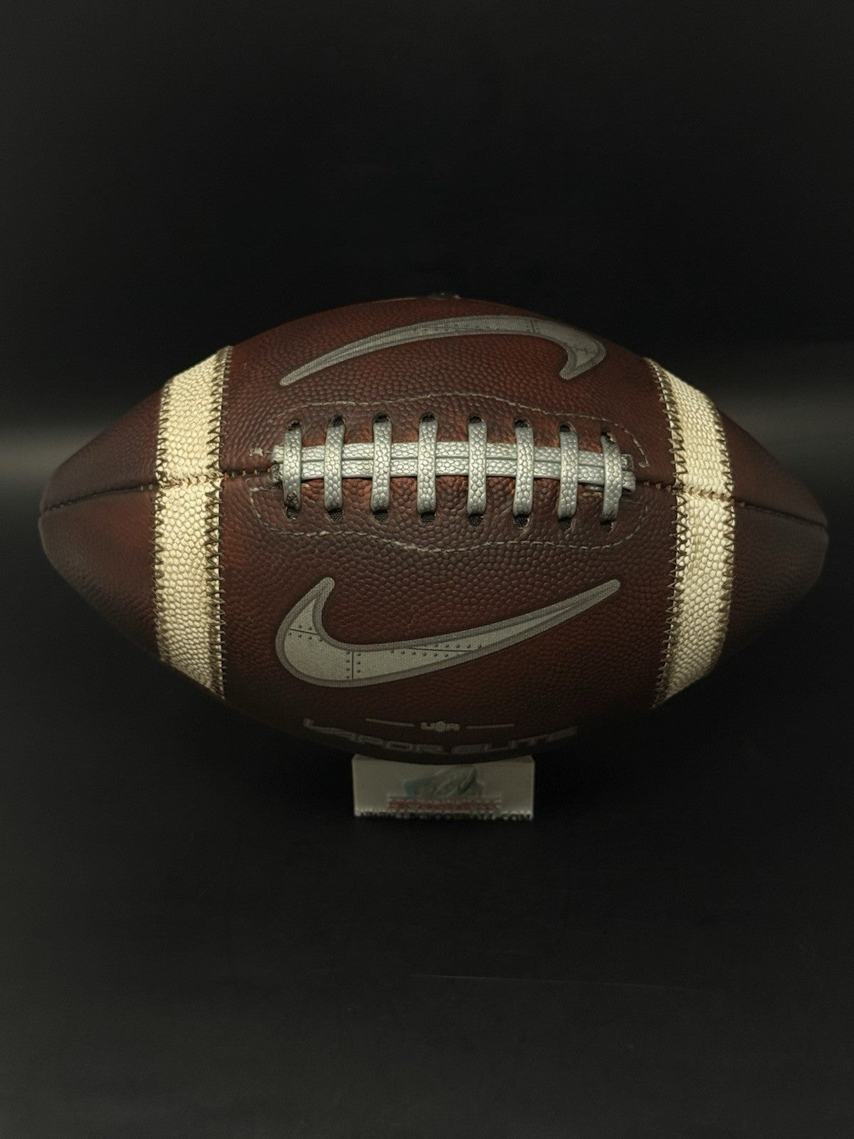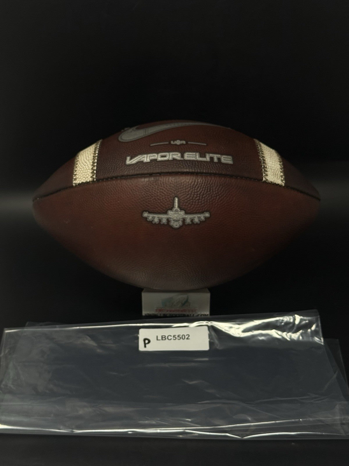 This uniquely designed Air Force game ball comes with the embossed F-16 Fighting Falcon logo, custom Nike Swoosh with aircraft rivet graphics, F-16 silhouette integrated panel design pattern and gray pebbled lace with overlay stripe for enhanced grip. To complement all the custom features on this football, the leather panels have been meticulously game prepped thus darkening and protecting the leather panels, removing the factory wax and improving the grip by treating the leather with football mud, conditioners and extensive brushing.