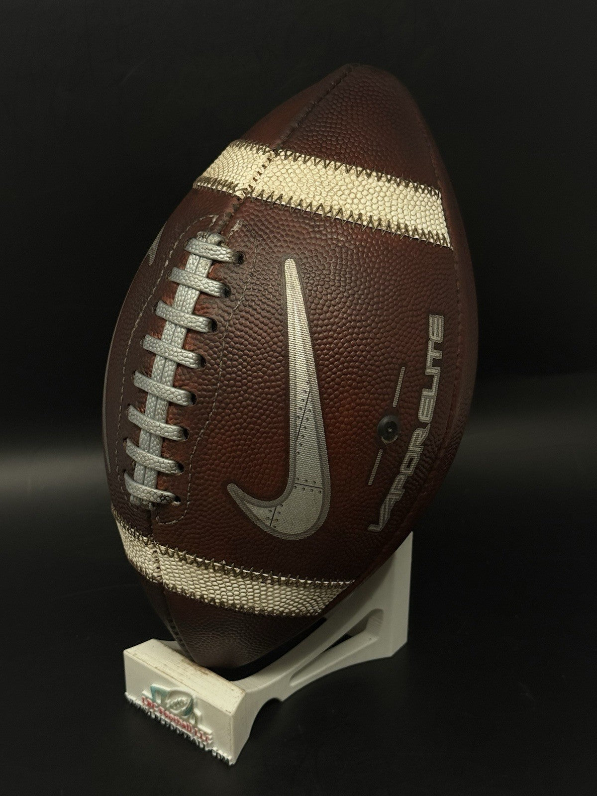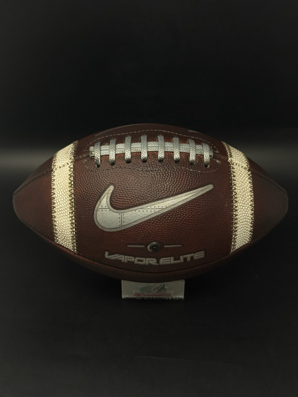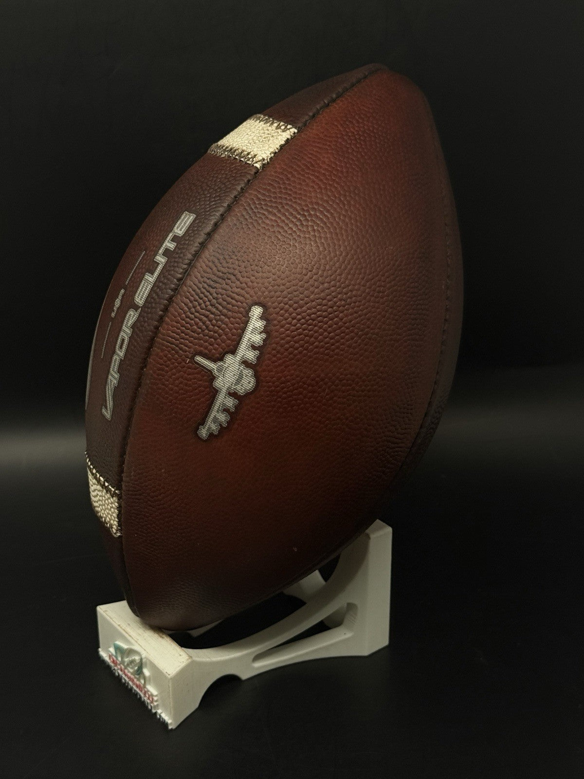 This uniquely designed Air Force game ball comes with the embossed F-16 Fighting Falcon logo, custom Nike Swoosh with aircraft rivet graphics, F-16 silhouette integrated panel design pattern and gray pebbled lace with overlay stripe for enhanced grip. To complement all the custom features on this football, the leather panels have been meticulously game prepped thus darkening and protecting the leather panels, removing the factory wax and improving the grip by treating the leather with football mud, conditioners and extensive brushing.