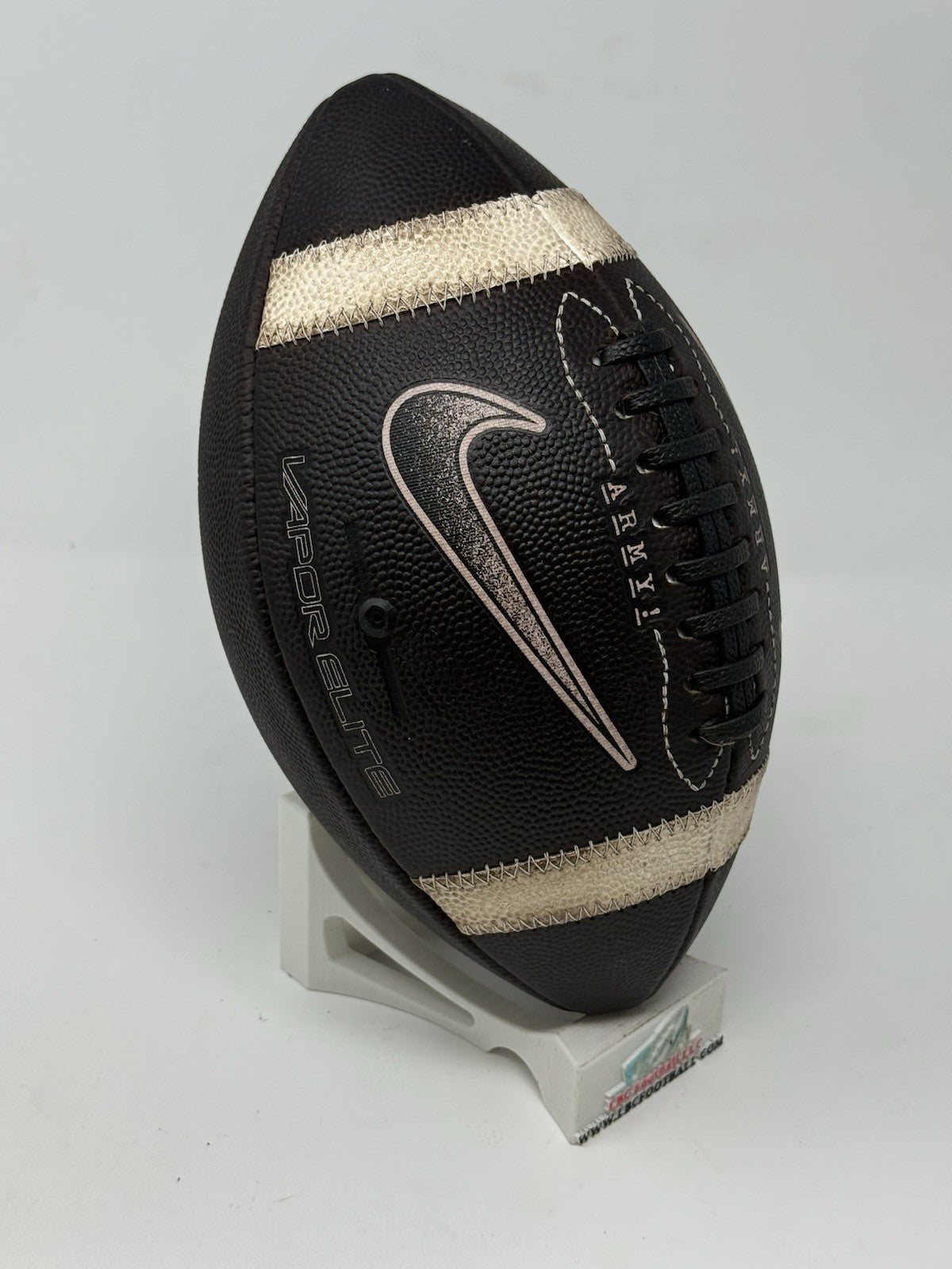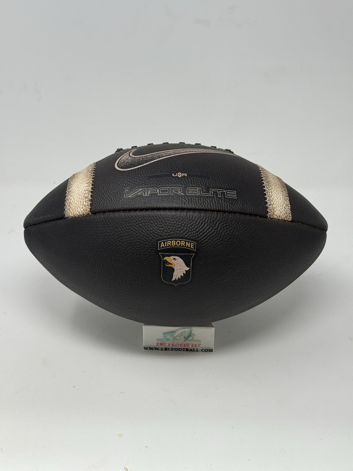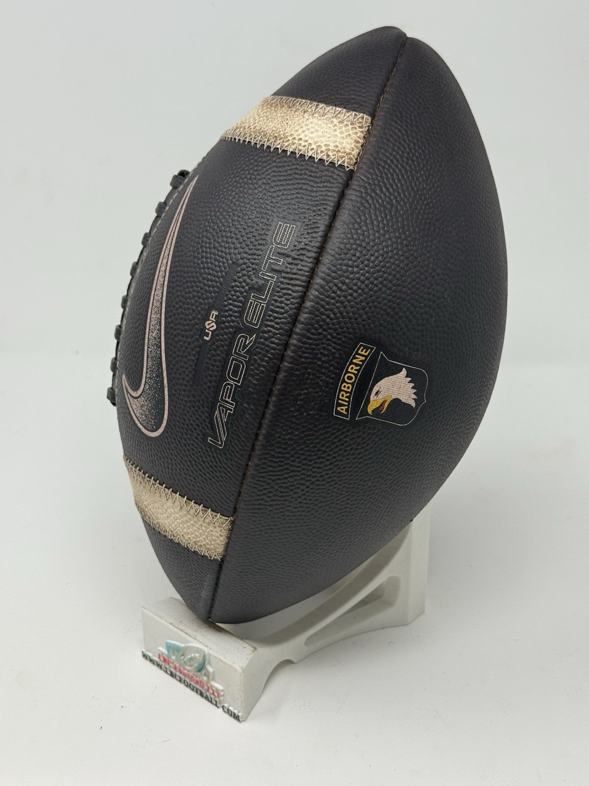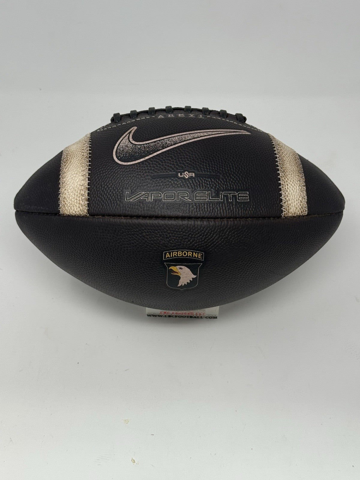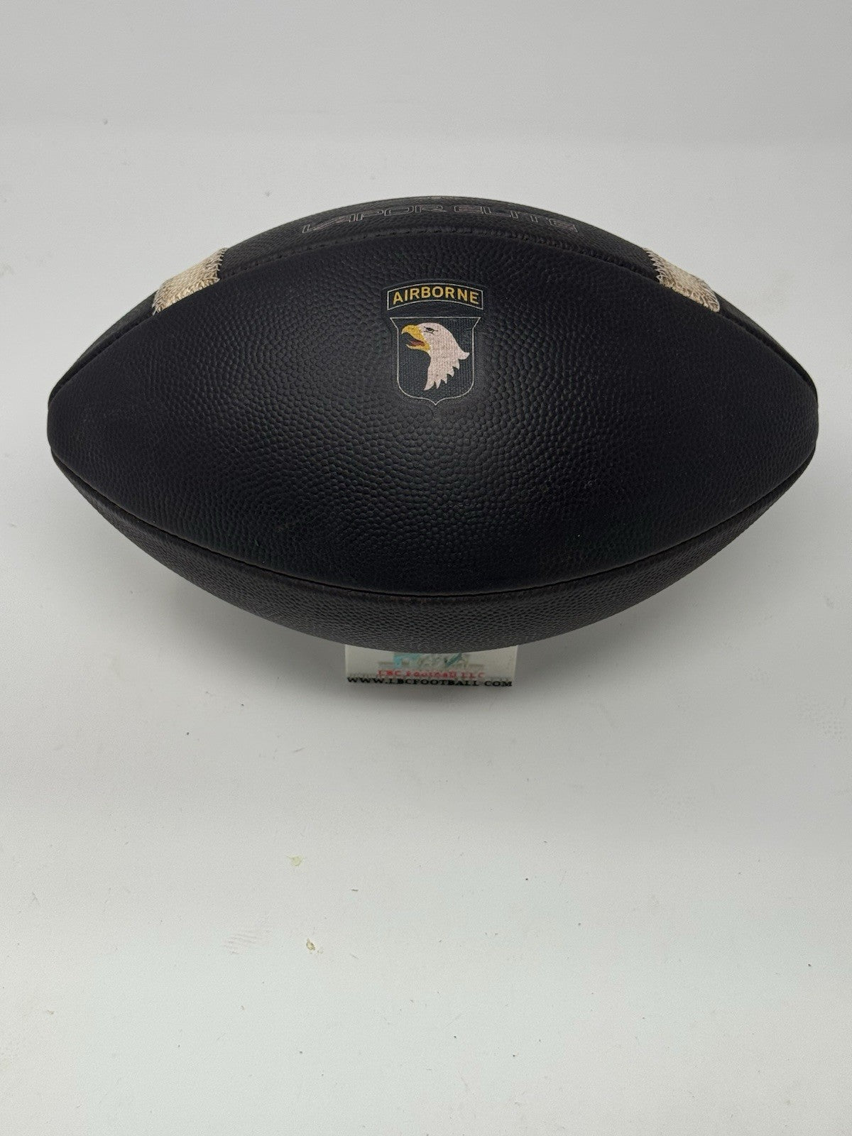 This commemorative football is more than just a piece of equipment—it tells a story. The iconic 101st Airborne “Screaming Eagles” patch proudly adorns the ball, while the laces are reinforced with an authentic Army-issued parachute, visible underneath the black pebbled laces. The frosted Nike swoosh and icy white stitching evoke the freezing winter conditions of Bastogne, a pivotal WWII battle where grit and determination prevailed against all odds. The rich brown Playoff leather offers optimal grip and durability, a nod to the resilience of those who fought in unforgiving conditions. The custom “A.R.M.Y. !” in the stitching adds a finishing touch and further symbolizes unity and toughness.