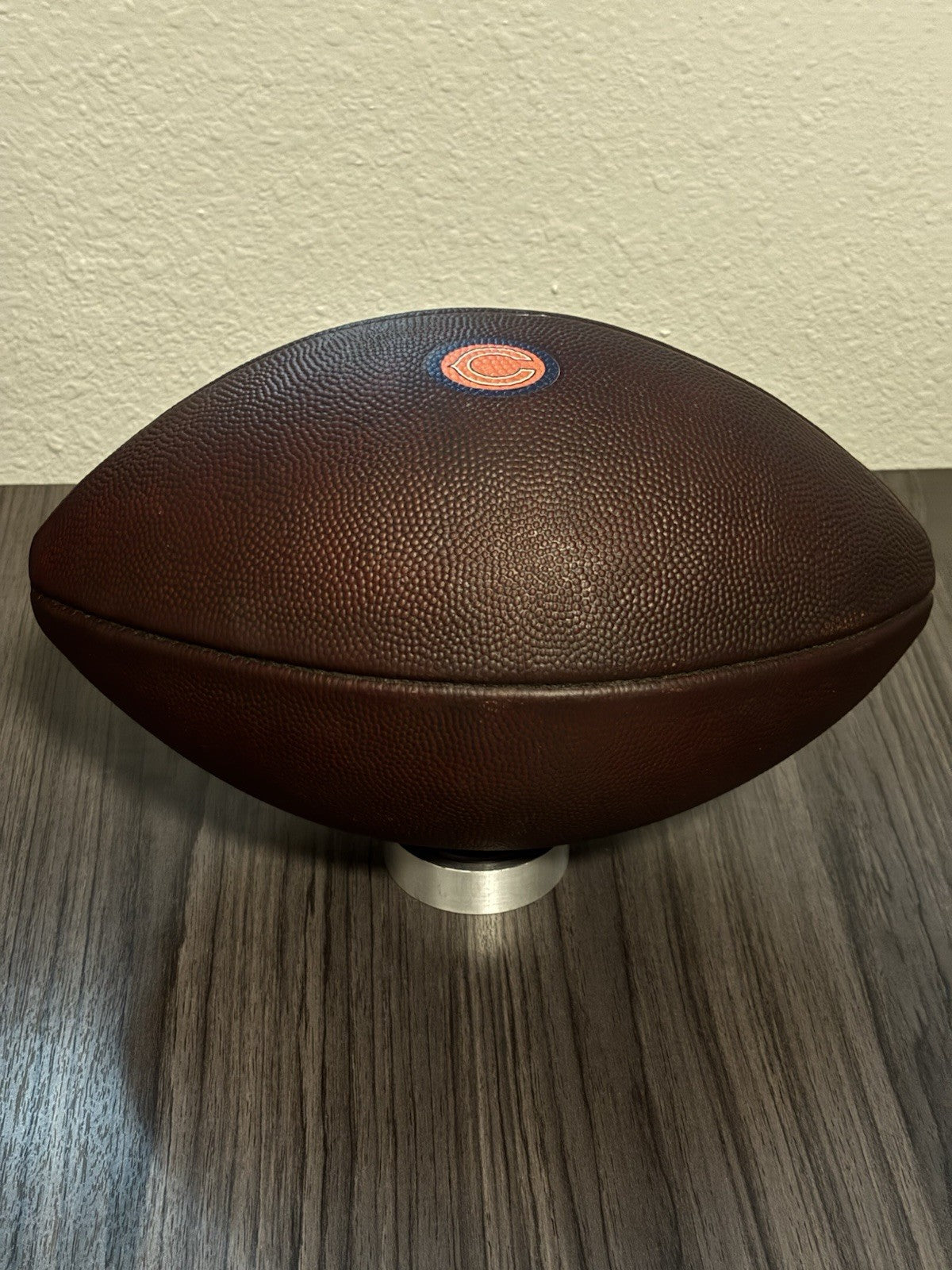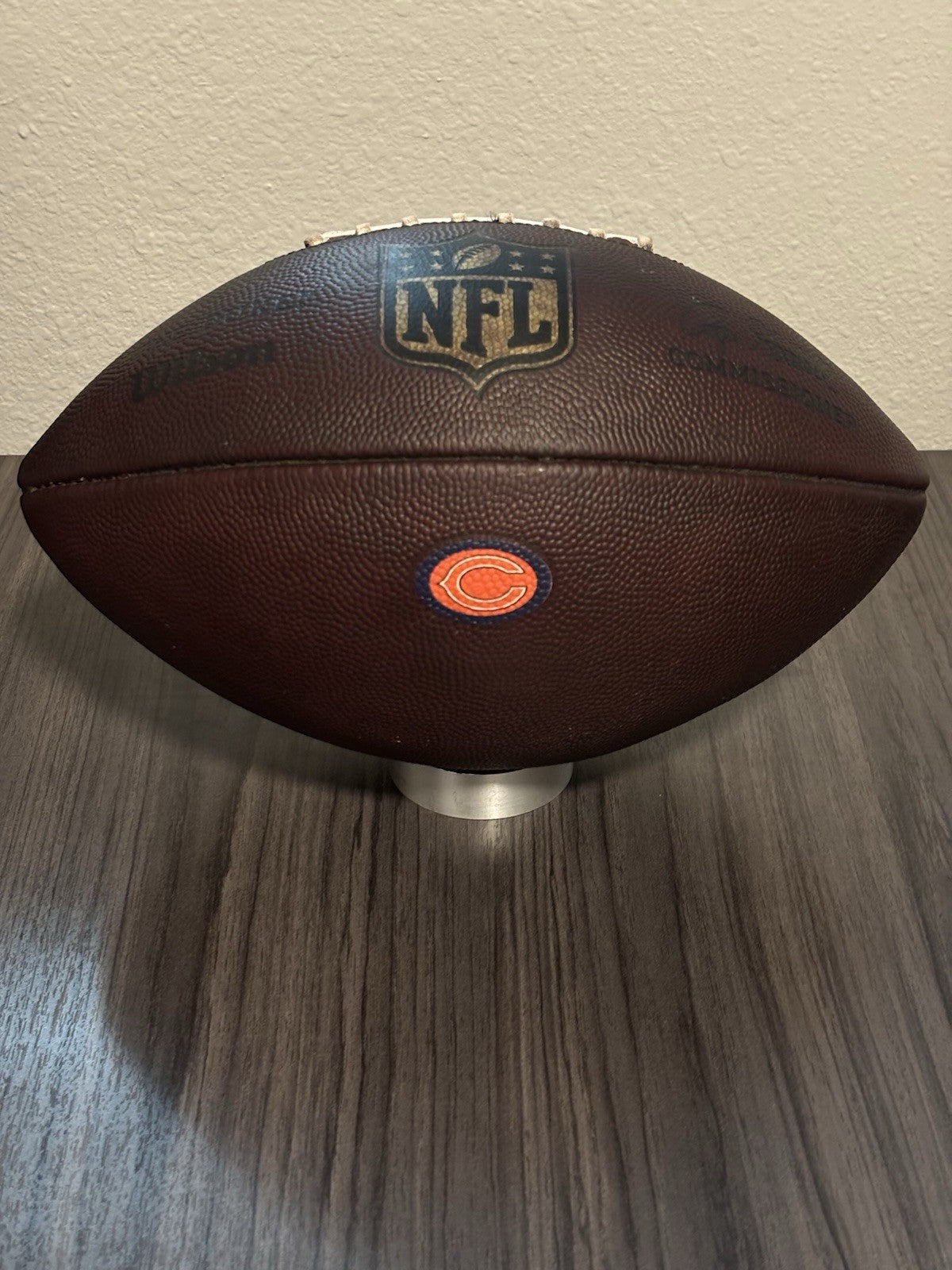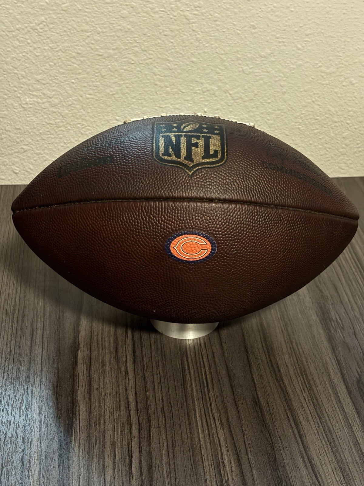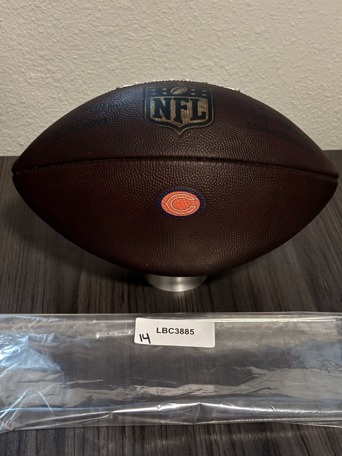 Authentic Chicago Bears Team Issued Wilson The Duke NFL Leather Football that comes fully game prepped. The embossed team foil logo is still very well-intact, along with the white suede lacing and the bladder holds a full complement of air. The ball was just recently fully game prepped by LBC, and the leather panels are now softened, darkened and well-protected for any display shelf, office or even to use on the field.