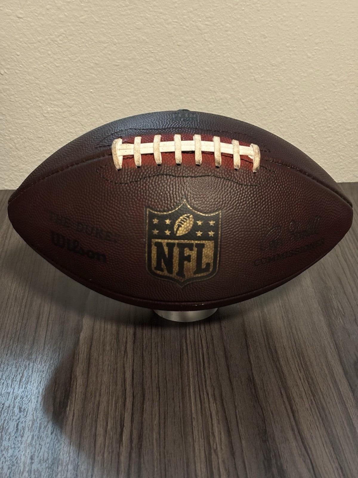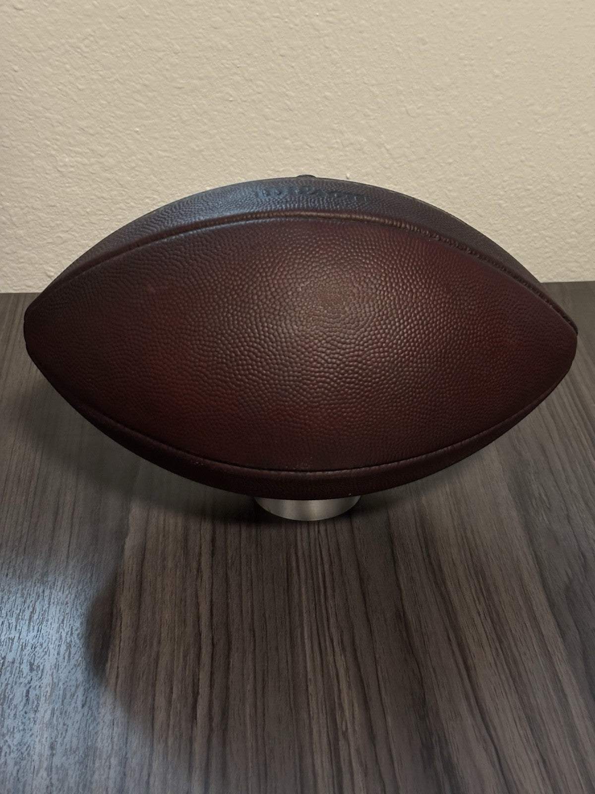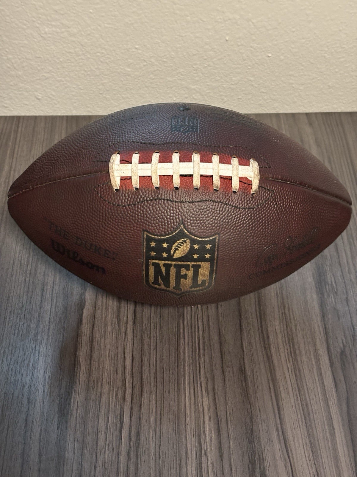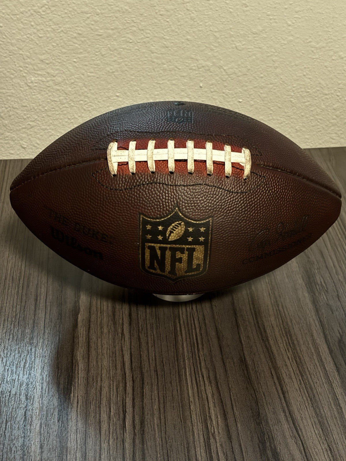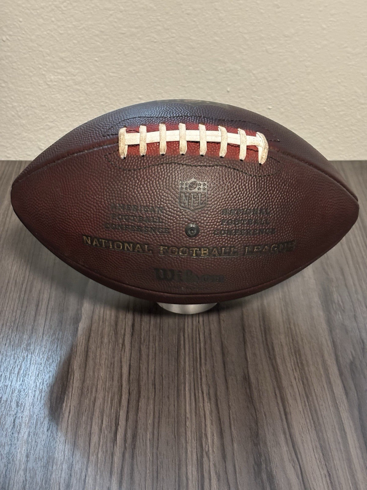 Authentic Chicago Bears Team Issued Wilson The Duke NFL Leather Football that comes fully game prepped. The embossed team foil logo is still very well-intact, along with the white suede lacing and the bladder holds a full complement of air. The ball was just recently fully game prepped by LBC, and the leather panels are now softened, darkened and well-protected for any display shelf, office or even to use on the field.
