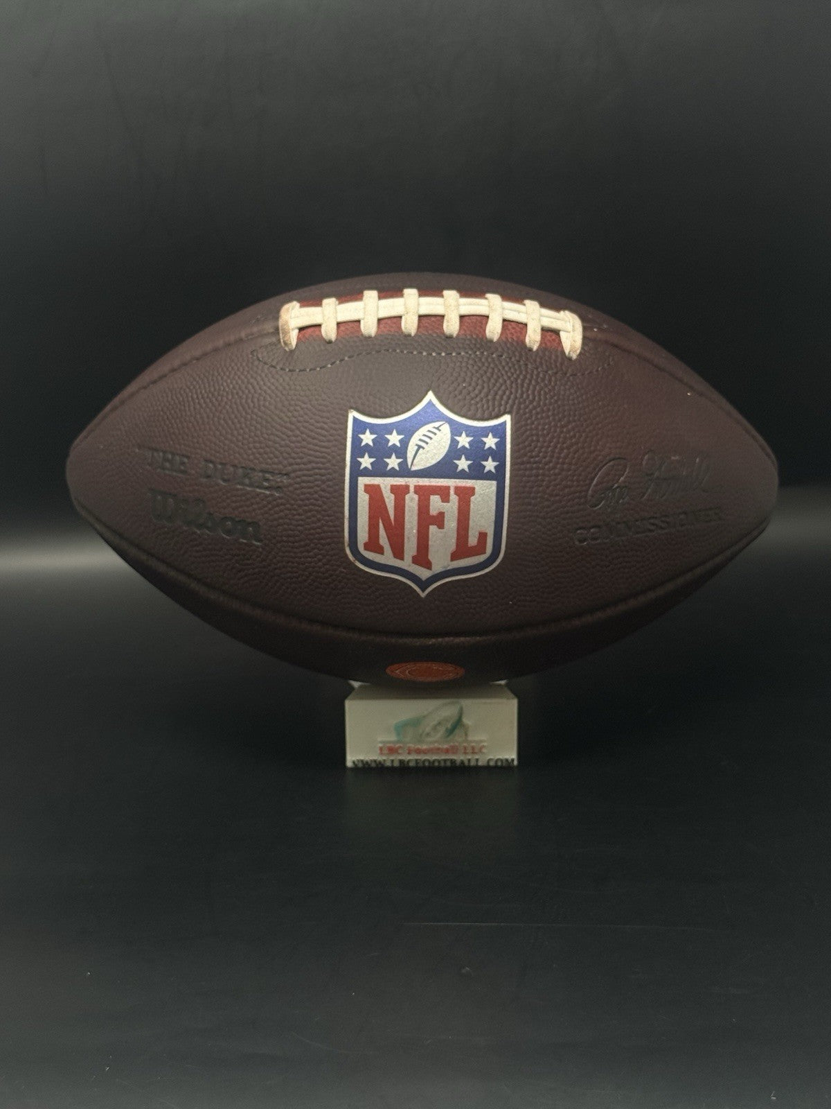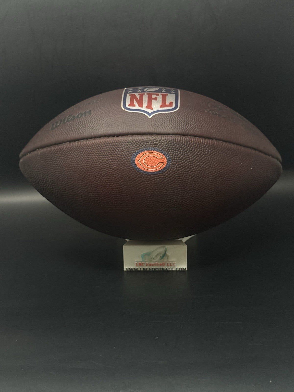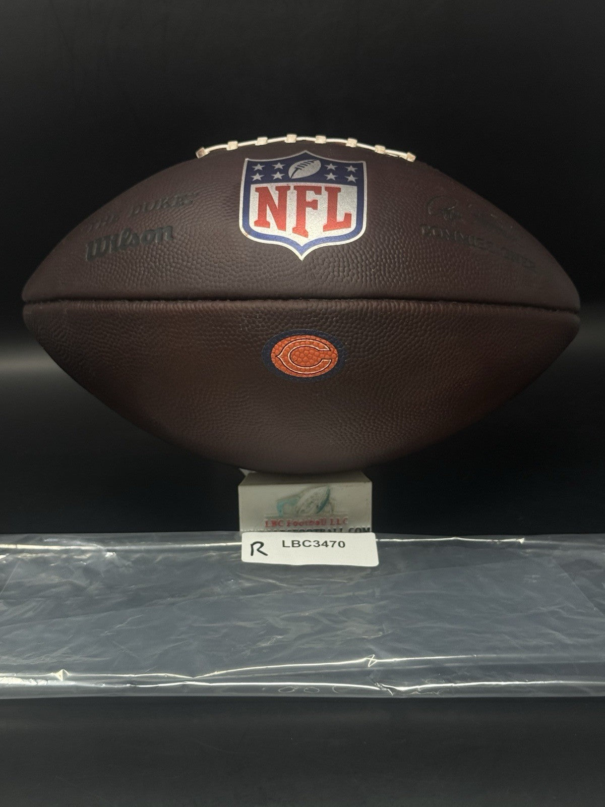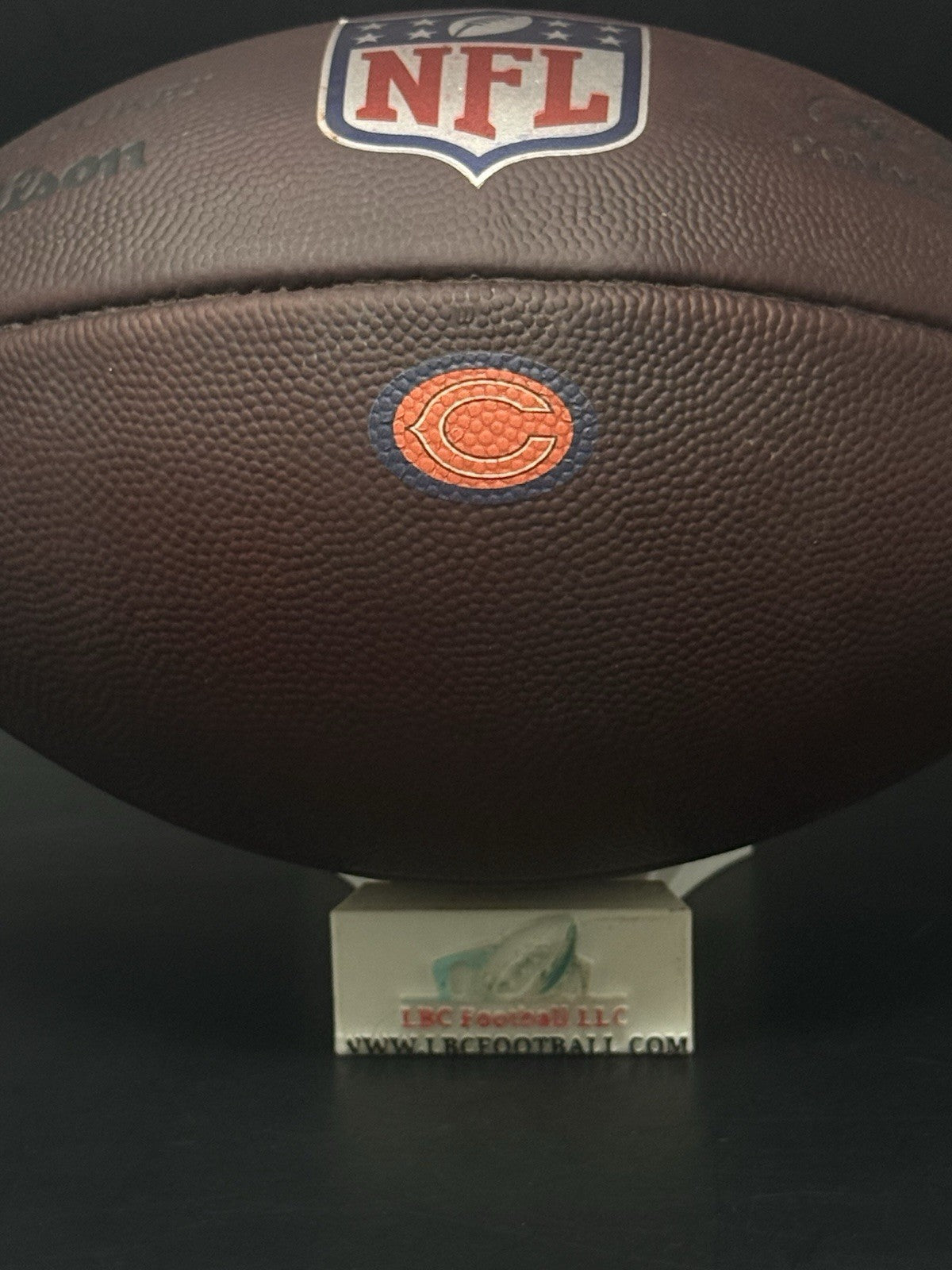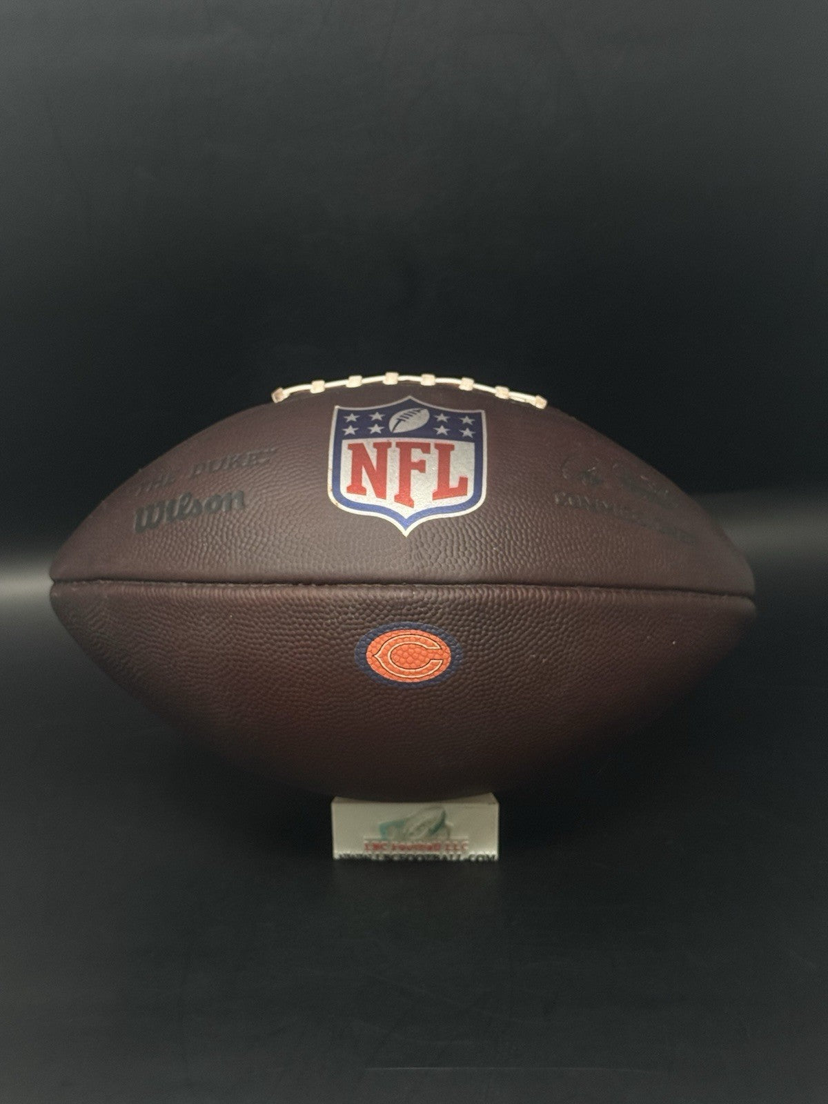 Authentic Chicago Bears Team Issued Wilson The Duke NFL Leather Football that comes fully game prepped. The embossed team foil logo is still very well-intact, along with the white suede lacing and the bladder holds a full complement of air. The ball was just recently fully game prepped by LBC, and the leather panels are now softened, darkened and well-protected for any display shelf, office or even to use on the field.
