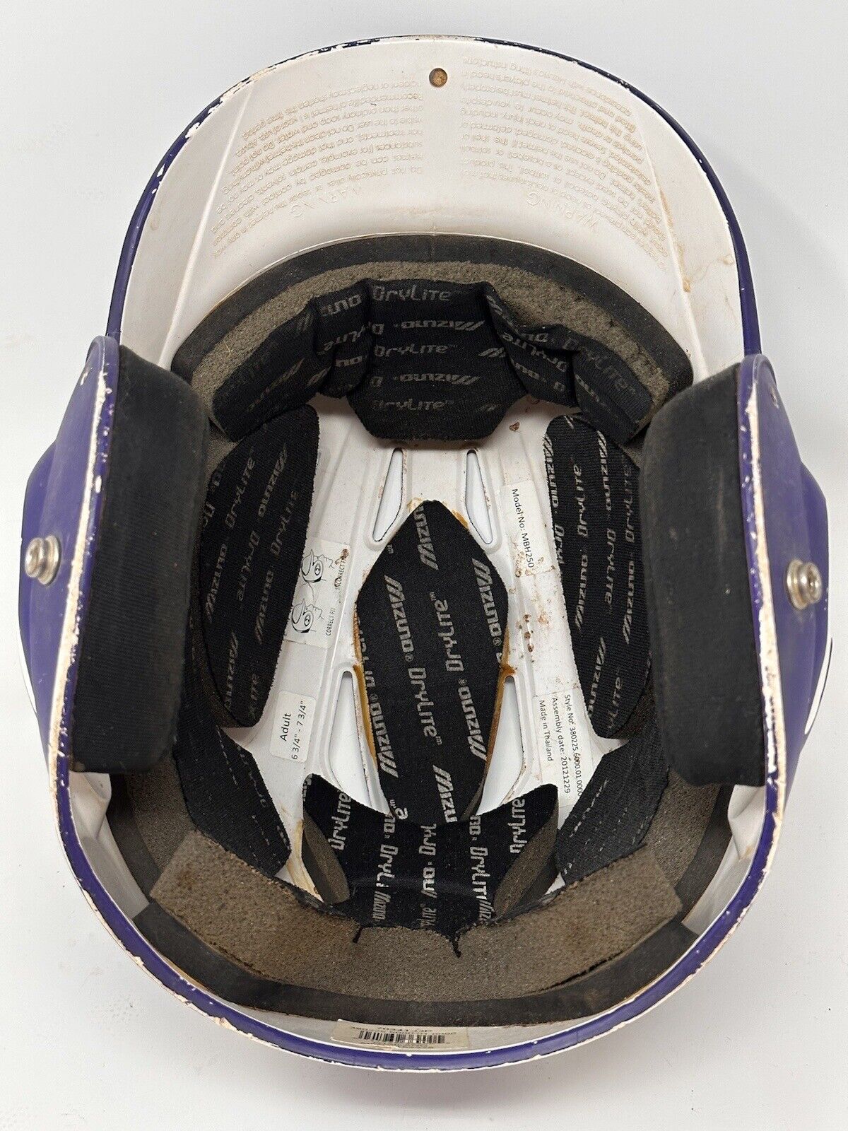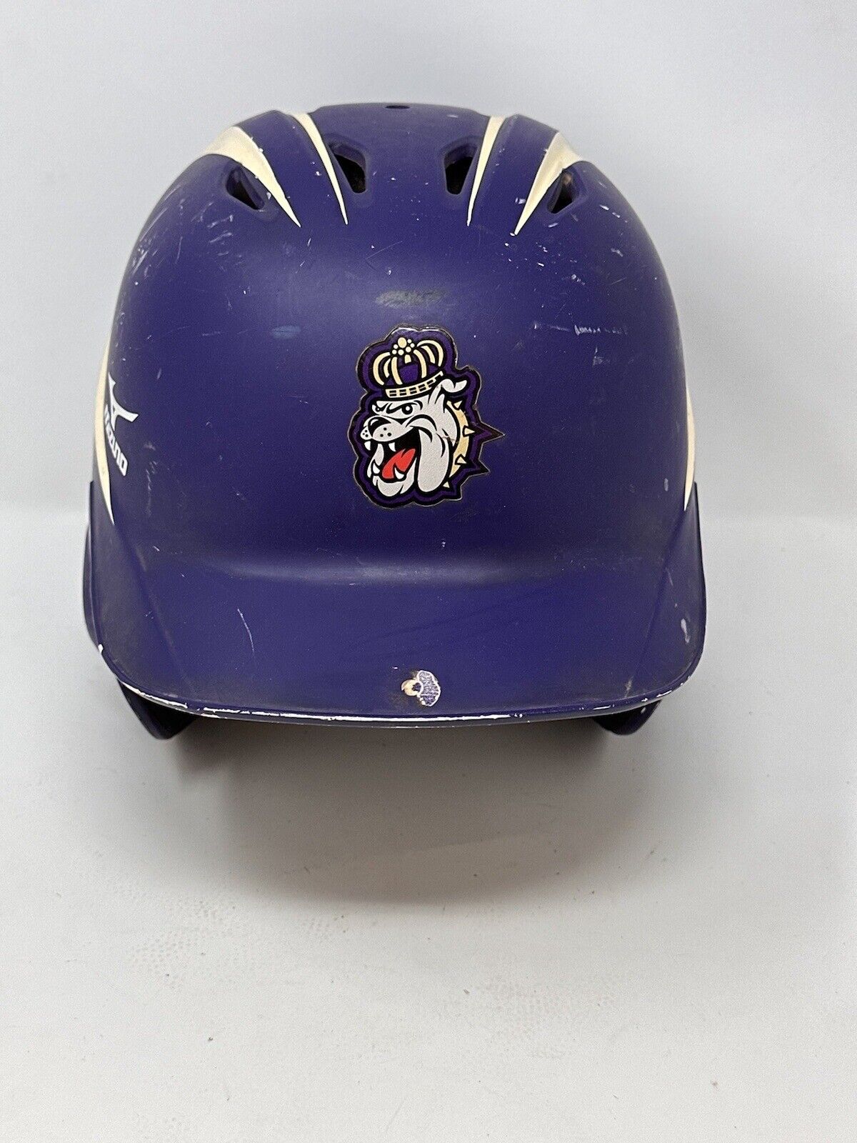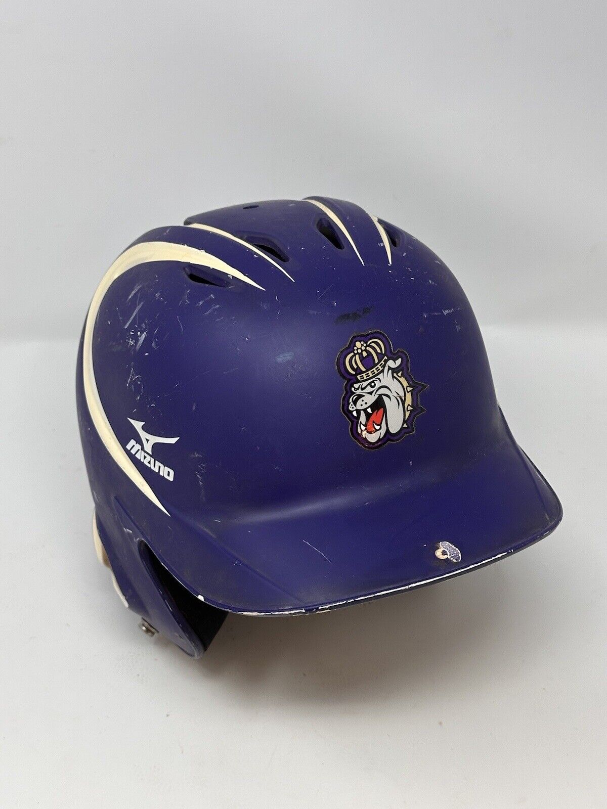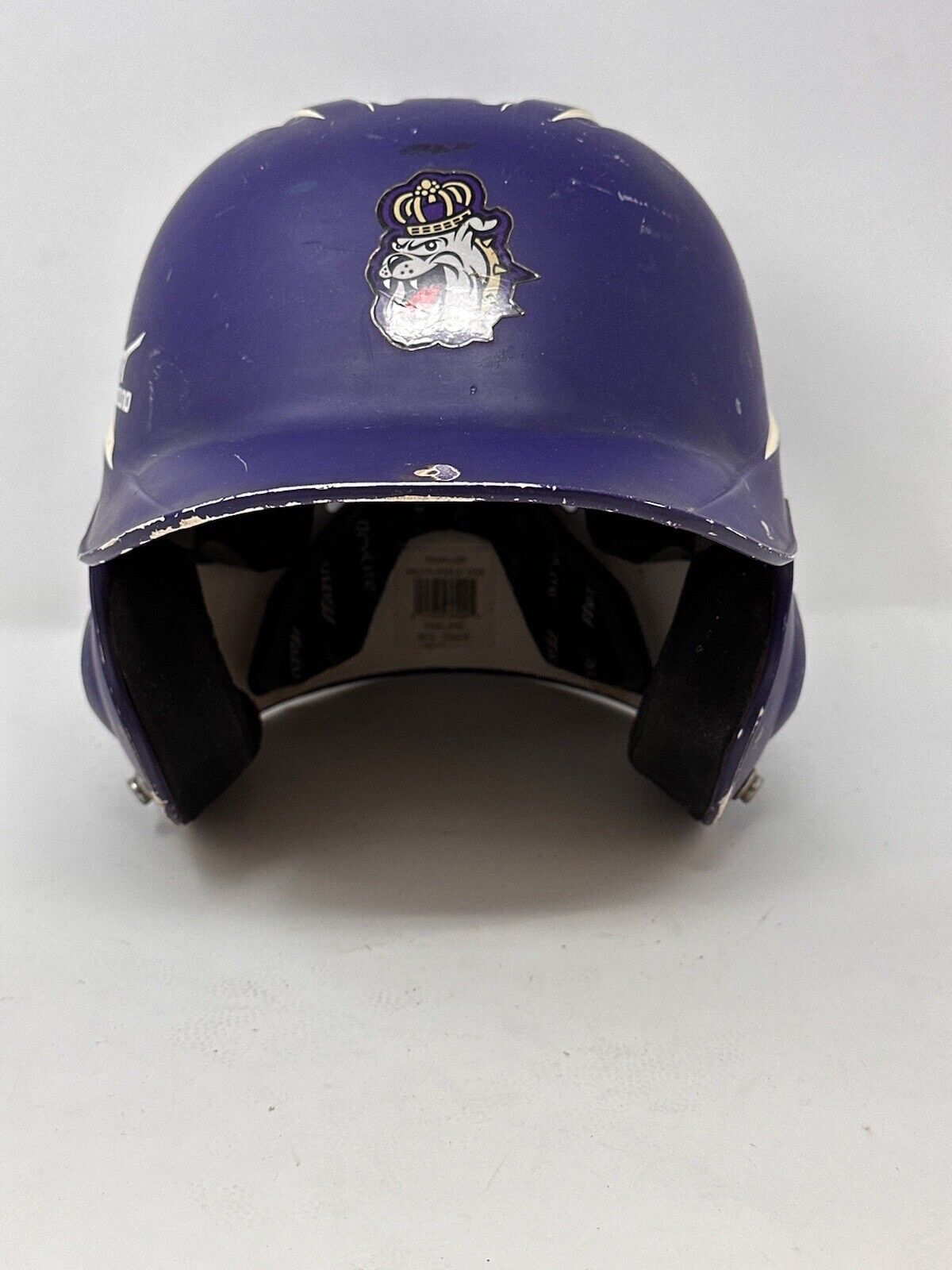 This game-worn Mizuno softball batting helmet was used by a player from James Madison University's Dukes team during an NCAA game. The helmet features the team's official logo and is officially licensed. The batting helmet was used in game and practices and shows great evidence of usage and is still in good condition. This is a must-have for any James Madison Dukes fan or collector of NCAA game used memorabilia.