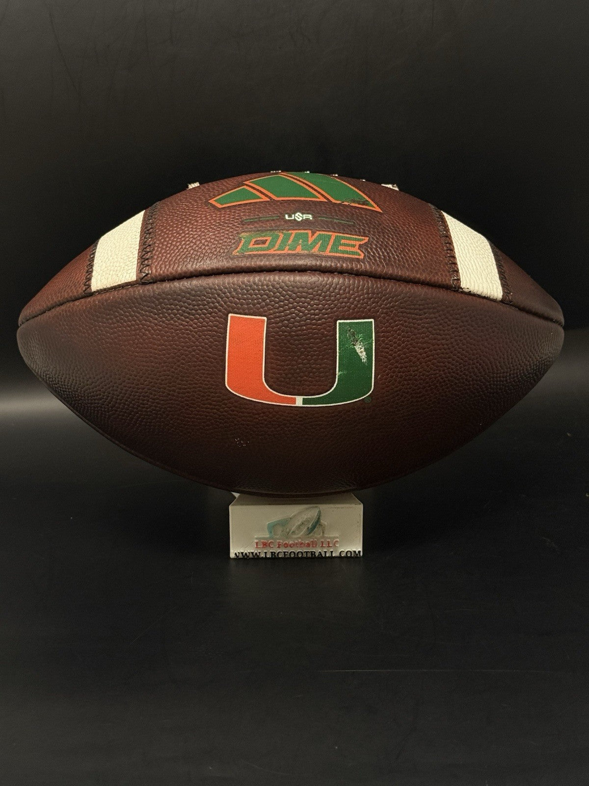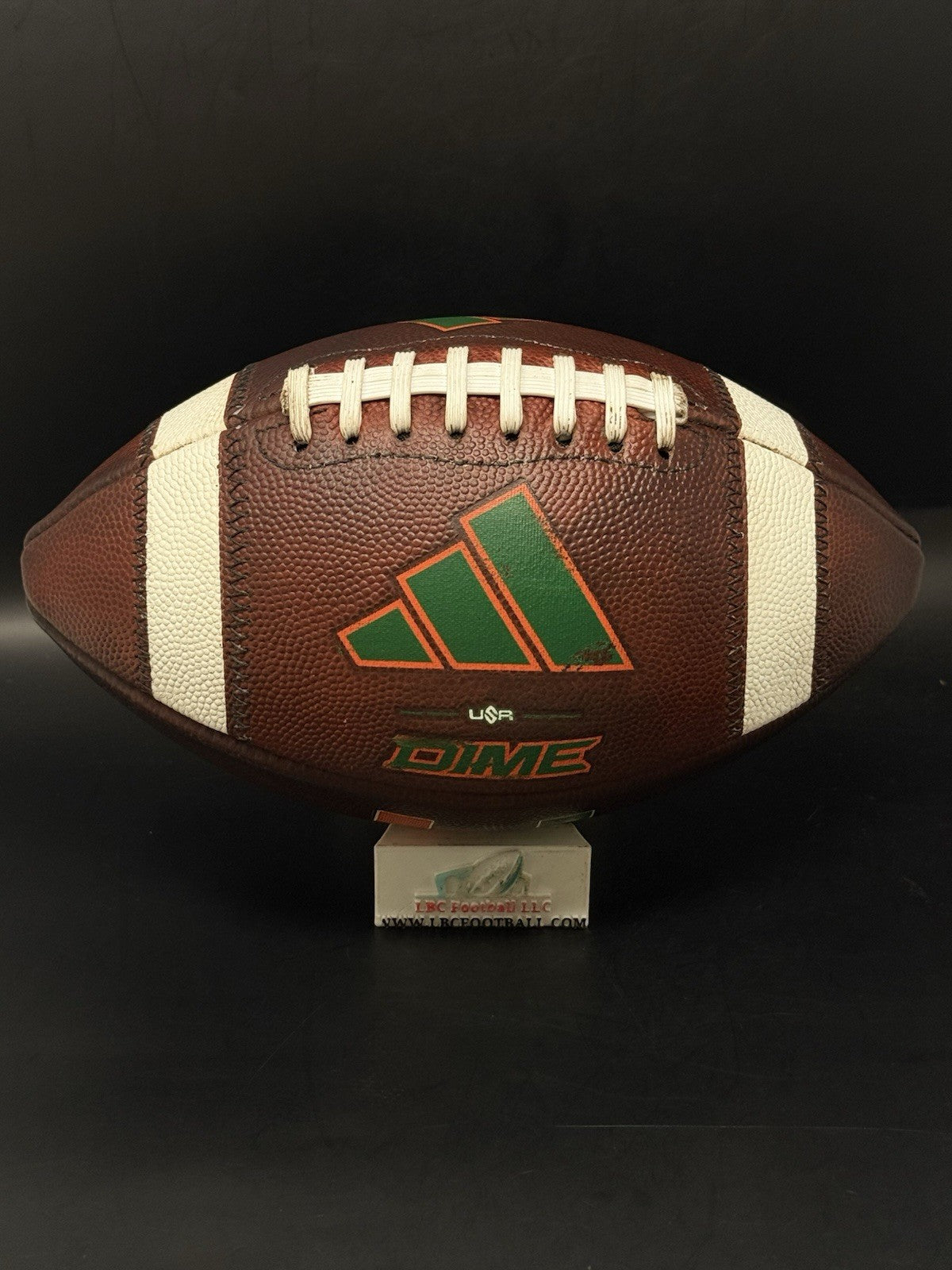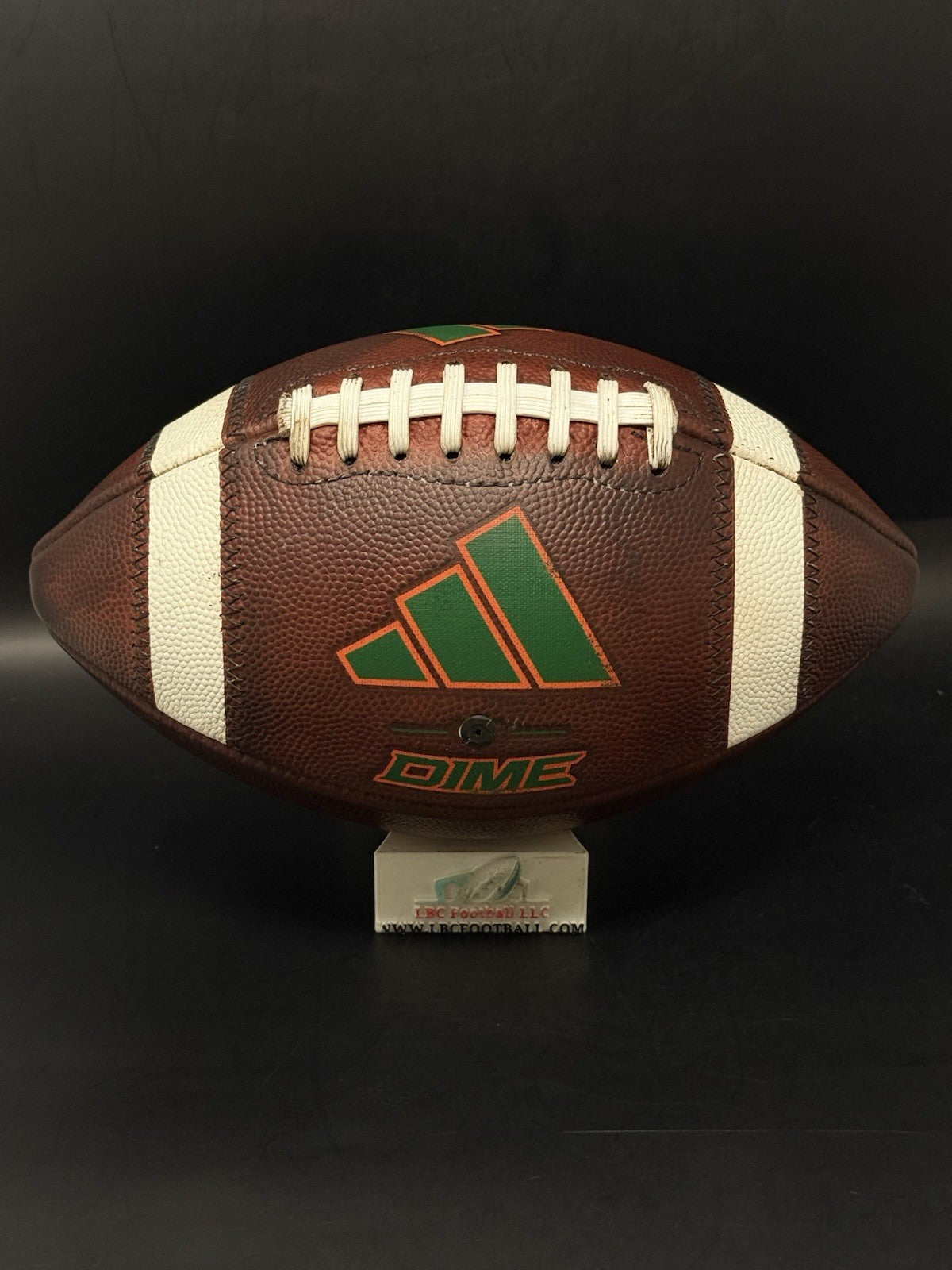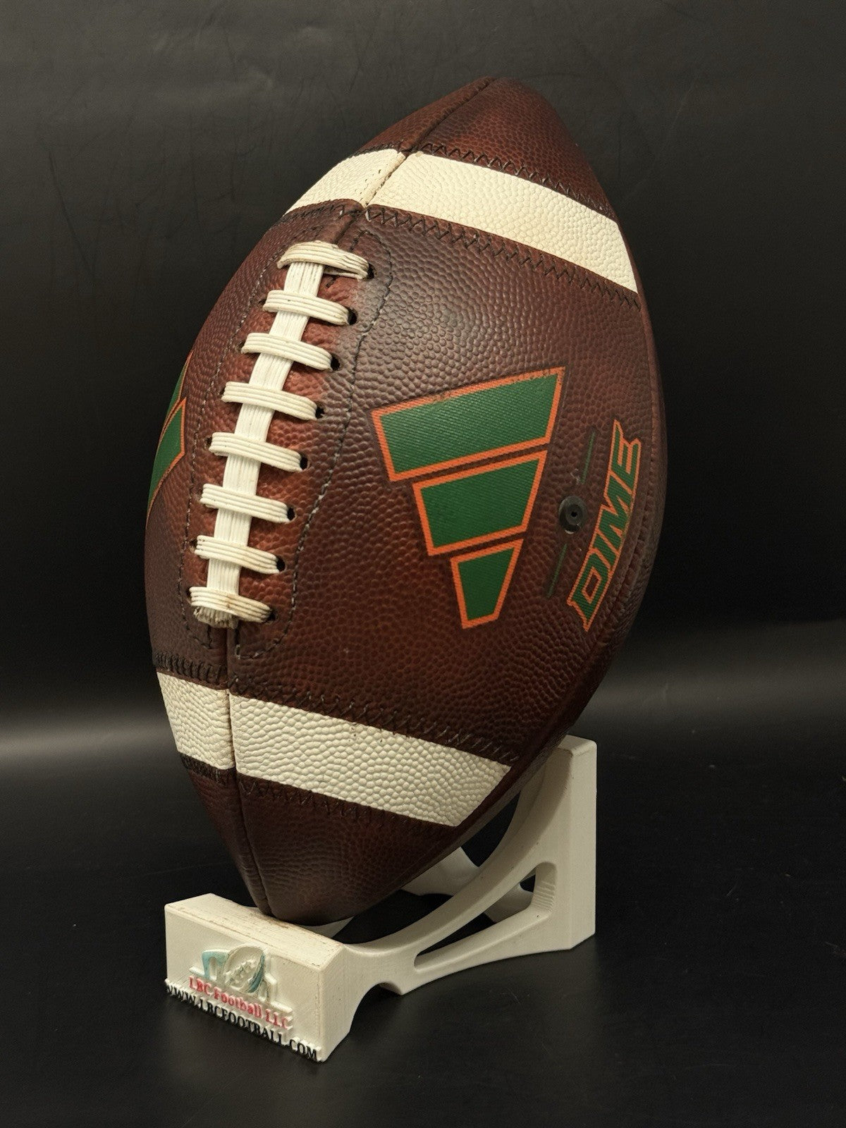 This Miami Hurricanes Game Issued Adidas Dime NCAA Football comes just recently fully game prepped. Although the ball doesn't show any evidence of prior usage, some of the areas on the logos are scuffed. However, the prep on the leather panels will make this ball an excellent training or even a display football for any Canes' fan.