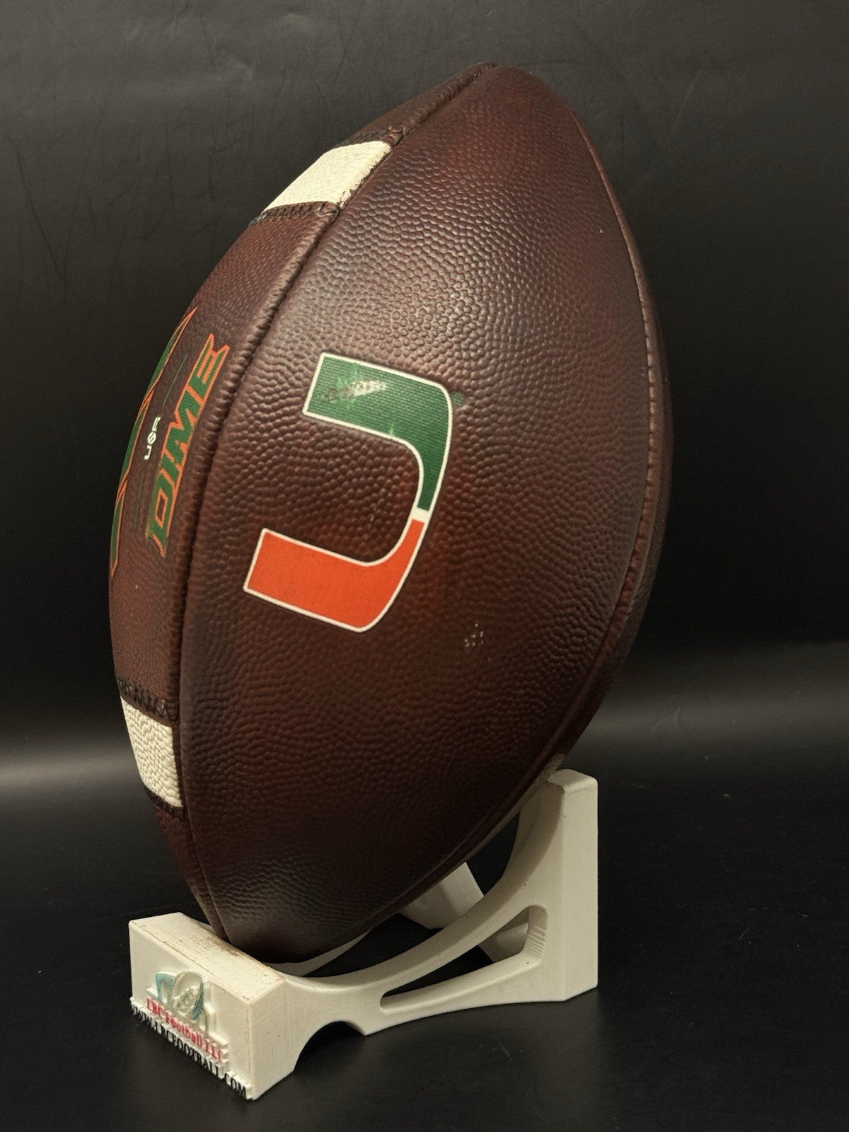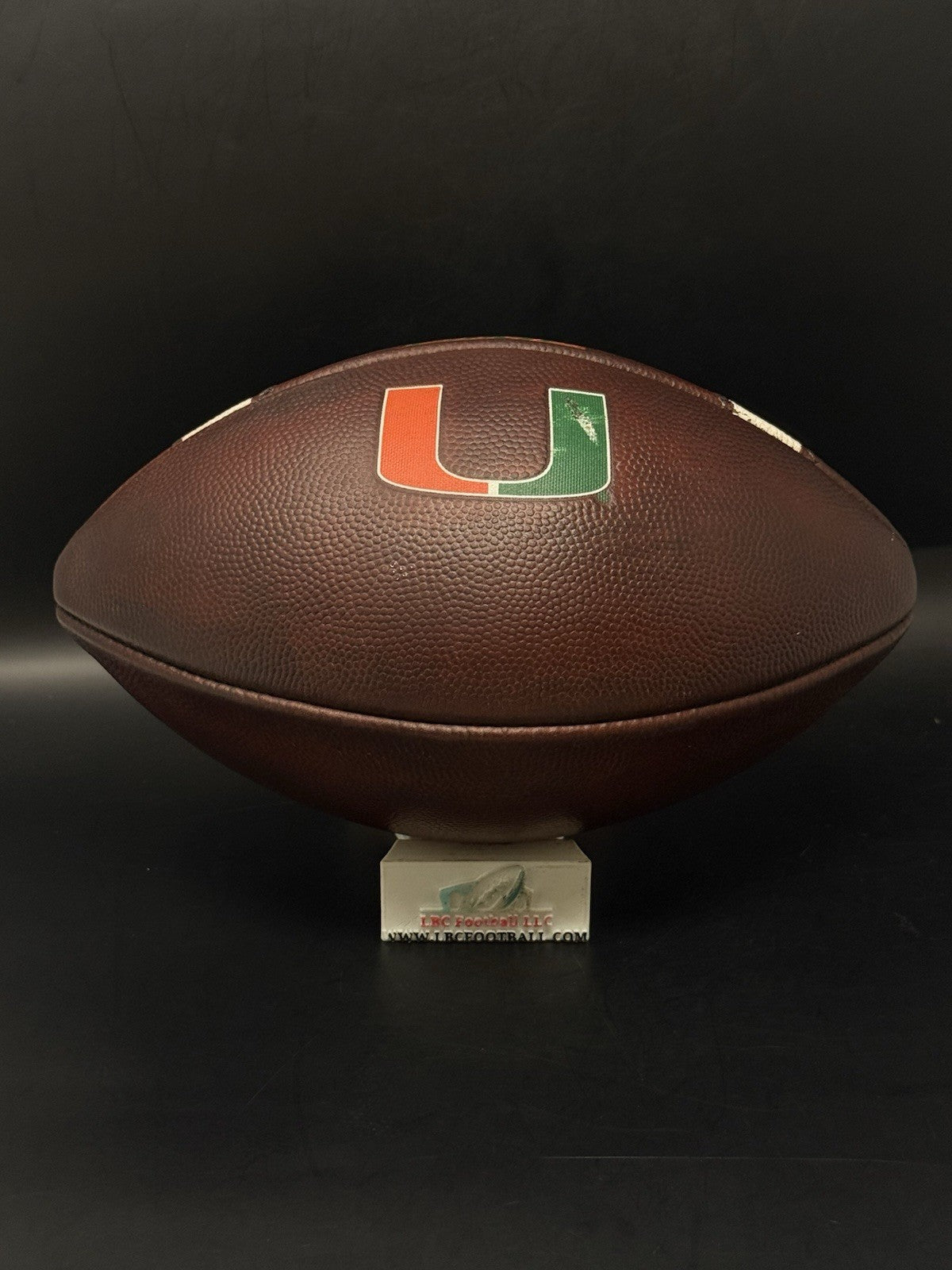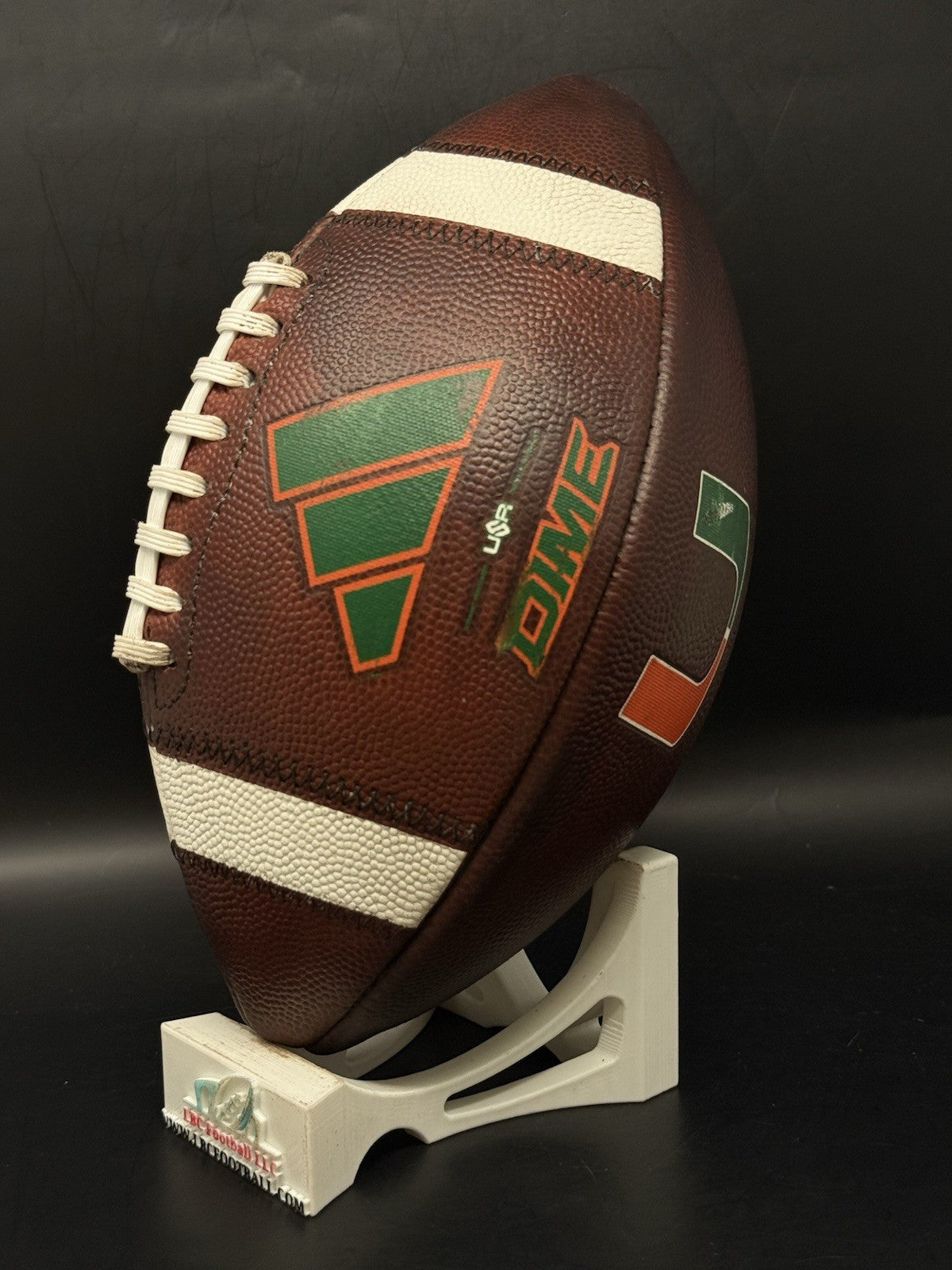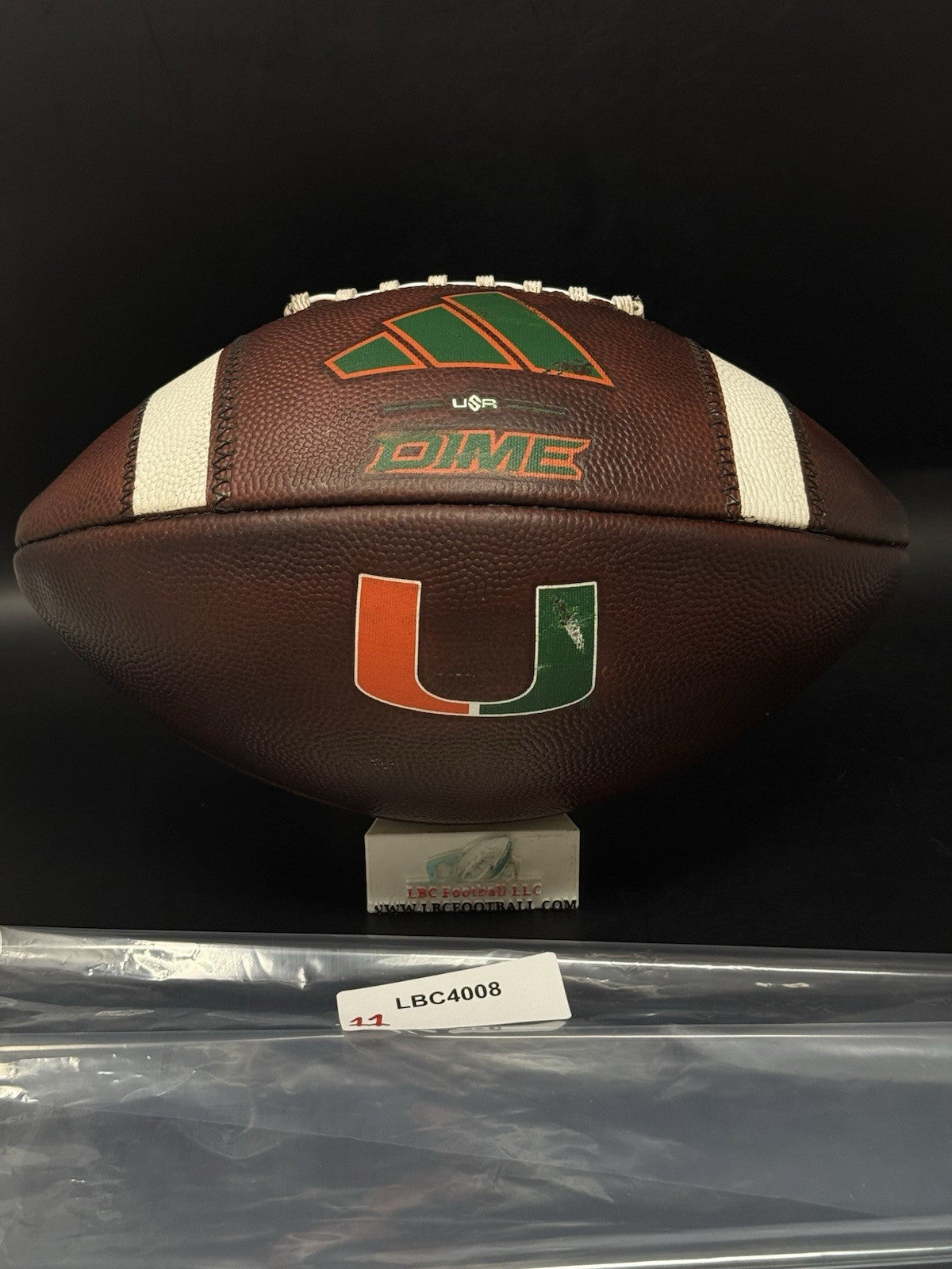 This Miami Hurricanes Game Issued Adidas Dime NCAA Football comes just recently fully game prepped. Although the ball doesn't show any evidence of prior usage, some of the areas on the logos are scuffed. However, the prep on the leather panels will make this ball an excellent training or even a display football for any Canes' fan.
