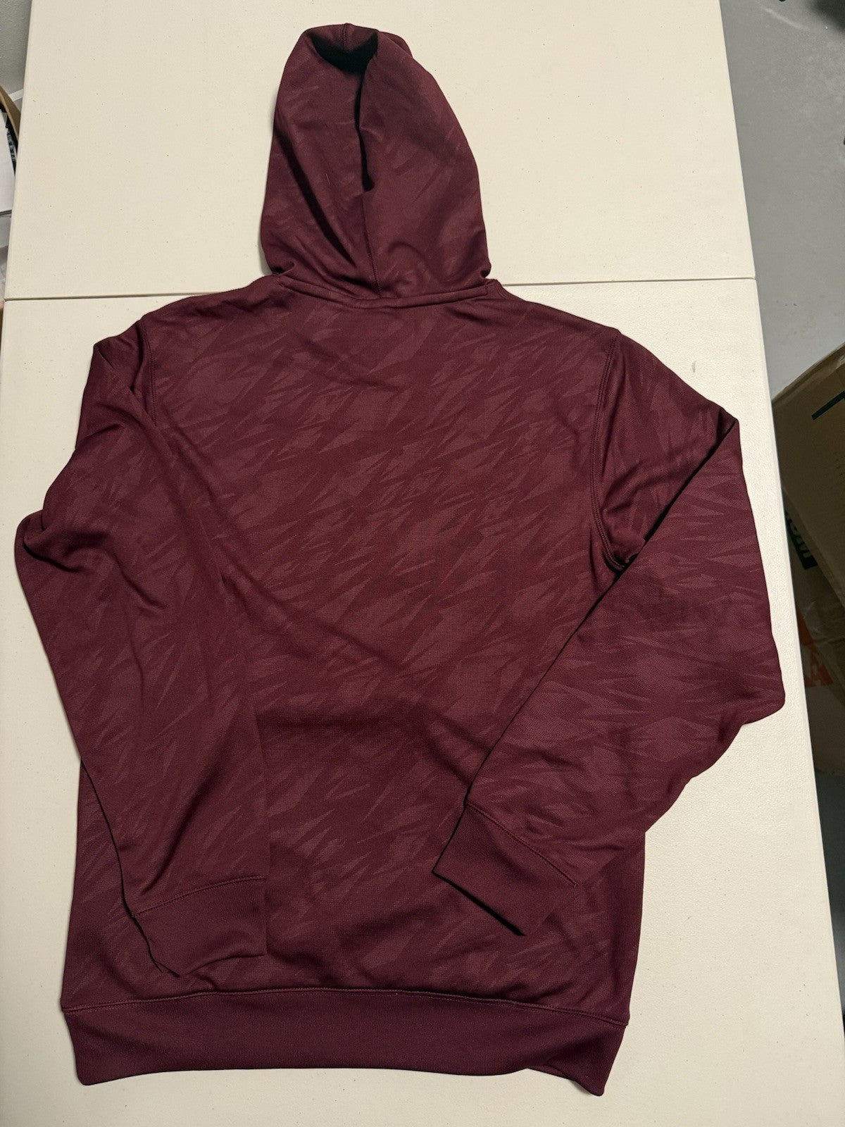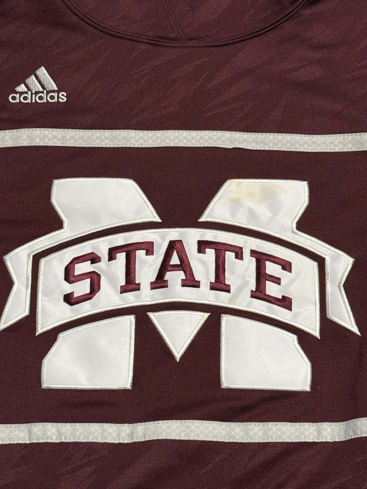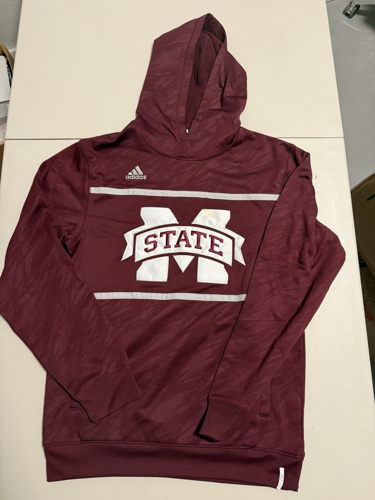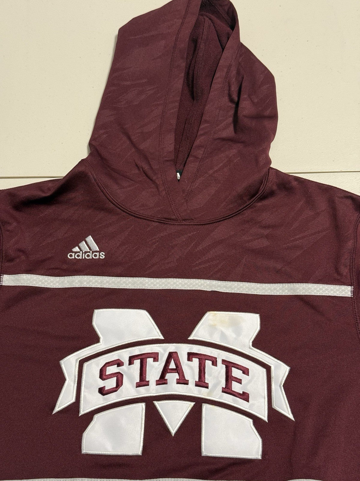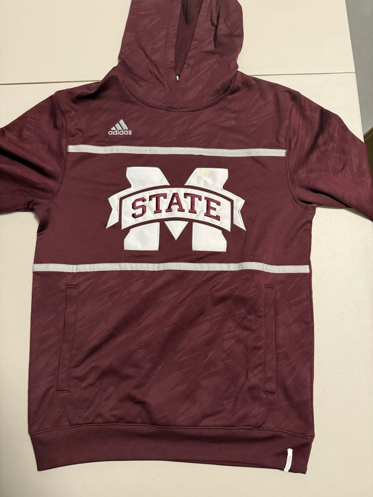 The product is a Mississippi State Bulldogs Football Team Issued Adidas Hoodie in size small. This officially licensed hoodie is made from 100% polyester material and features the team's colors of red. It is designed for men and is suitable for the regular season. The hoodie is a great way for fans to show their support for the Mississippi State Bulldogs football team while staying warm and comfortable during games or casual outings.