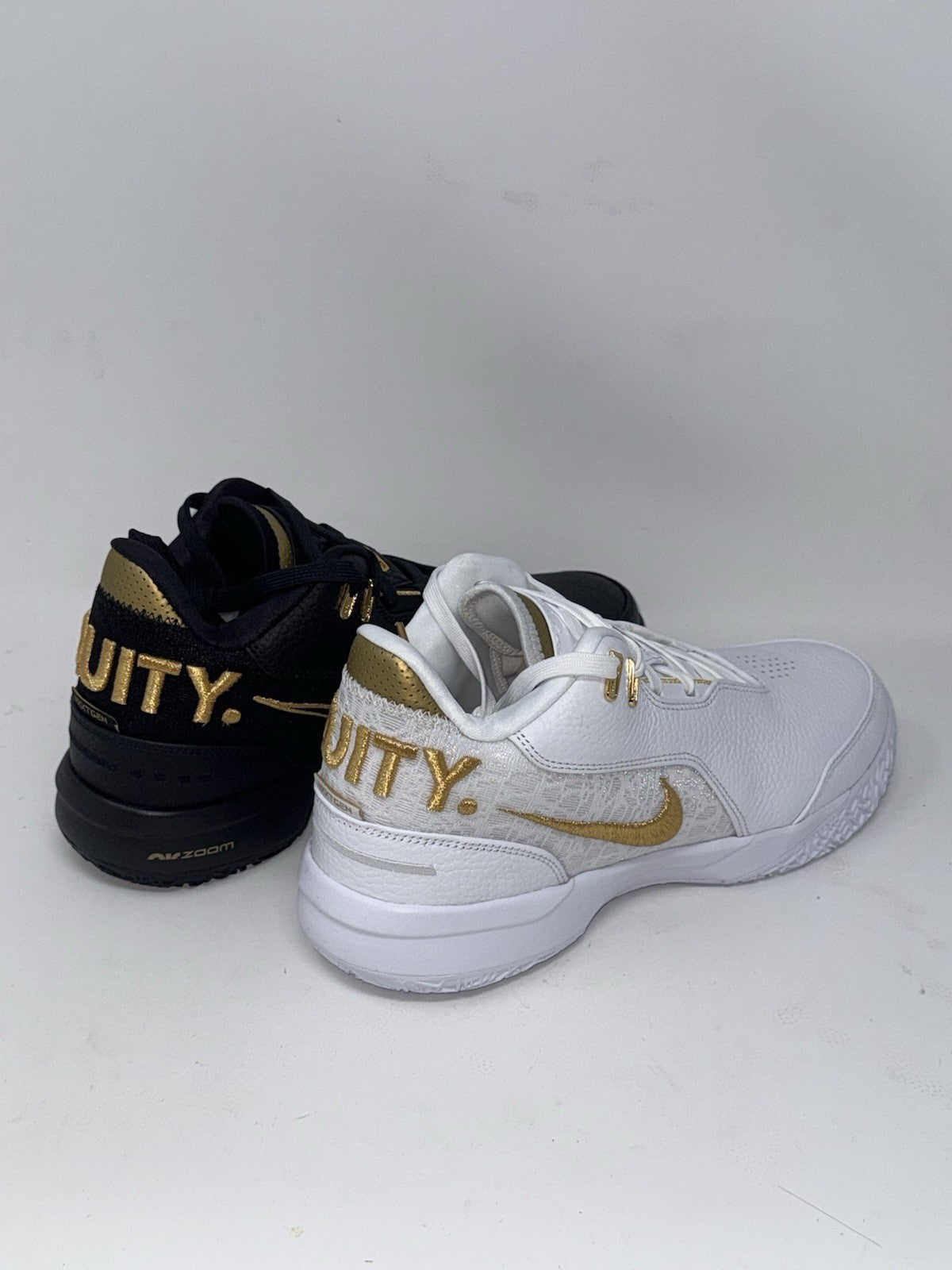 The Nike Men's Zoom LeBron NXXT Gen AMPD "Equity" Basketball Shoes in white colorway are a stylish and high-performance athletic option for men. Featuring a low top design, leather upper material, and a variety of activity options including walking, basketball, and running, these shoes are perfect for the active lifestyle. With a US shoe size of 9.5, UK size 8.5, and EU size 43, these sneakers are part of the Nike LeBron product line and highlight the brand's commitment to quality and innovation in sports footwear.