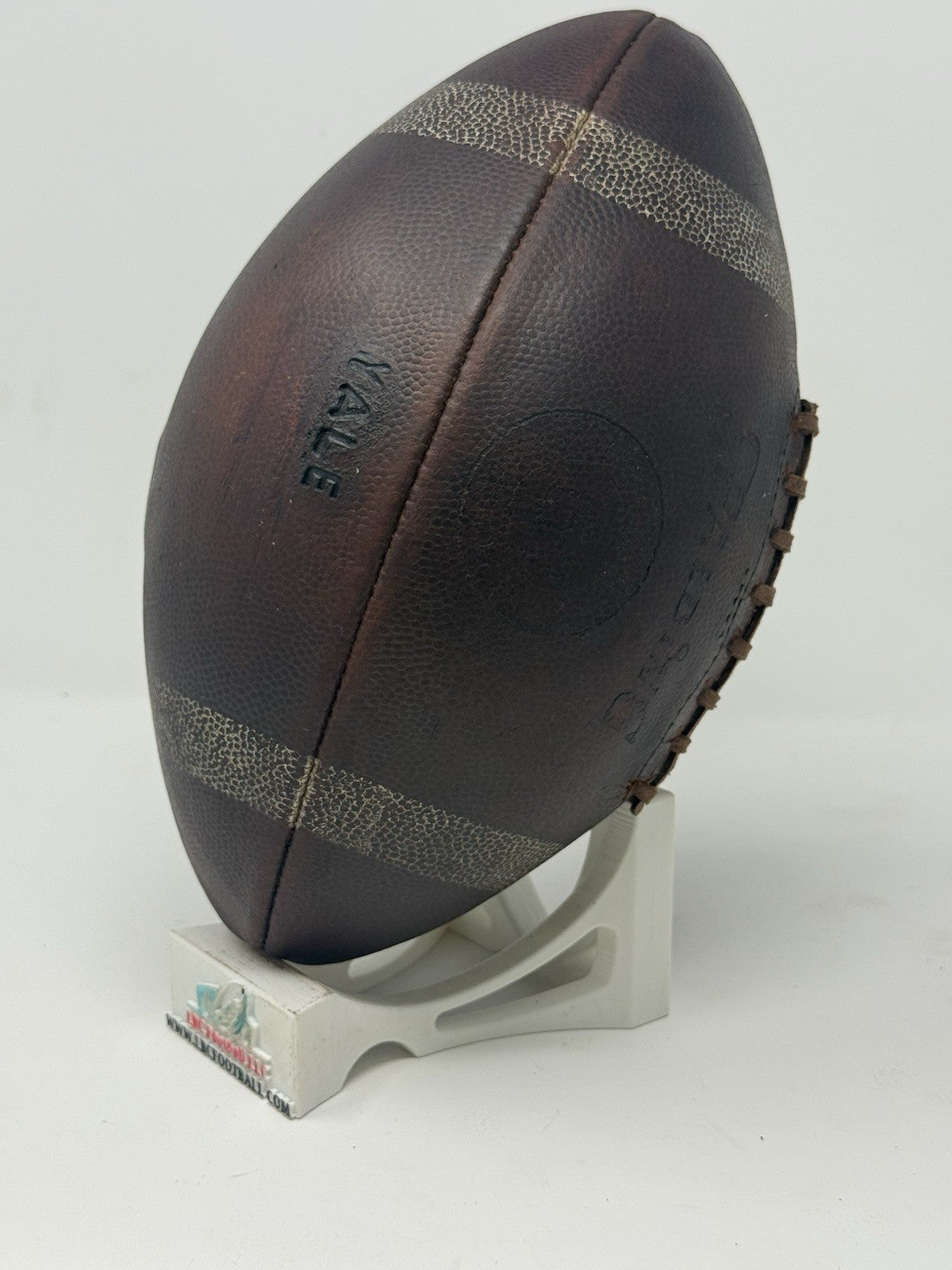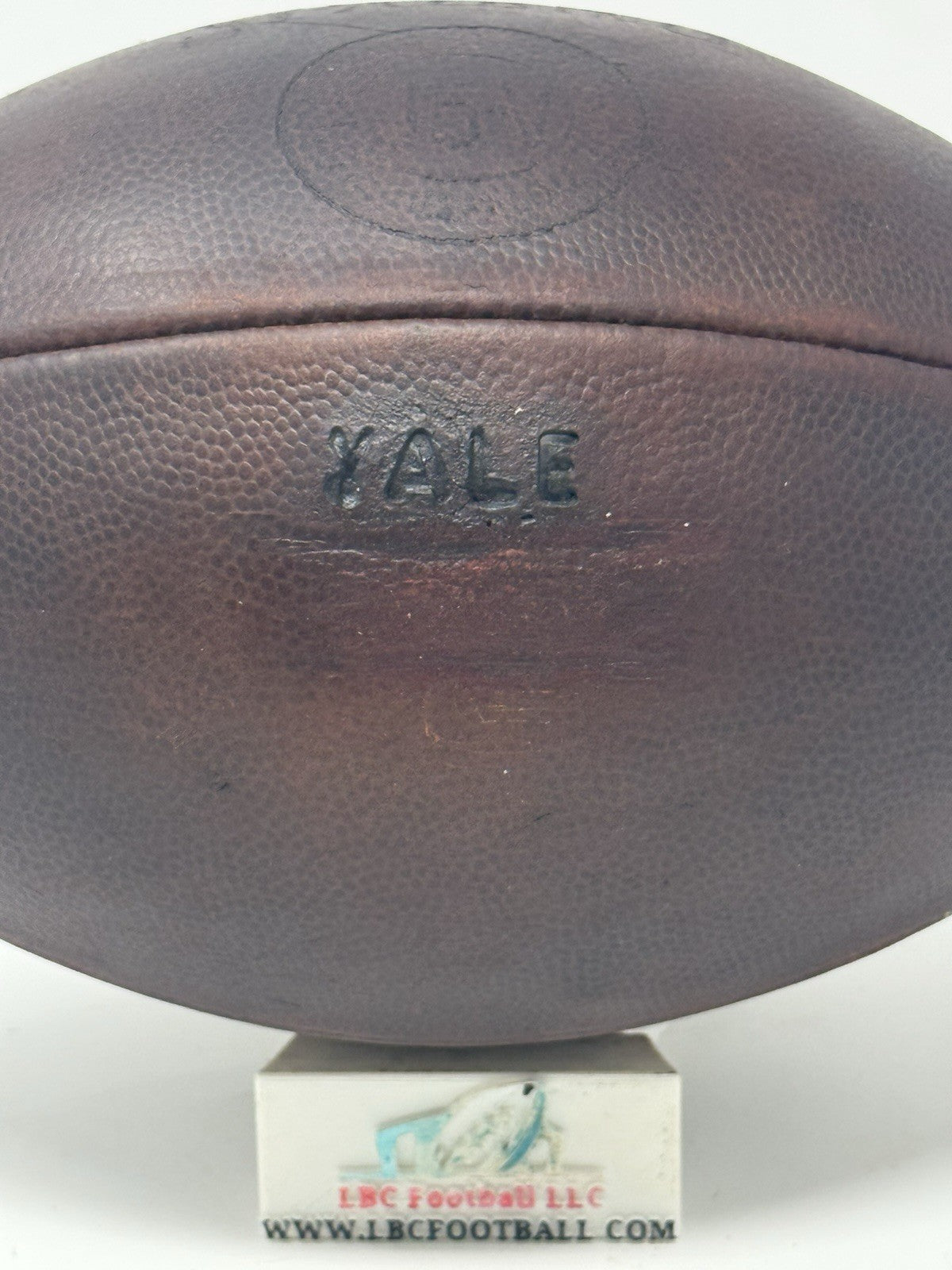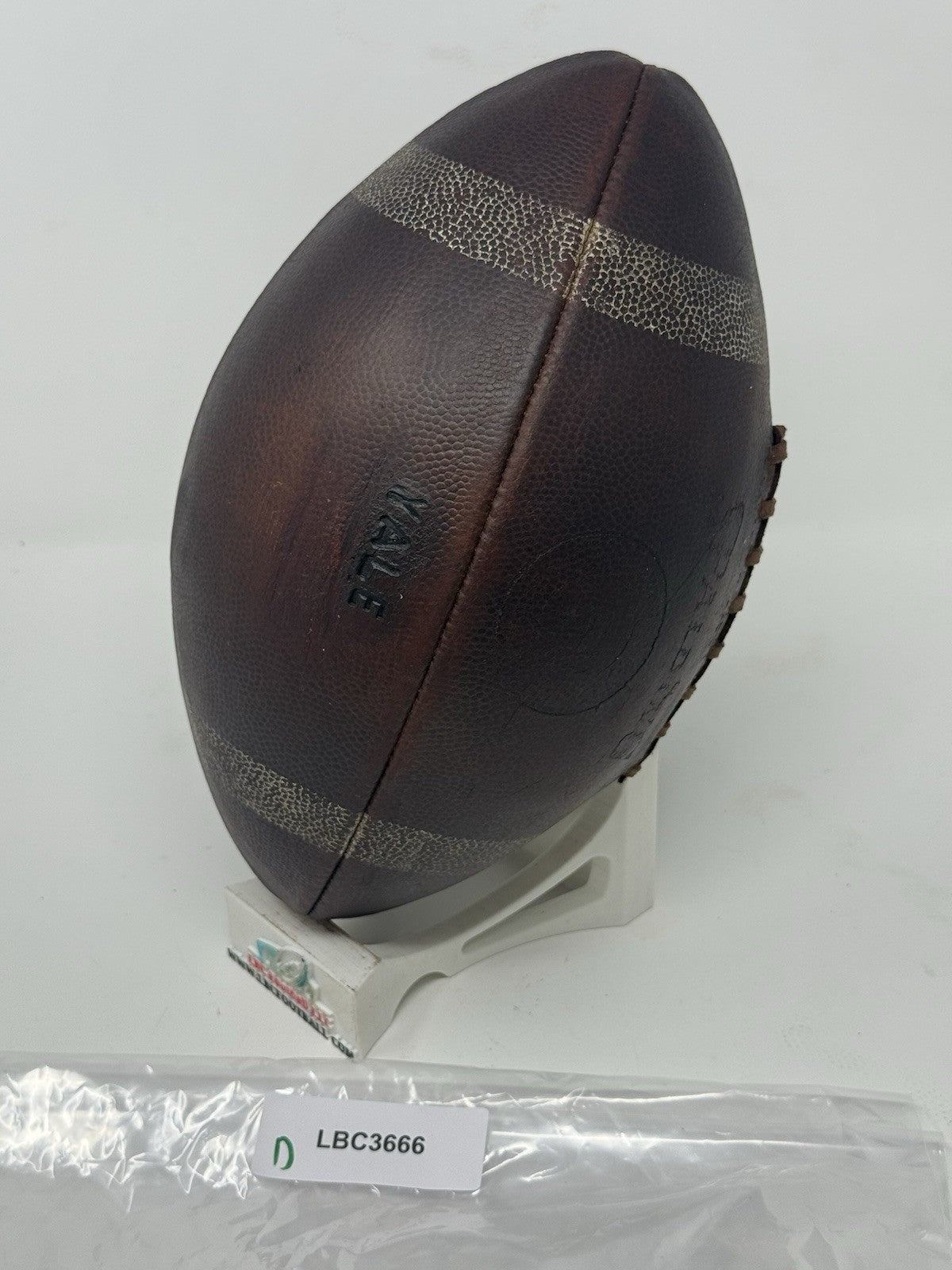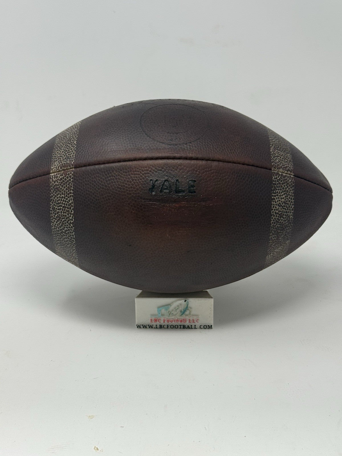 Very rare and unique Yale game ball from several decades ago (exact date unknown but likely 60's or 70's era). The original lacing has been replaced with its current brown suede style. The bladder holds a decent amount of air but due to the age of the ball it doesn't hold the full 13psi (but enough to keep the ball fully formed). The "Yale" logo comes branded on the panel. Perfect for display in any sports collection or office.
