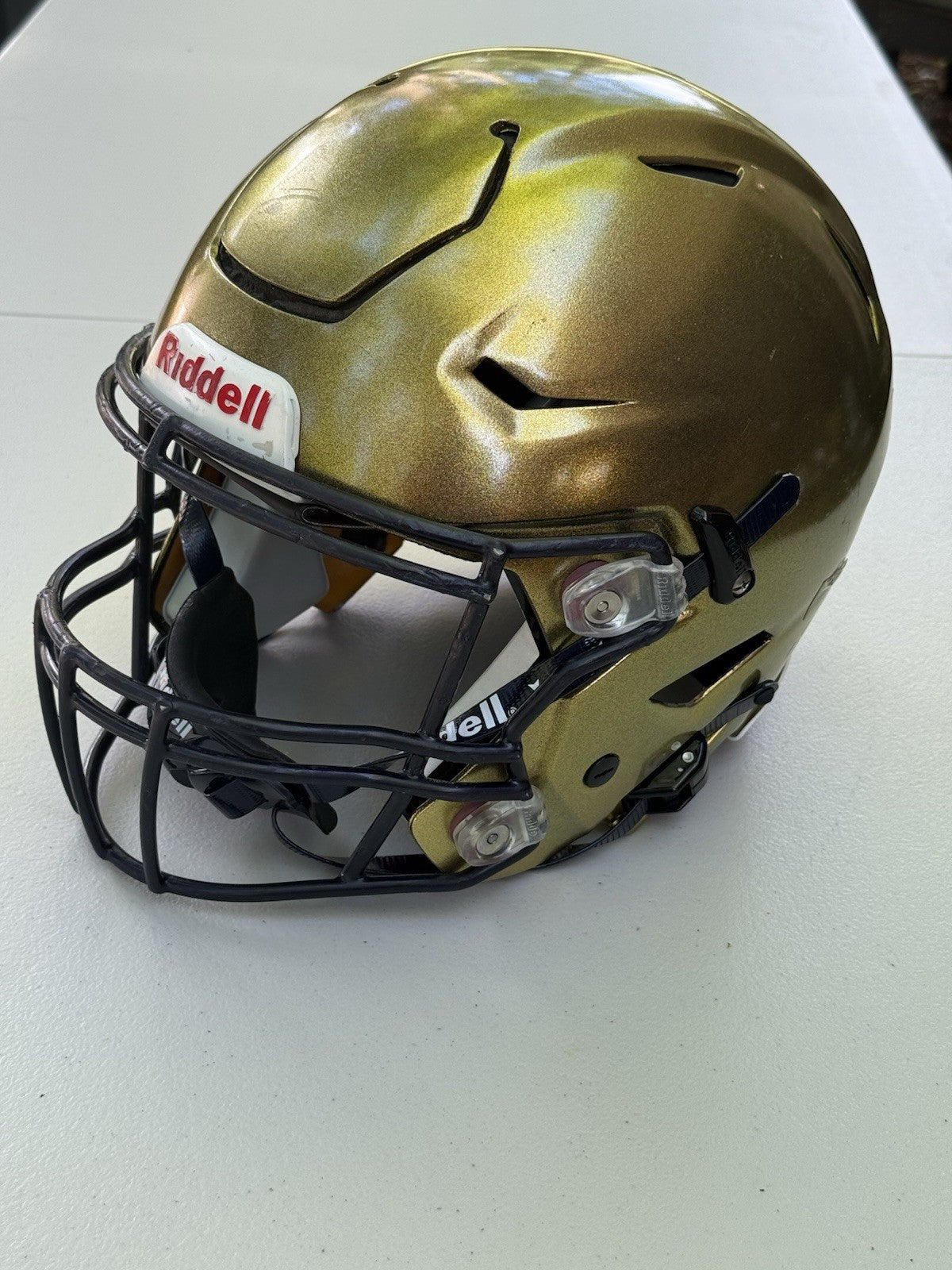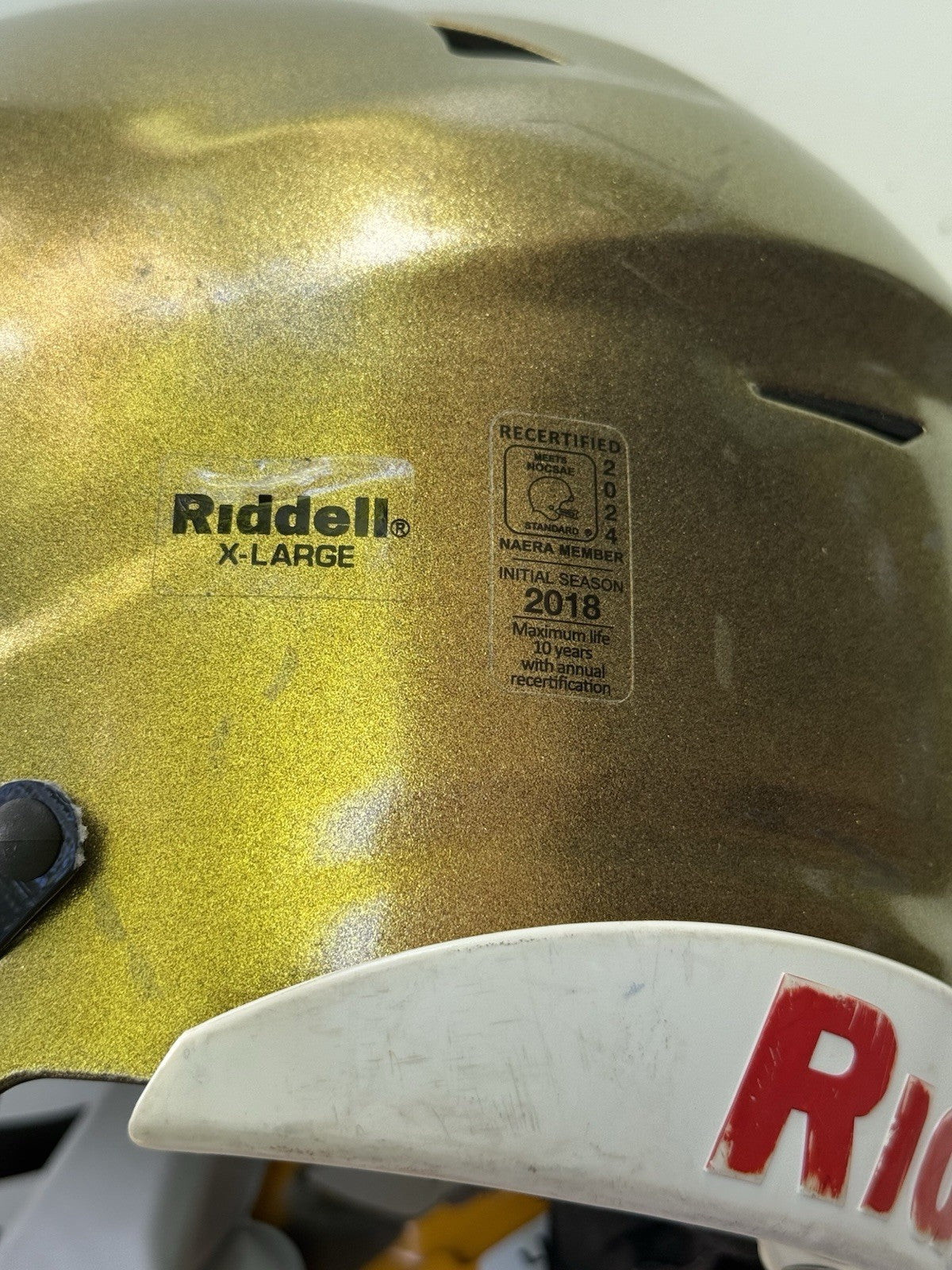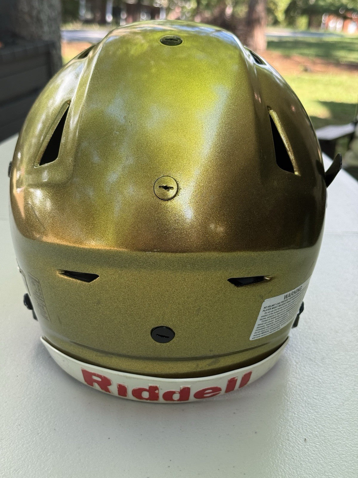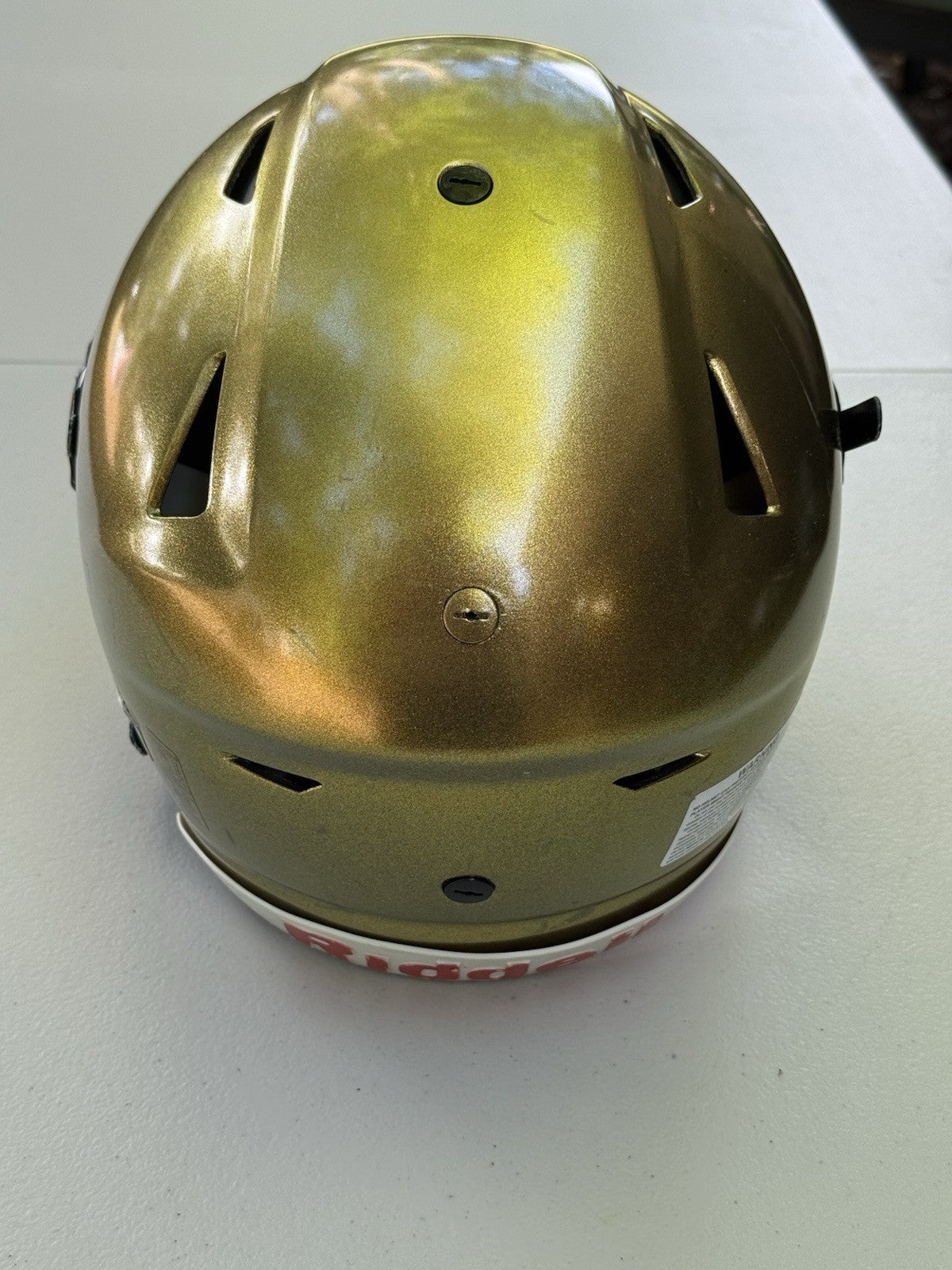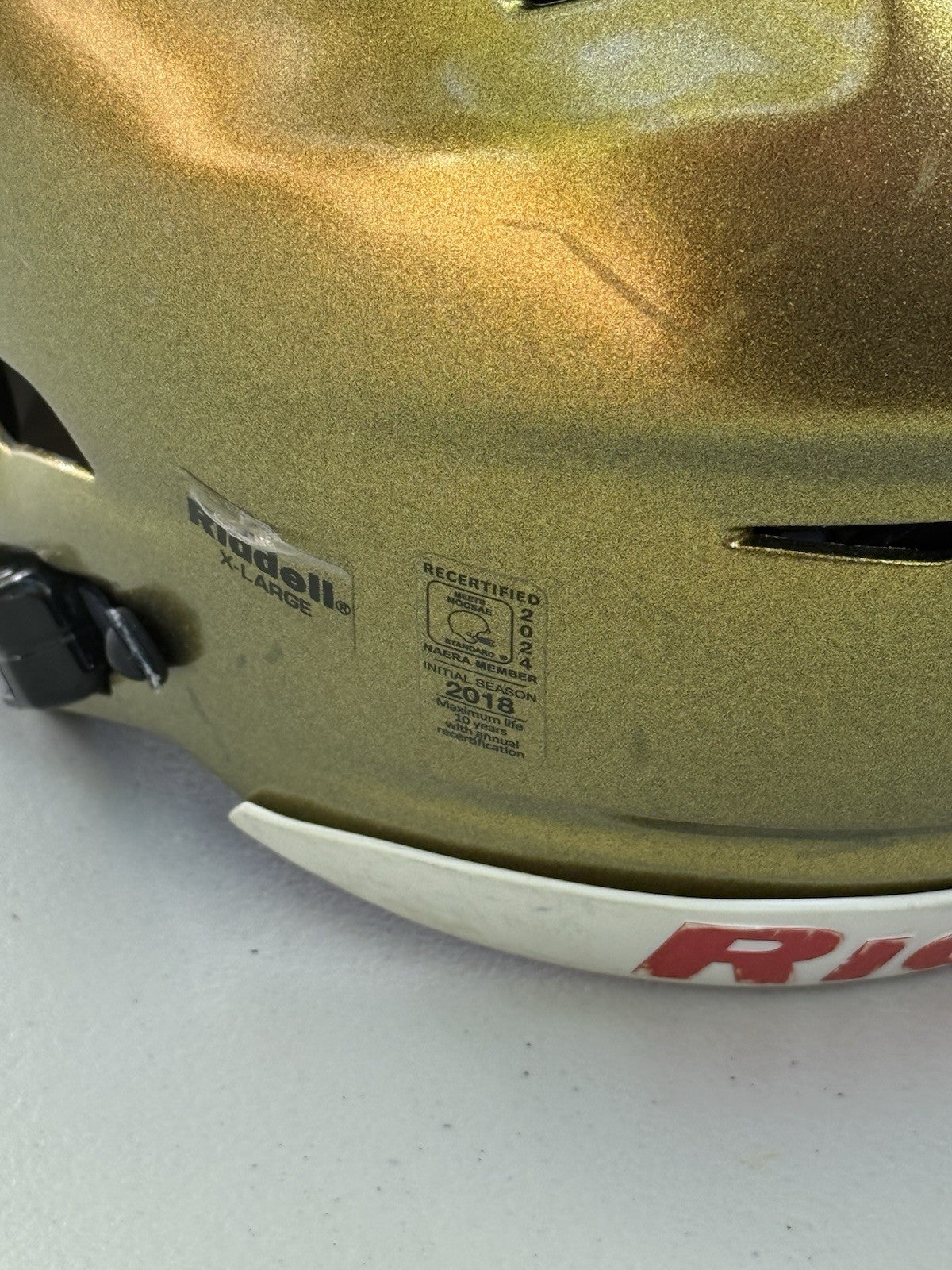Metallic Gold Riddell Speed Flex Adult Size Extra Large Football Helmet that was used at the NCAA D1 level and comes as shown in the listing photos. Perfect for display or customizing. Please note; prior to any usage with this helmet it should first be inspected and certified by an authorized inspection company.