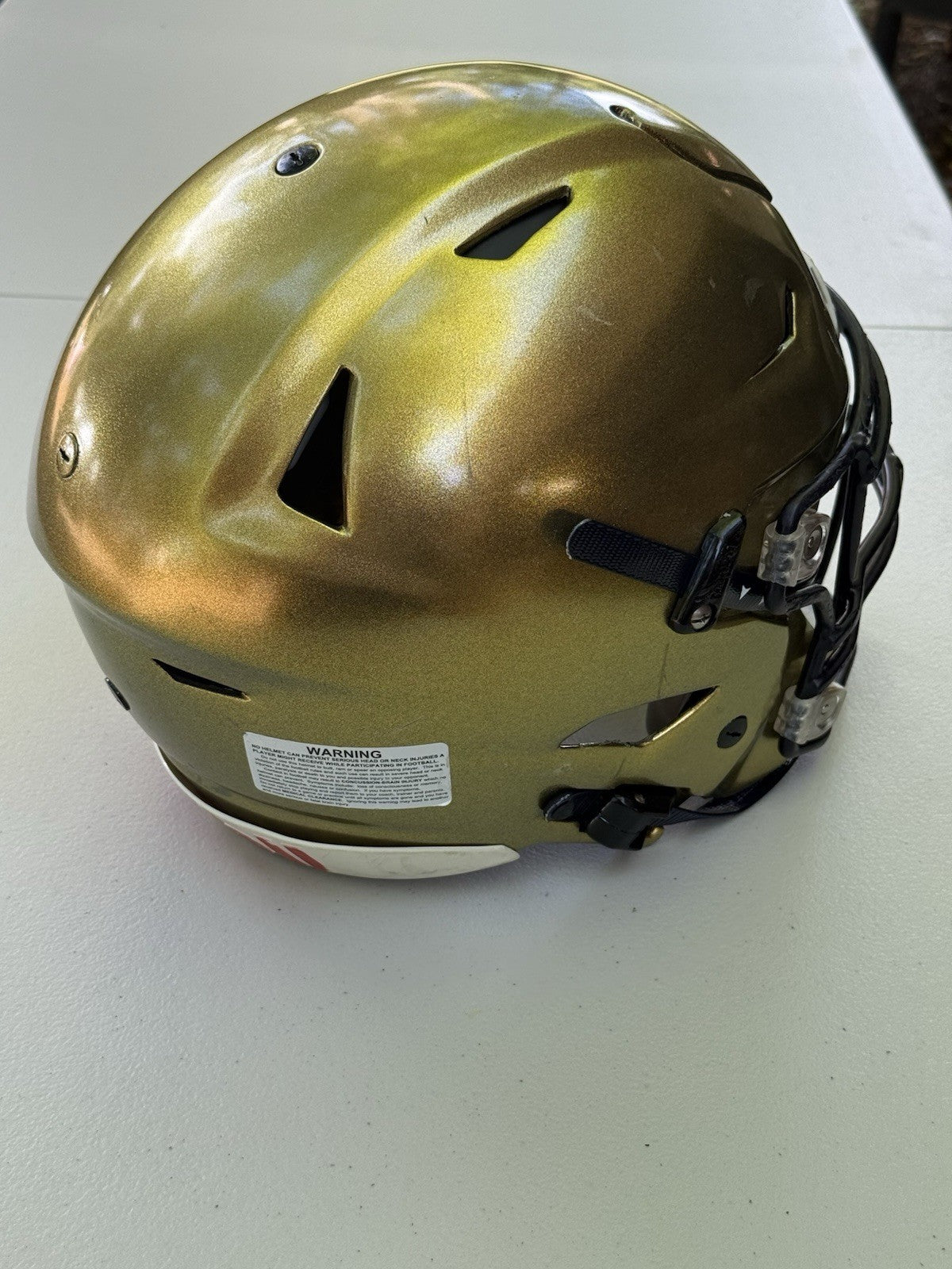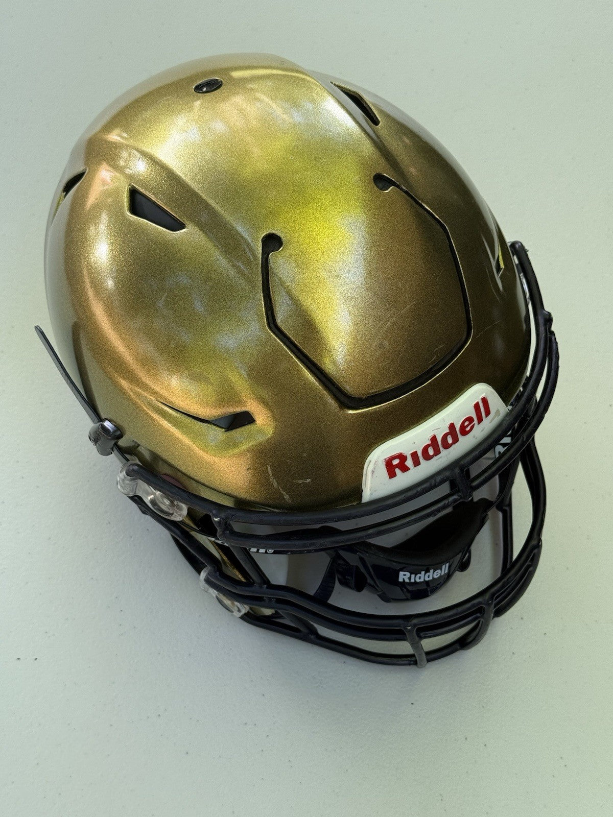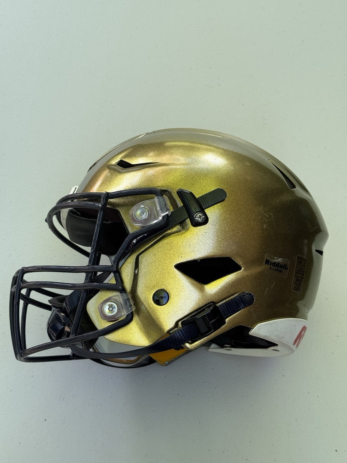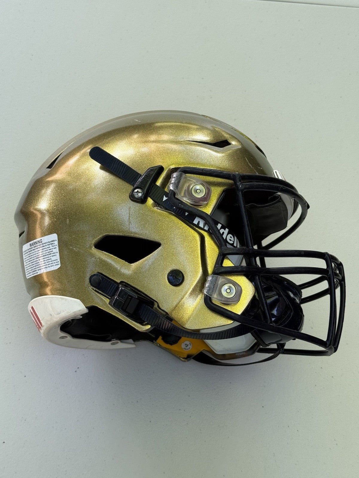 Metallic Gold Riddell Speed Flex Adult Size Extra Large Football Helmet that was used at the NCAA D1 level and comes as shown in the listing photos. Perfect for display or customizing. Please note; prior to any usage with this helmet it should first be inspected and certified by an authorized inspection company.