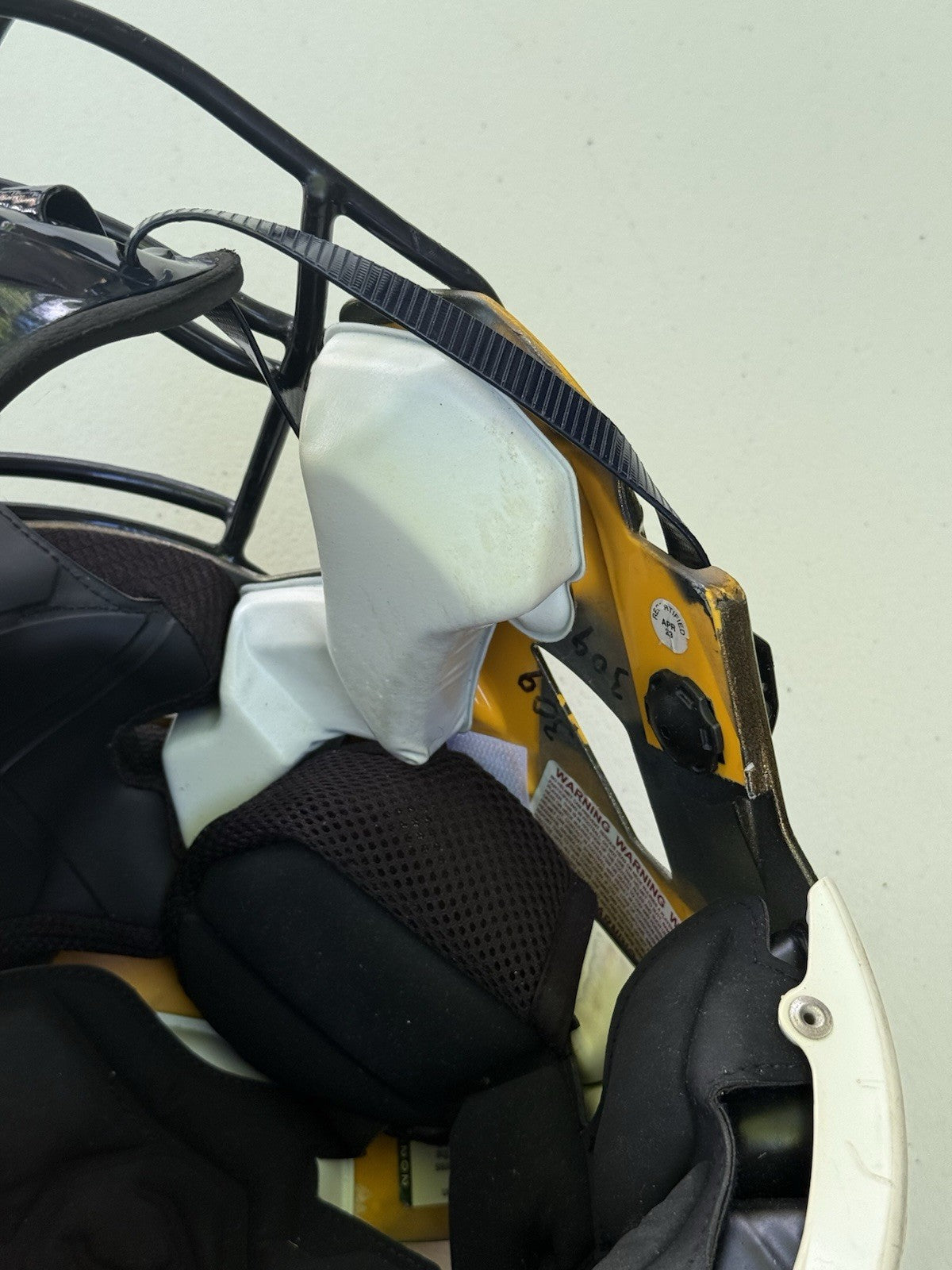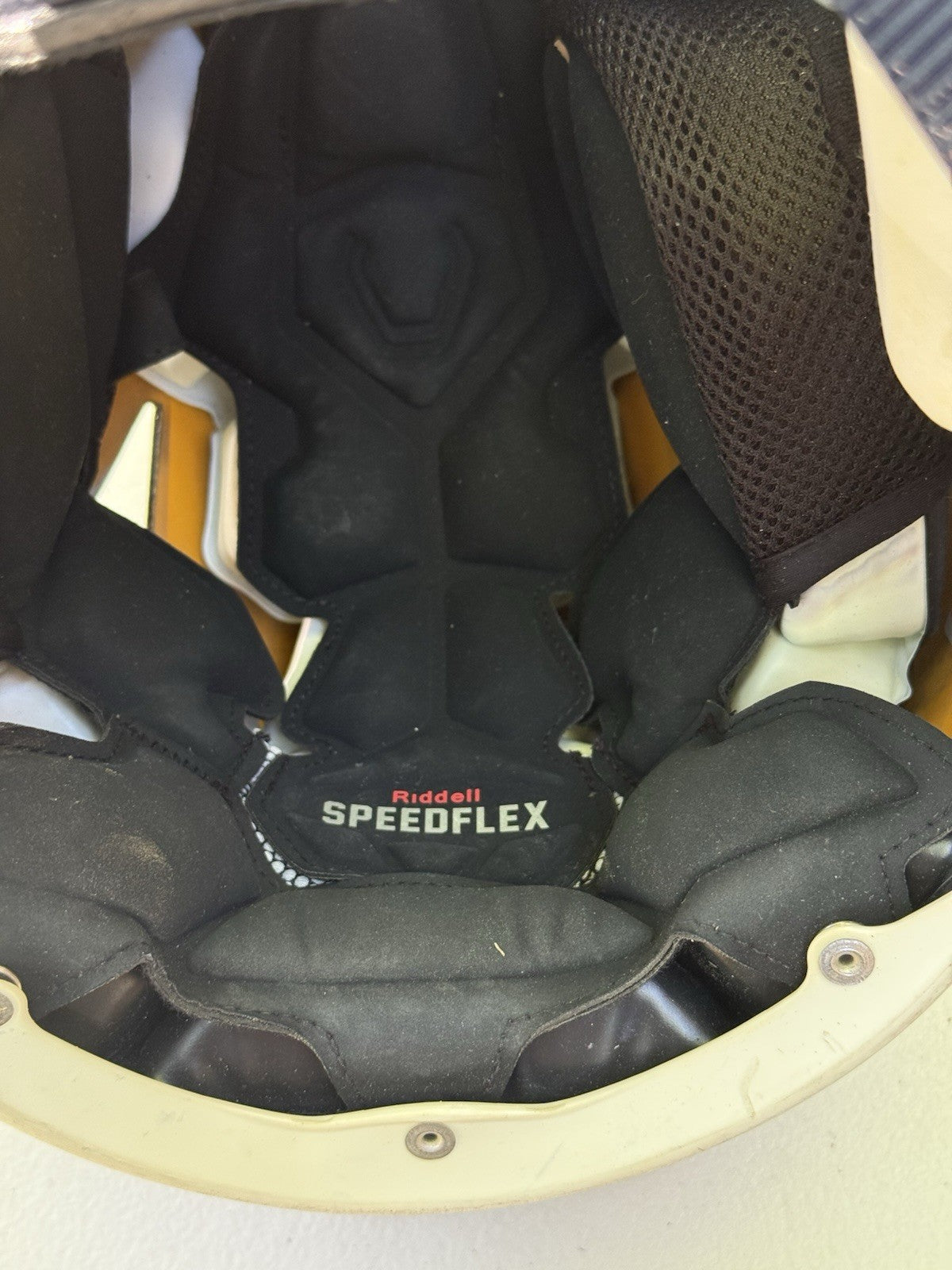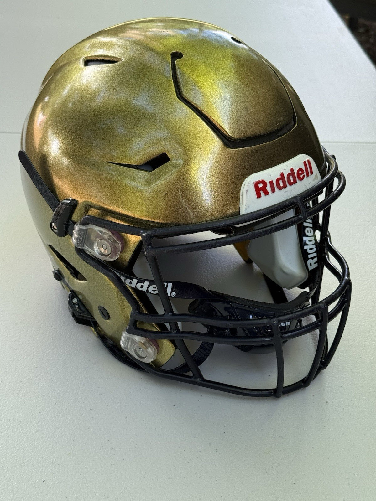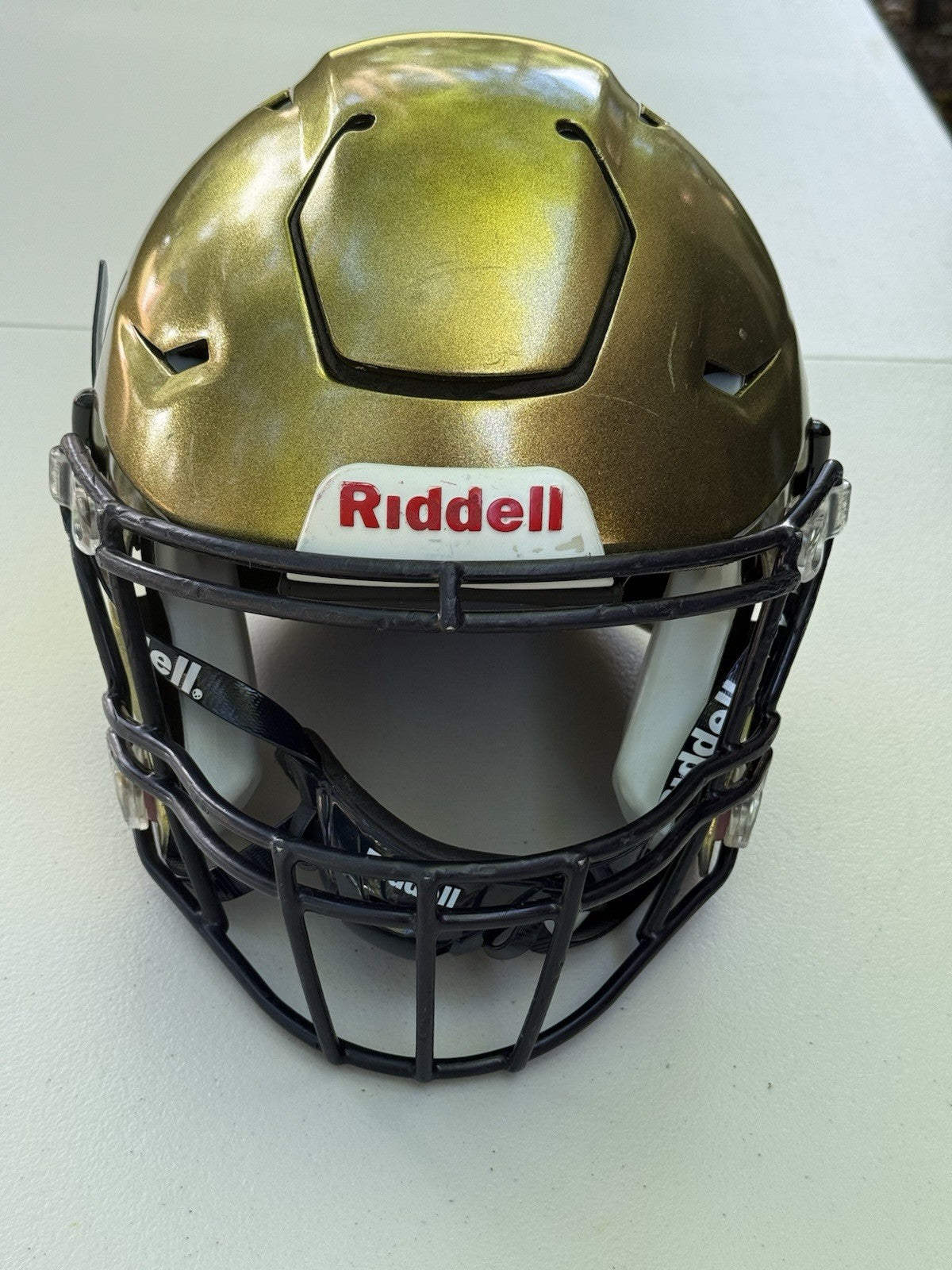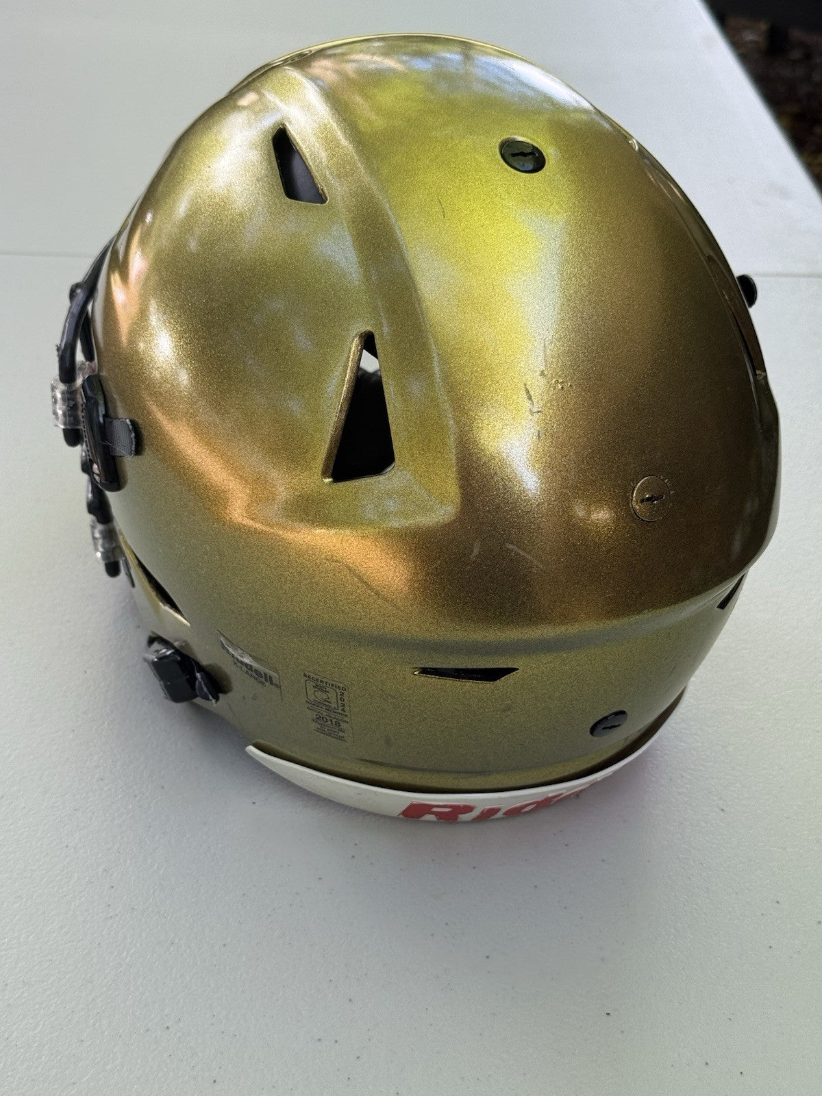 Metallic Gold Riddell Speed Flex Adult Size Extra Large Football Helmet that was used at the NCAA D1 level and comes as shown in the listing photos. Perfect for display or customizing. Please note; prior to any usage with this helmet it should first be inspected and certified by an authorized inspection company.