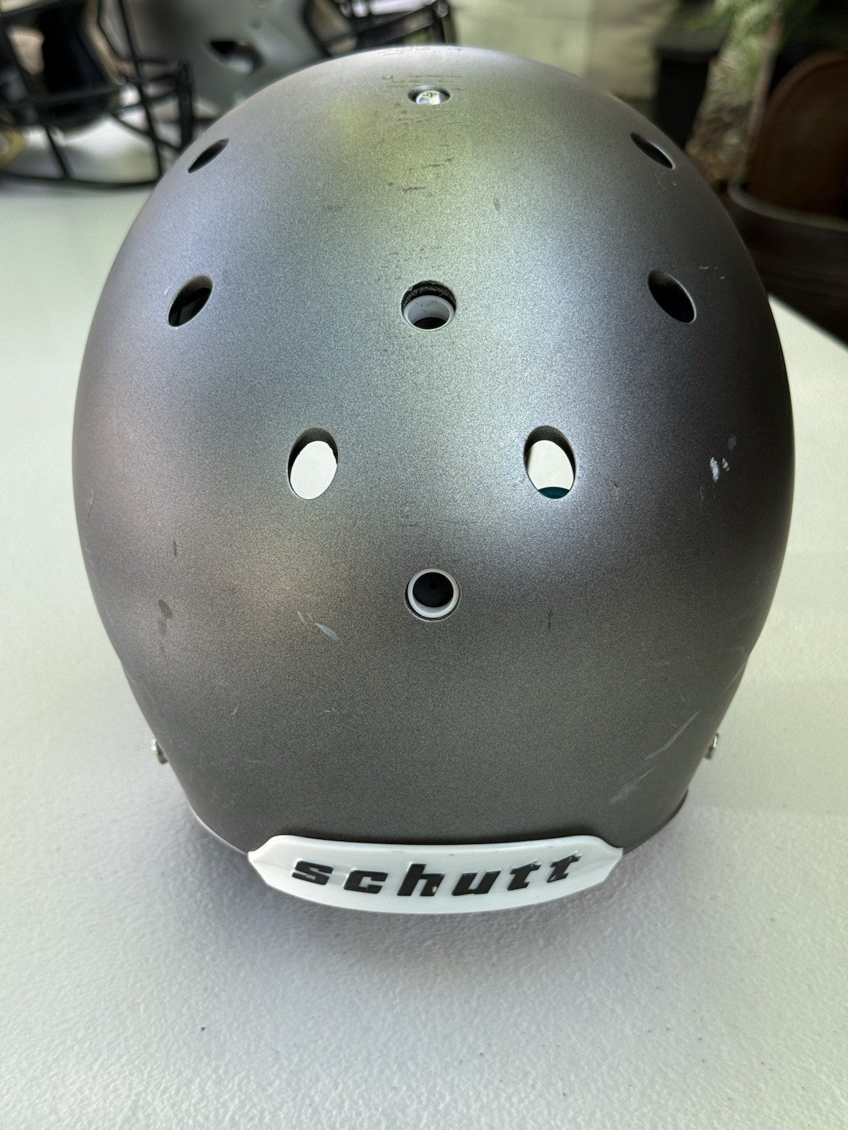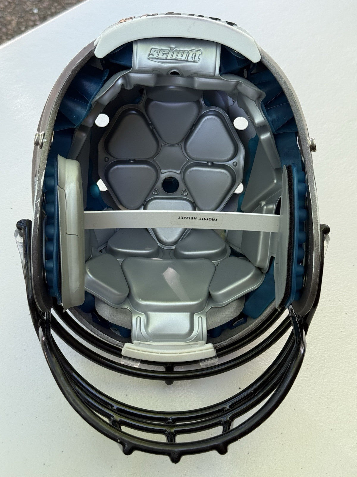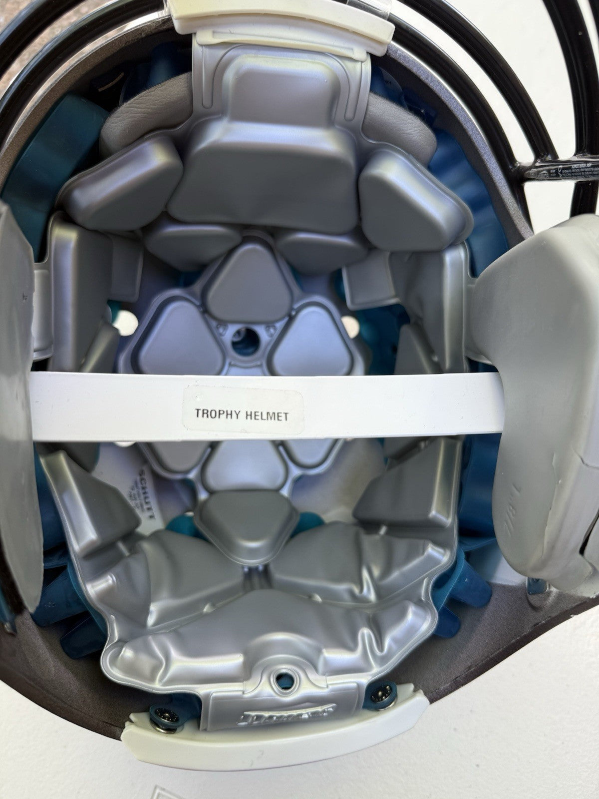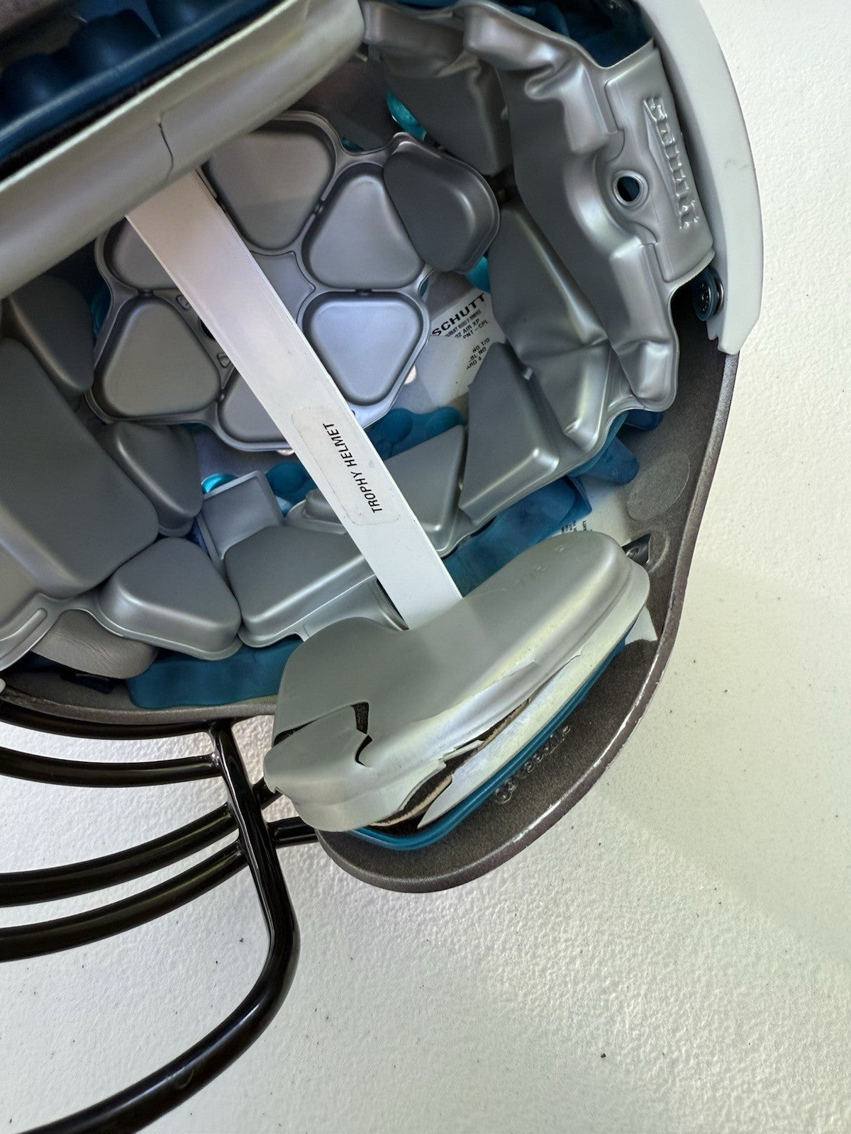 Schutt Football Helmet that was originally used at the NCAA Division One college level and has been since converted into a Trophy Display Helmet. Evidence of previous usage shown in photos, including some labels/stickers on the inner shell Great helmet for displaying and customizing.