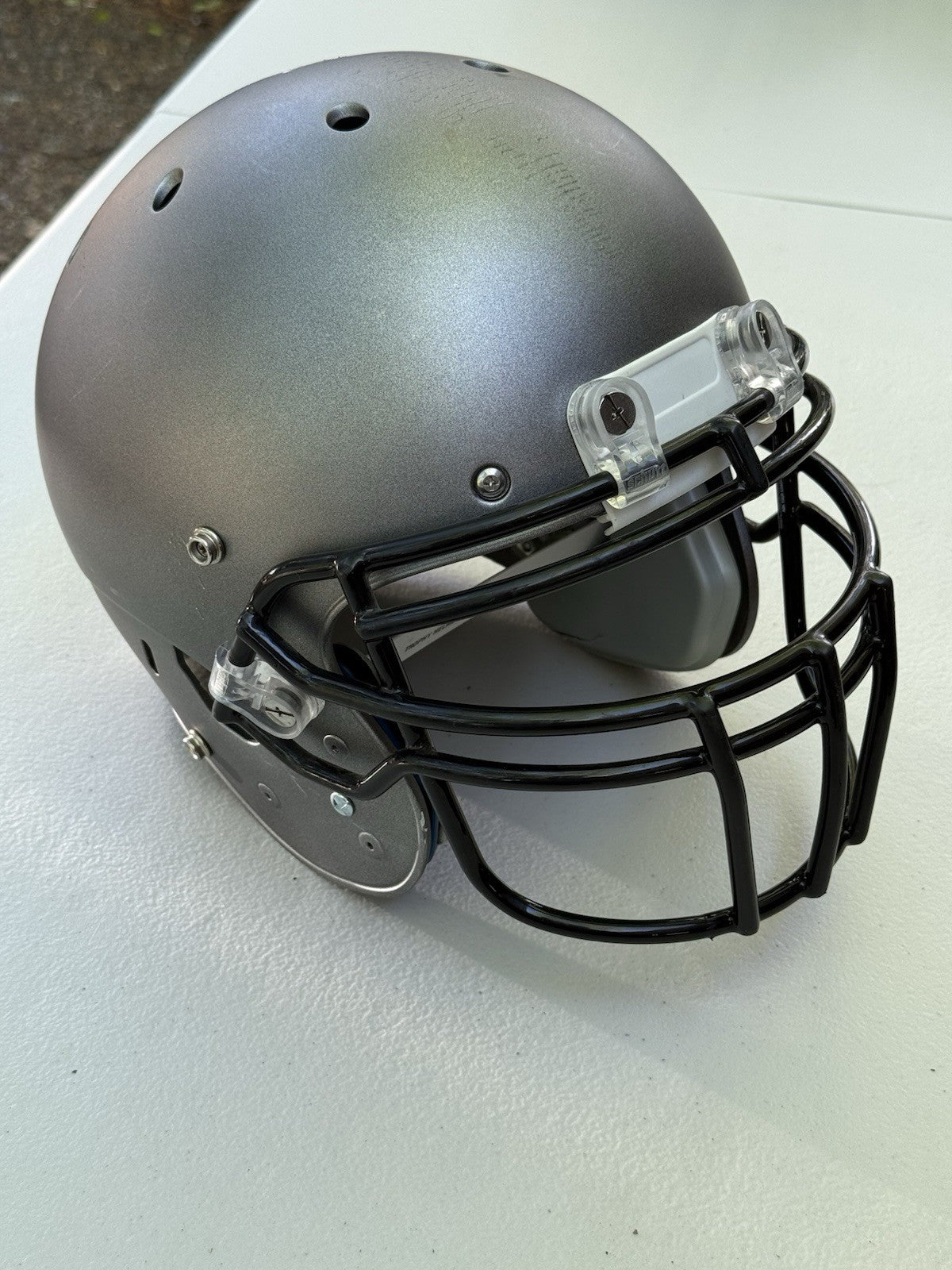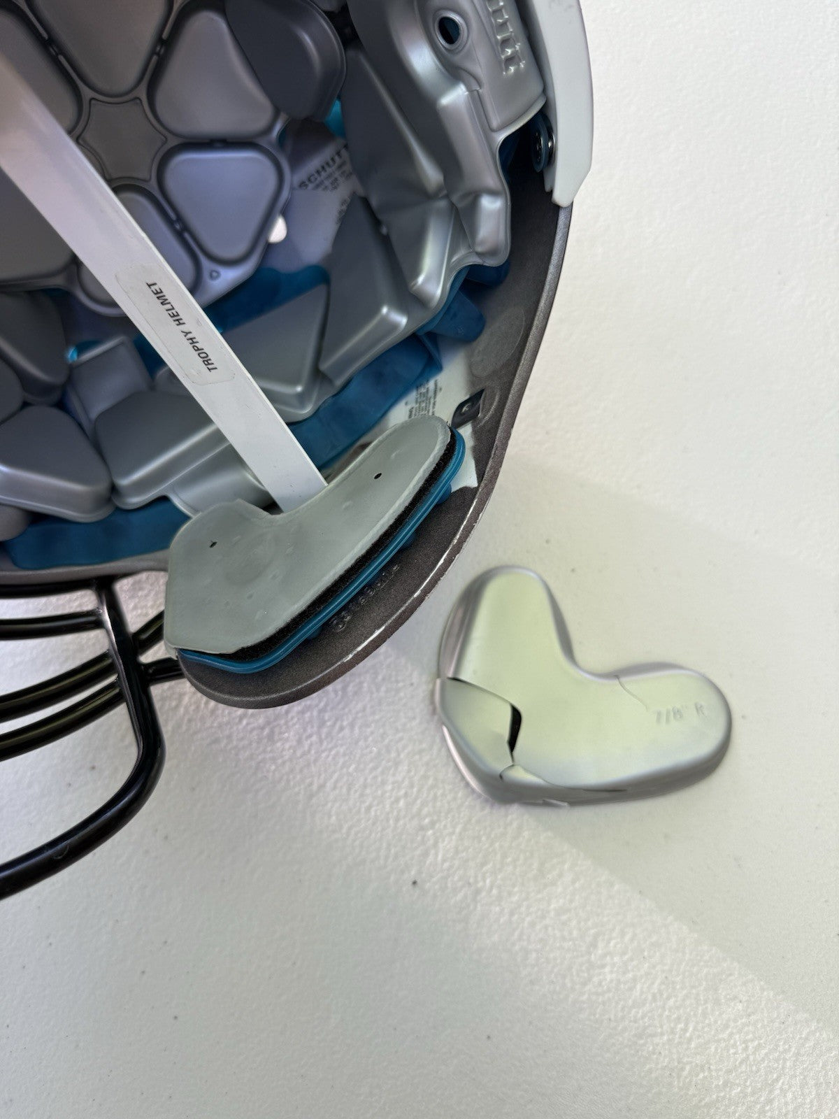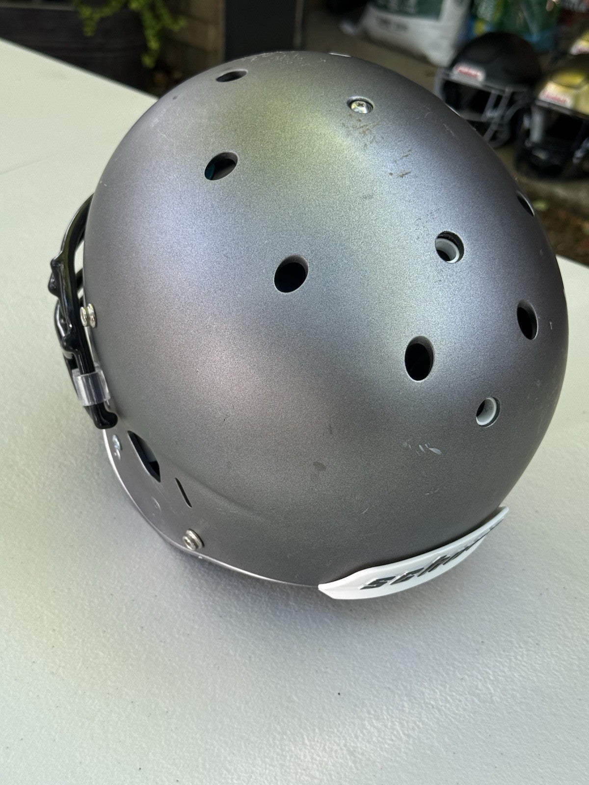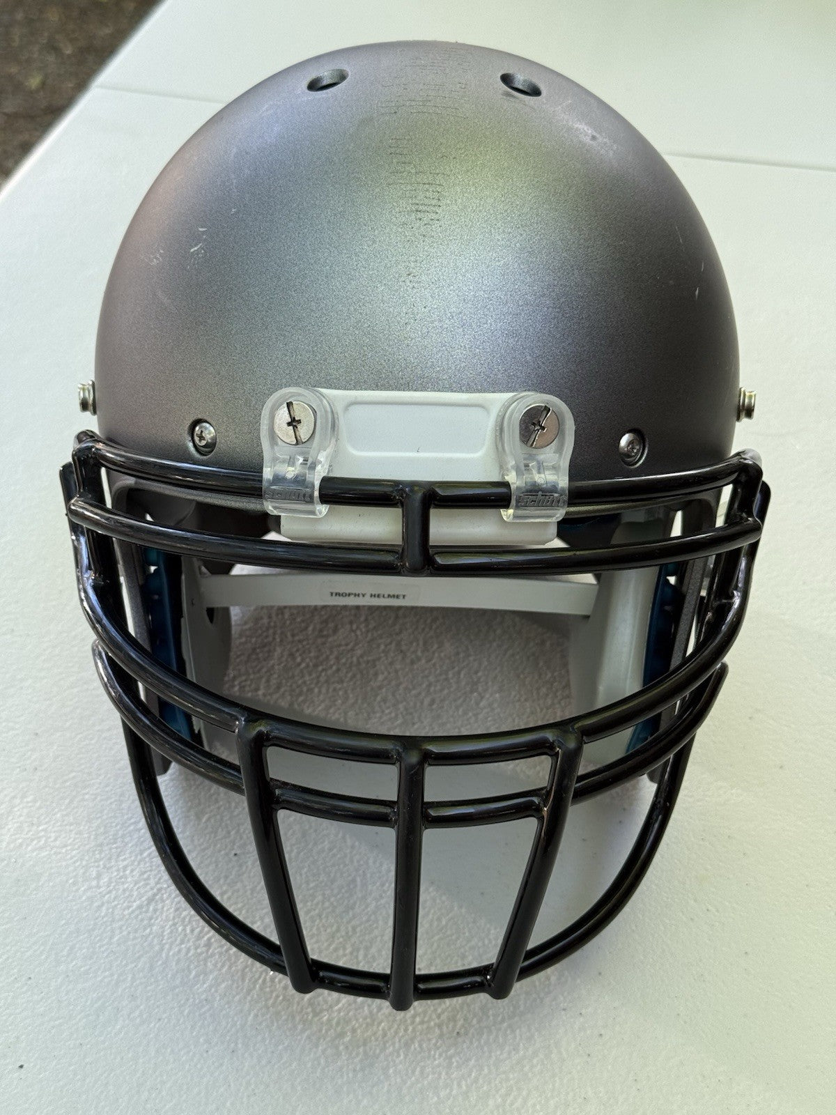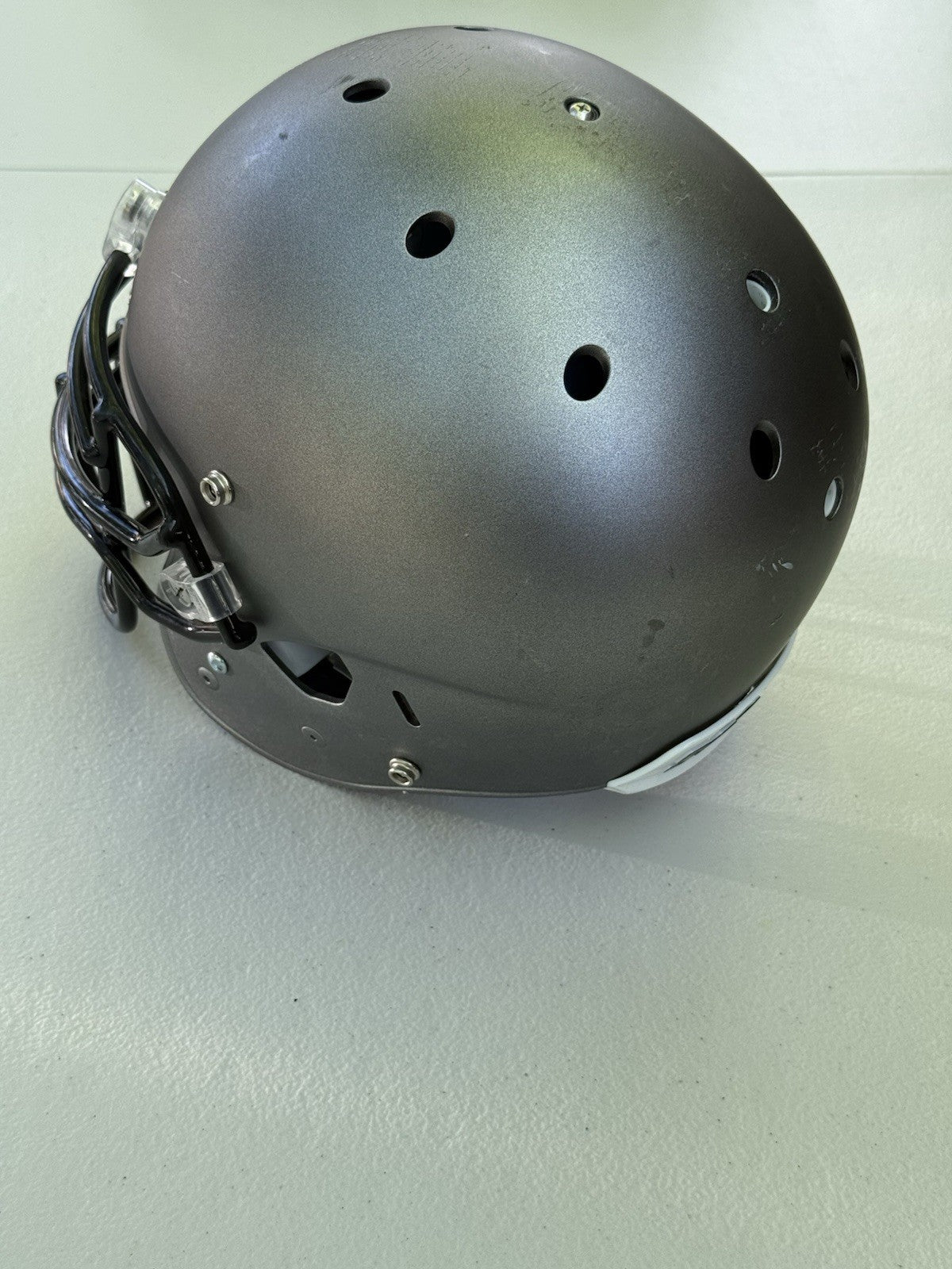 Schutt Football Helmet that was originally used at the NCAA Division One college level and has been since converted into a Trophy Display Helmet. Evidence of previous usage shown in photos, including some labels/stickers on the inner shell Great helmet for displaying and customizing.