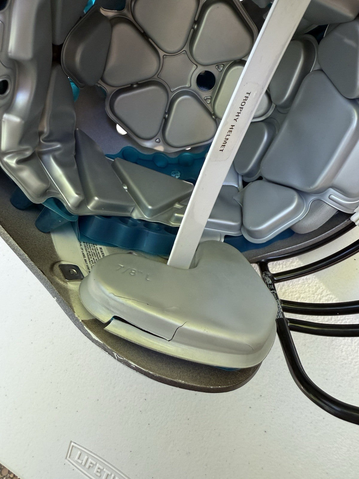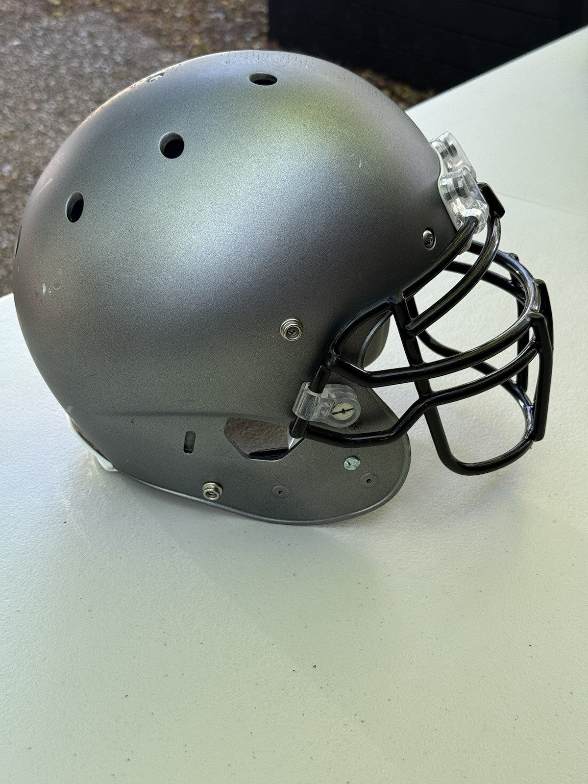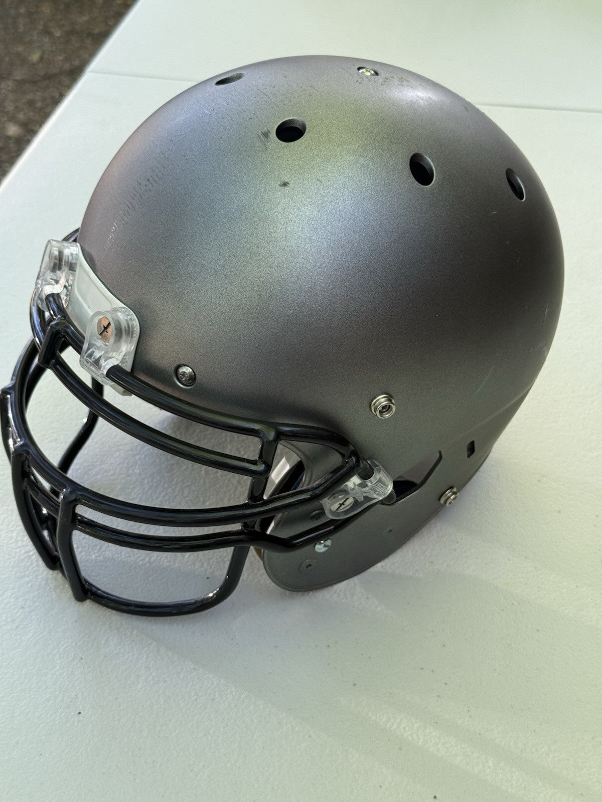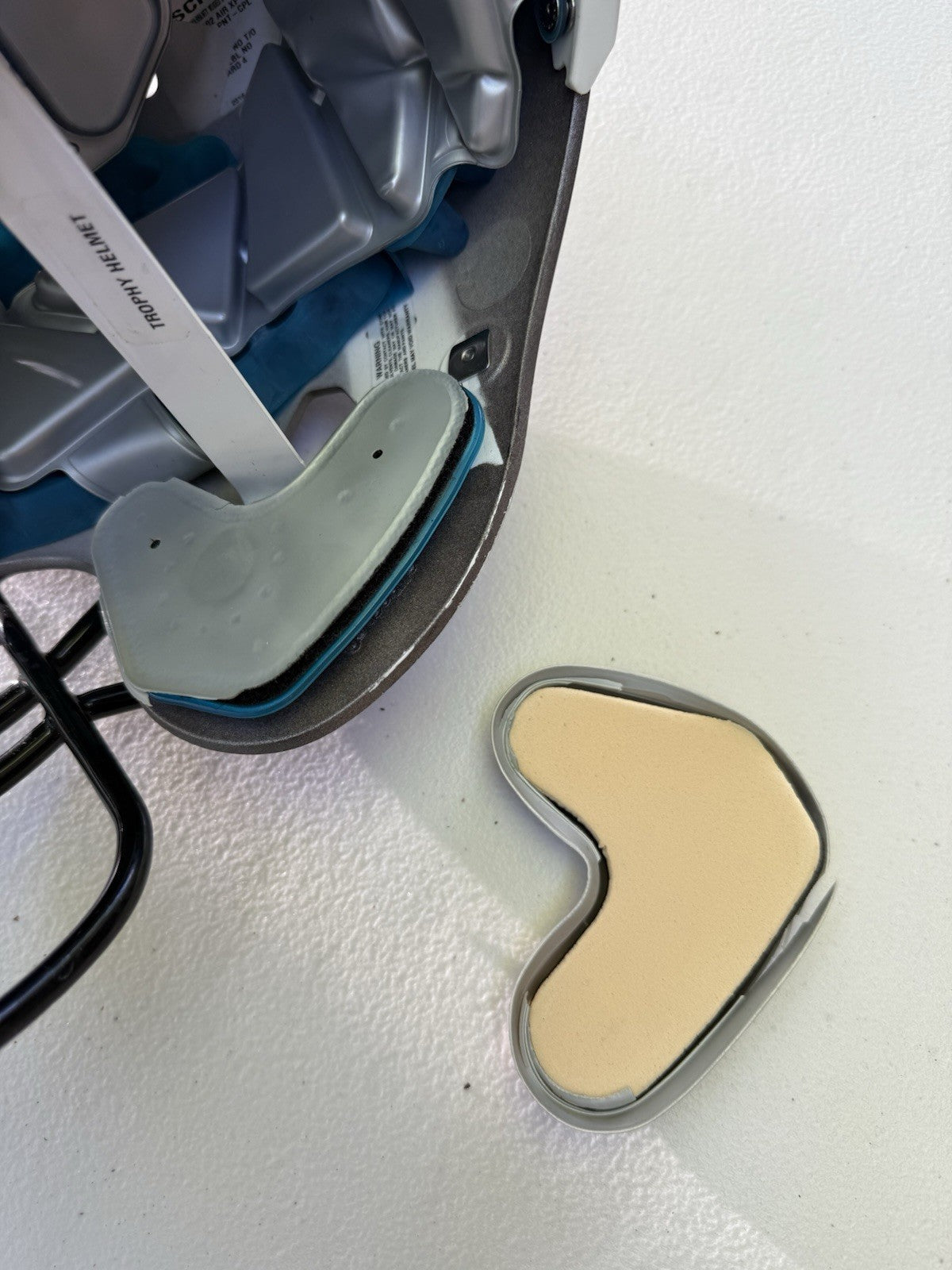 Schutt Football Helmet that was originally used at the NCAA Division One college level and has been since converted into a Trophy Display Helmet. Evidence of previous usage shown in photos, including some labels/stickers on the inner shell Great helmet for displaying and customizing.