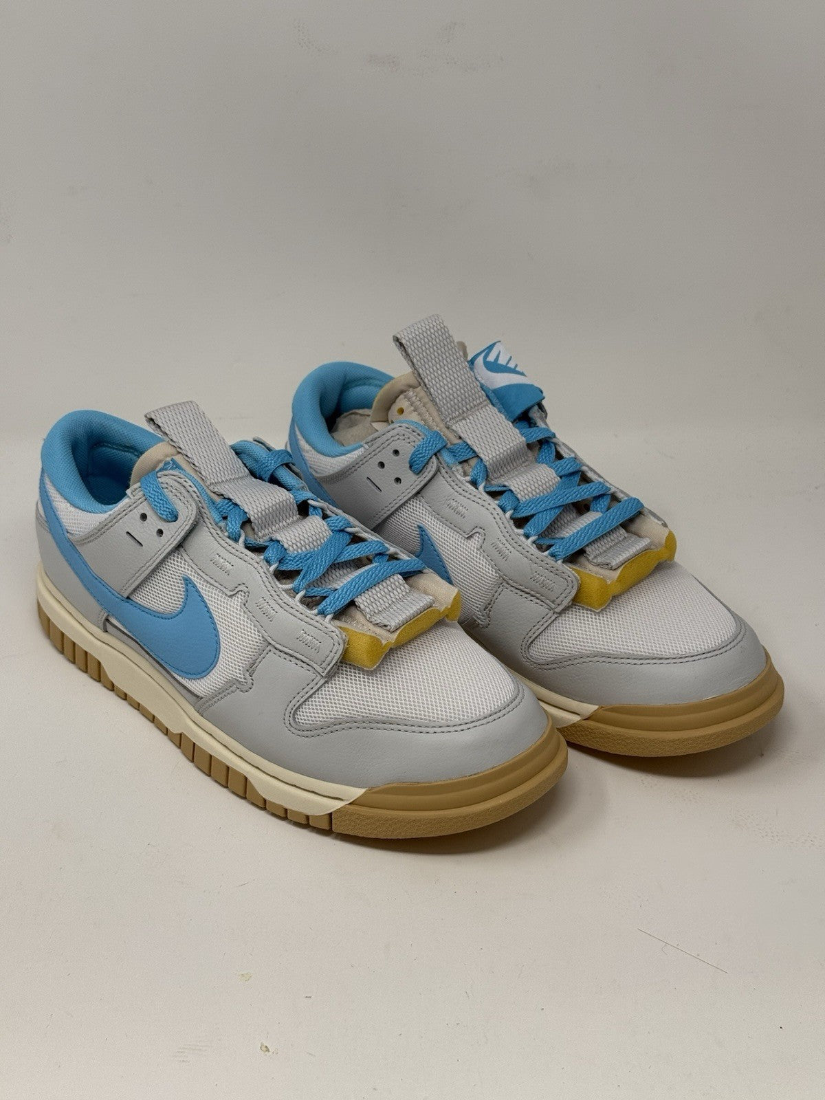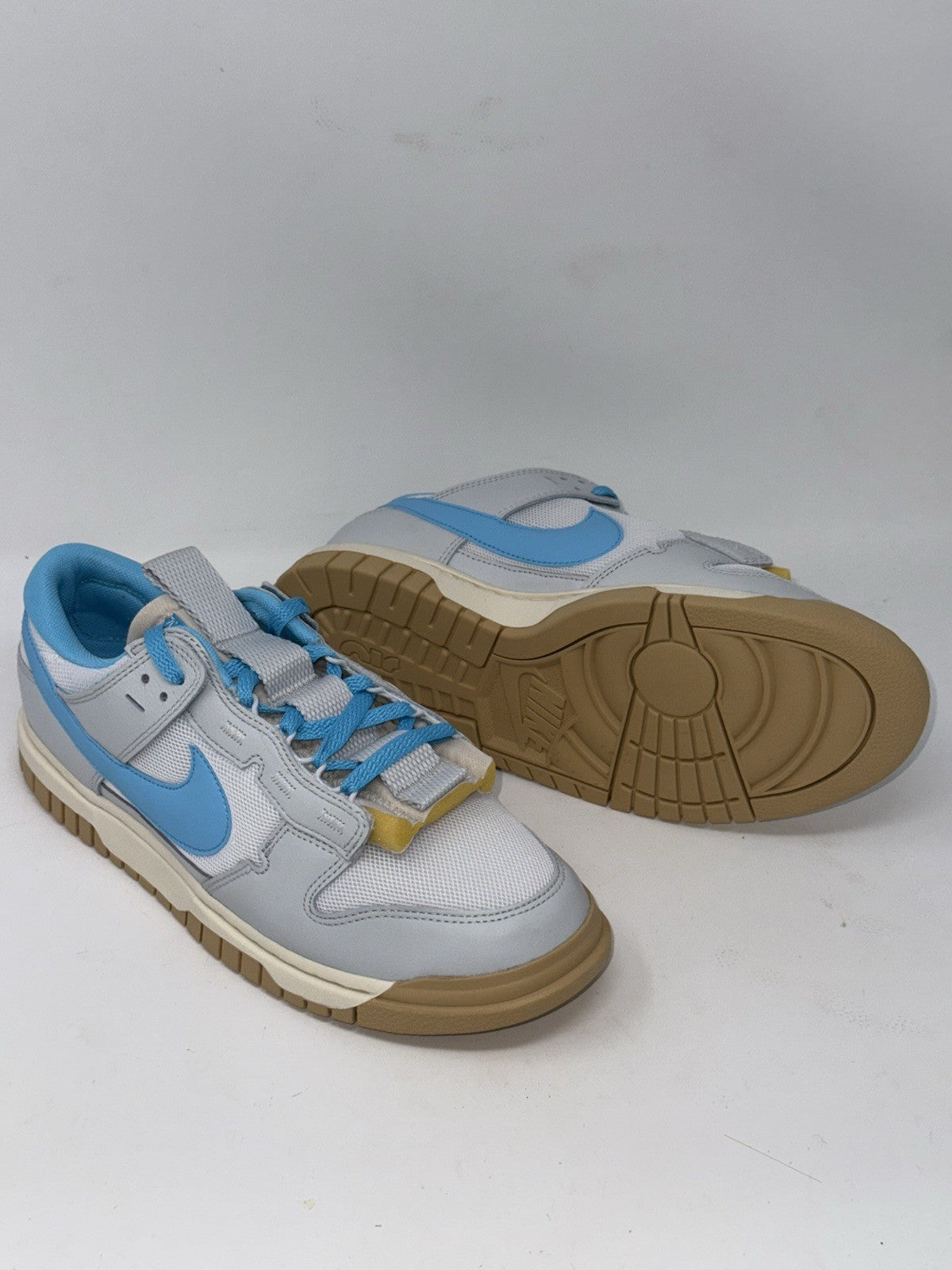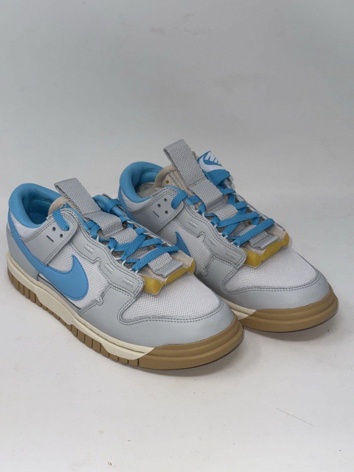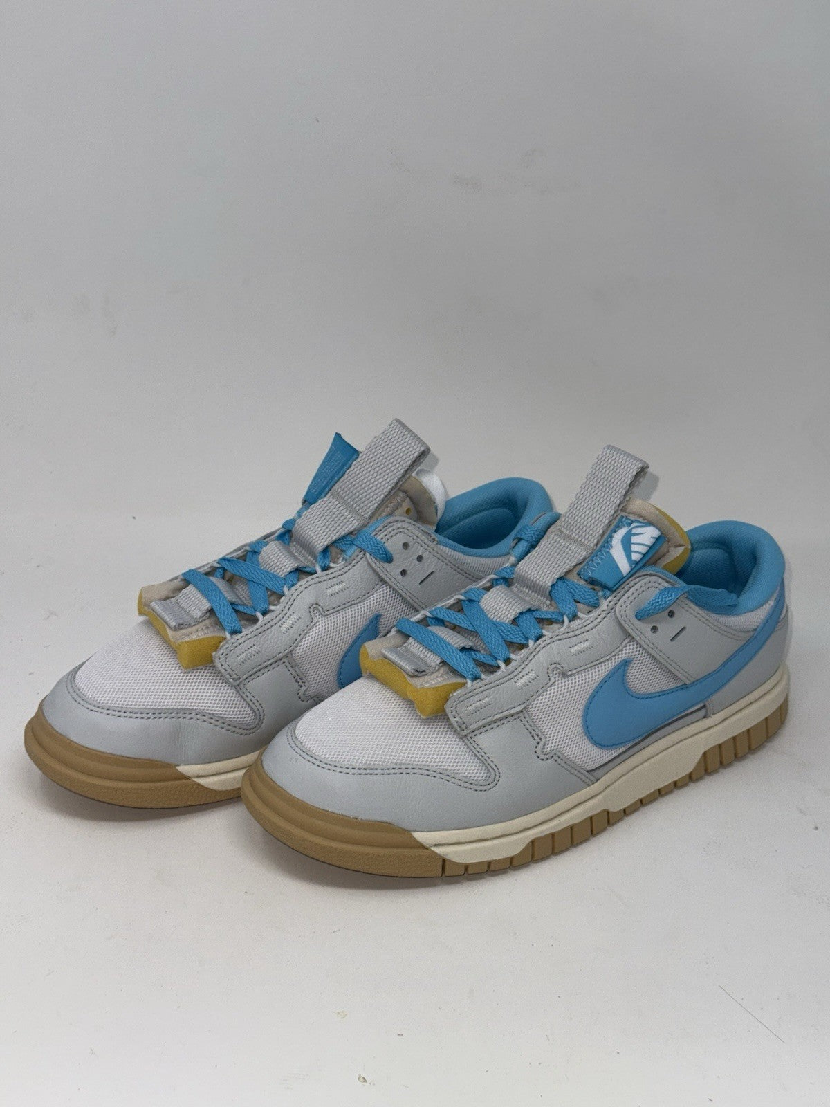 The product is a pair of Nike Air Dunk Jumbo White Denim/Turquoise Shoes in size 9.5. These sneakers are part of the Nike Dunks line and feature a low top shaft style. The shoes are designed for athletic activities such as walking, boxing, CrossFit, basketball, and running/jogging. Made with leather material, these shoes also have a vintage look and have a color scheme of white, denim, and turquoise. Perfect for sneakers enthusiasts looking for a stylish and versatile pair of shoes for various activities.