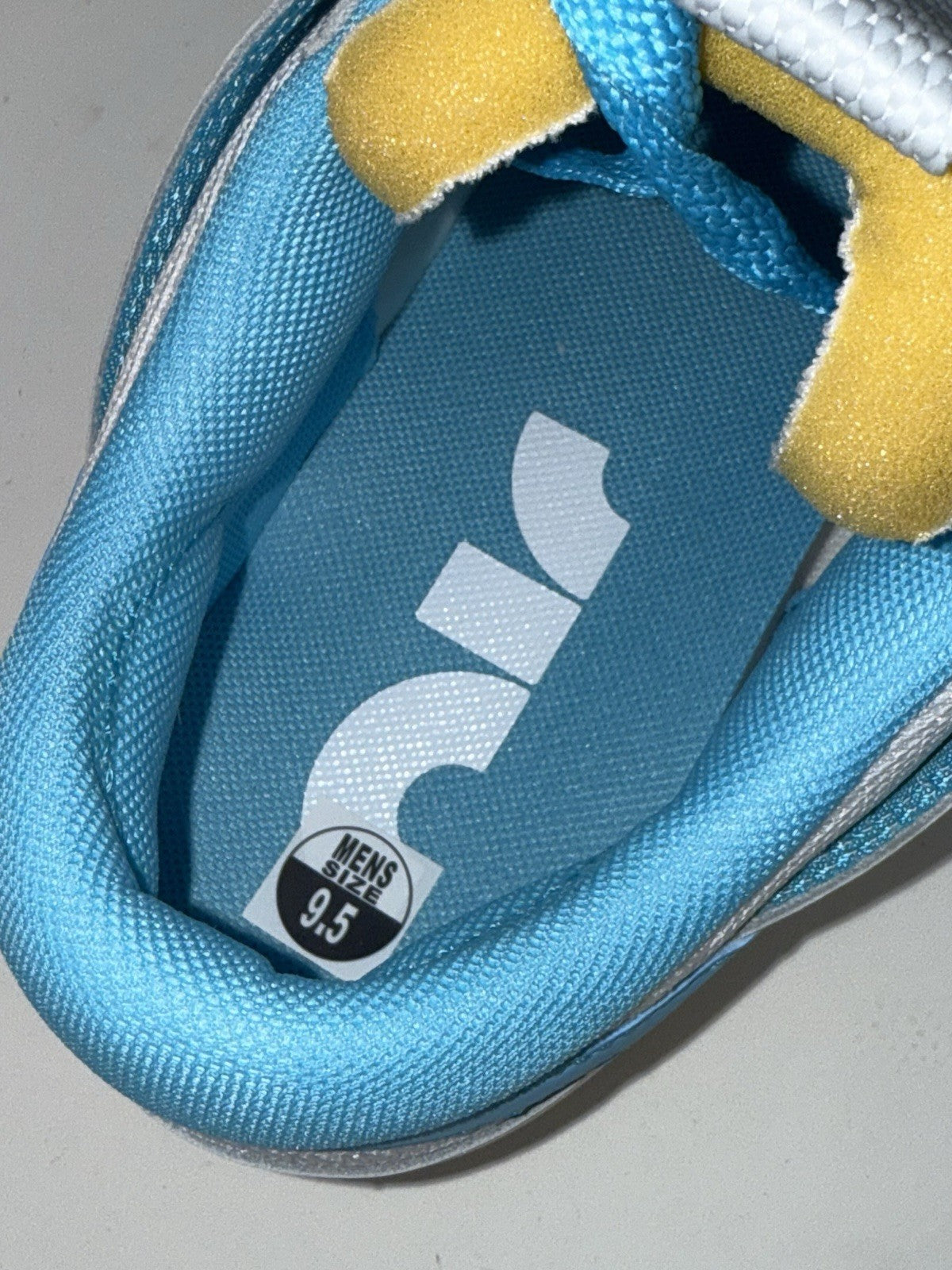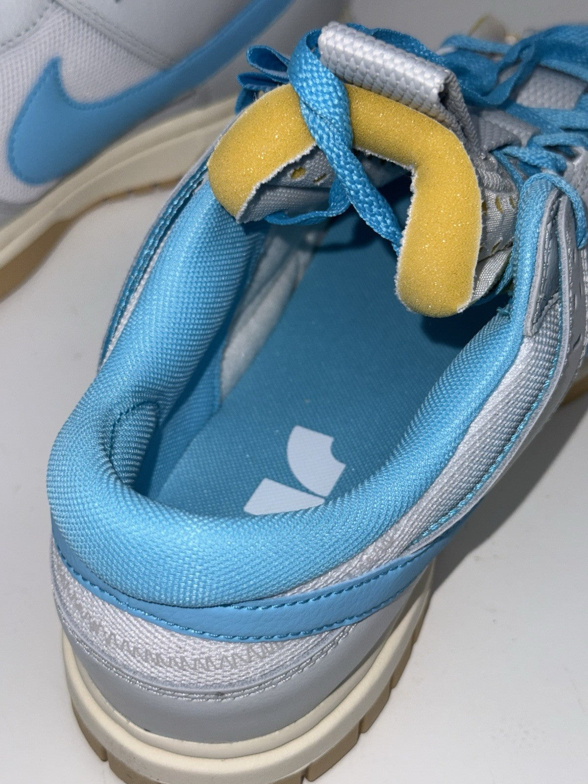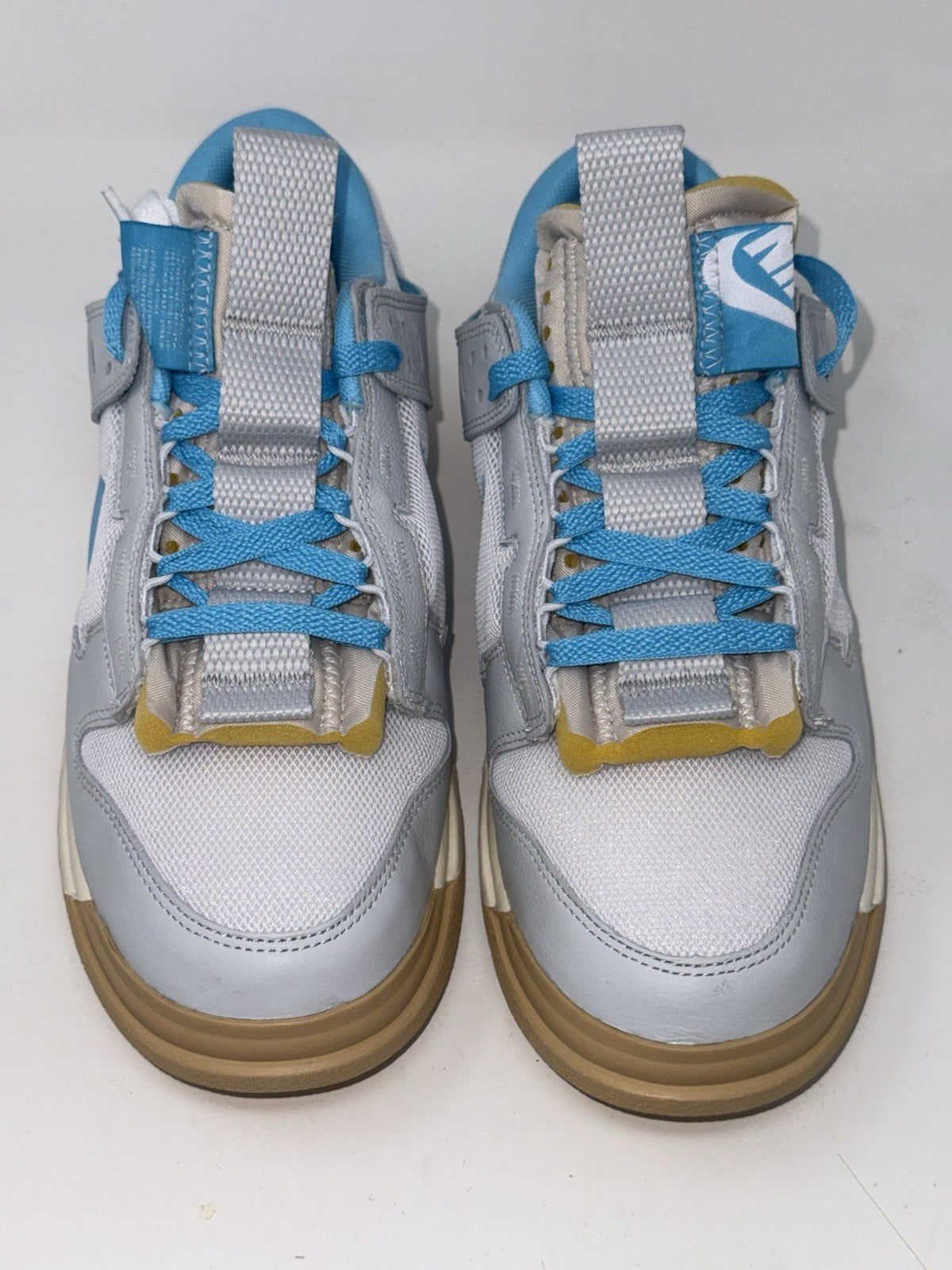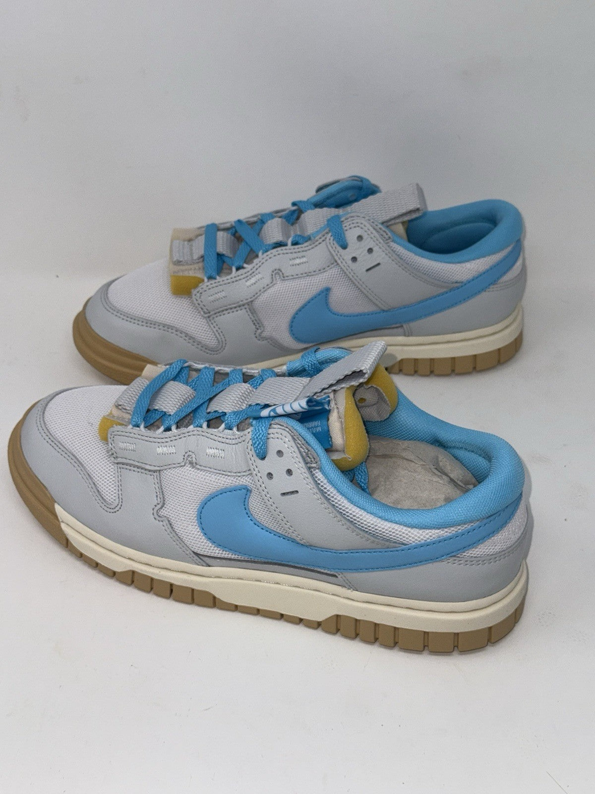 The product is a pair of Nike Air Dunk Jumbo White Denim/Turquoise Shoes in size 9.5. These sneakers are part of the Nike Dunks line and feature a low top shaft style. The shoes are designed for athletic activities such as walking, boxing, CrossFit, basketball, and running/jogging. Made with leather material, these shoes also have a vintage look and have a color scheme of white, denim, and turquoise. Perfect for sneakers enthusiasts looking for a stylish and versatile pair of shoes for various activities.