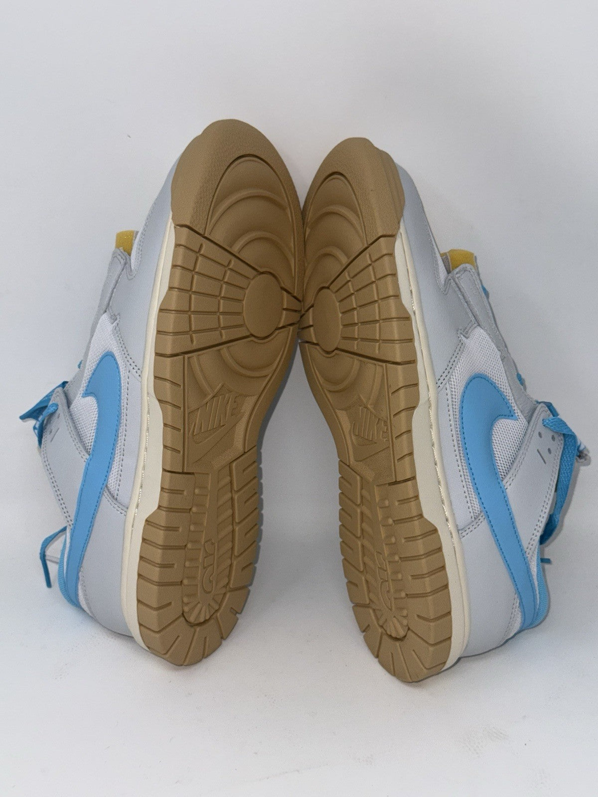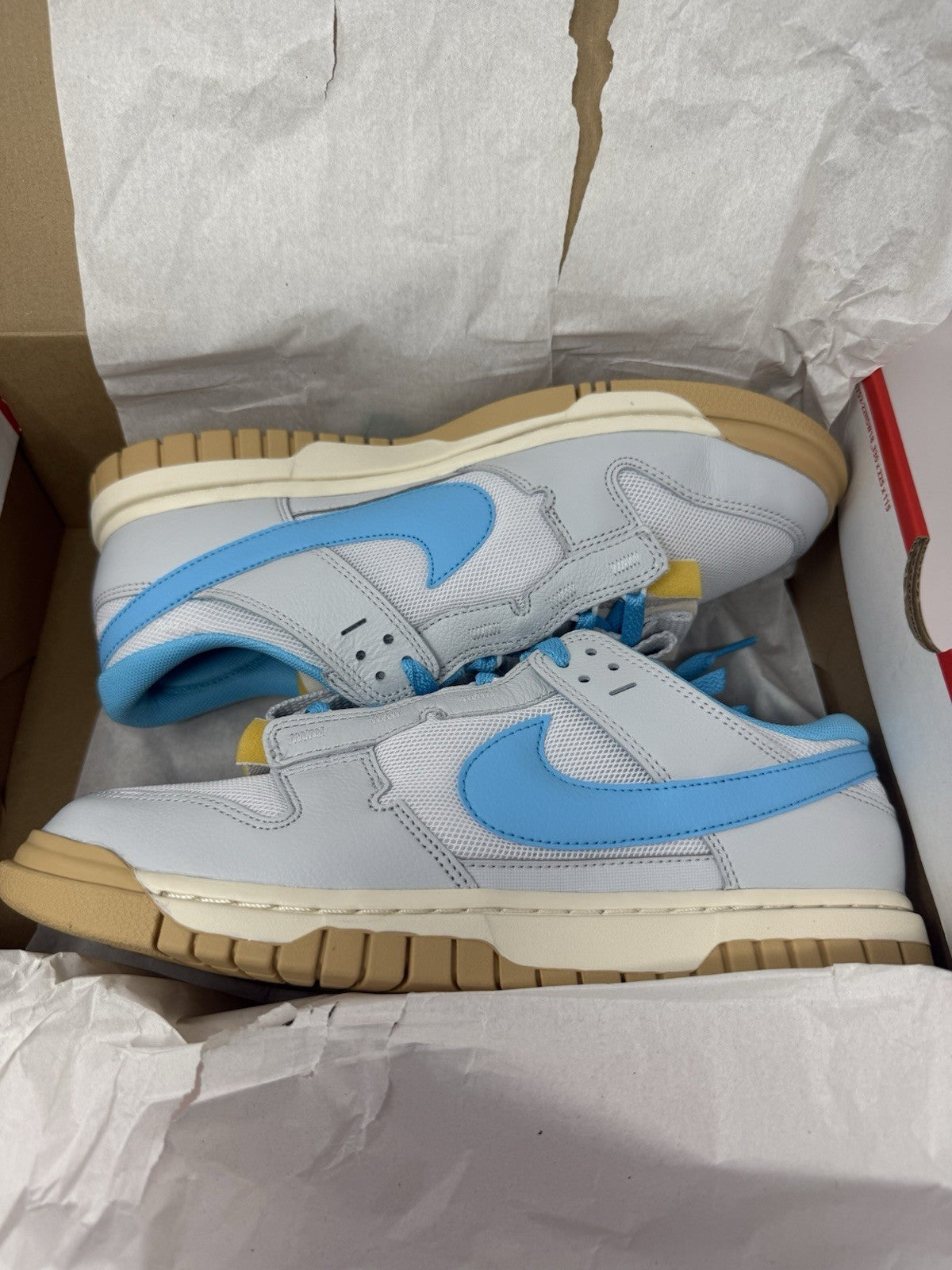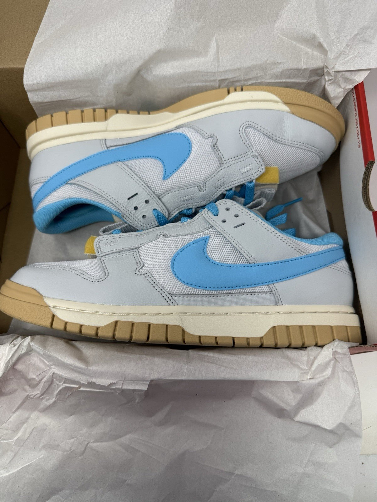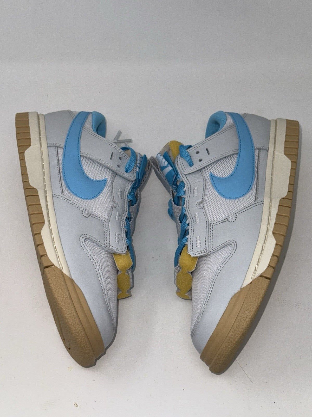 The product is a pair of Nike Air Dunk Jumbo White Denim/Turquoise Shoes in size 9.5. These sneakers are part of the Nike Dunks line and feature a low top shaft style. The shoes are designed for athletic activities such as walking, boxing, CrossFit, basketball, and running/jogging. Made with leather material, these shoes also have a vintage look and have a color scheme of white, denim, and turquoise. Perfect for sneakers enthusiasts looking for a stylish and versatile pair of shoes for various activities.