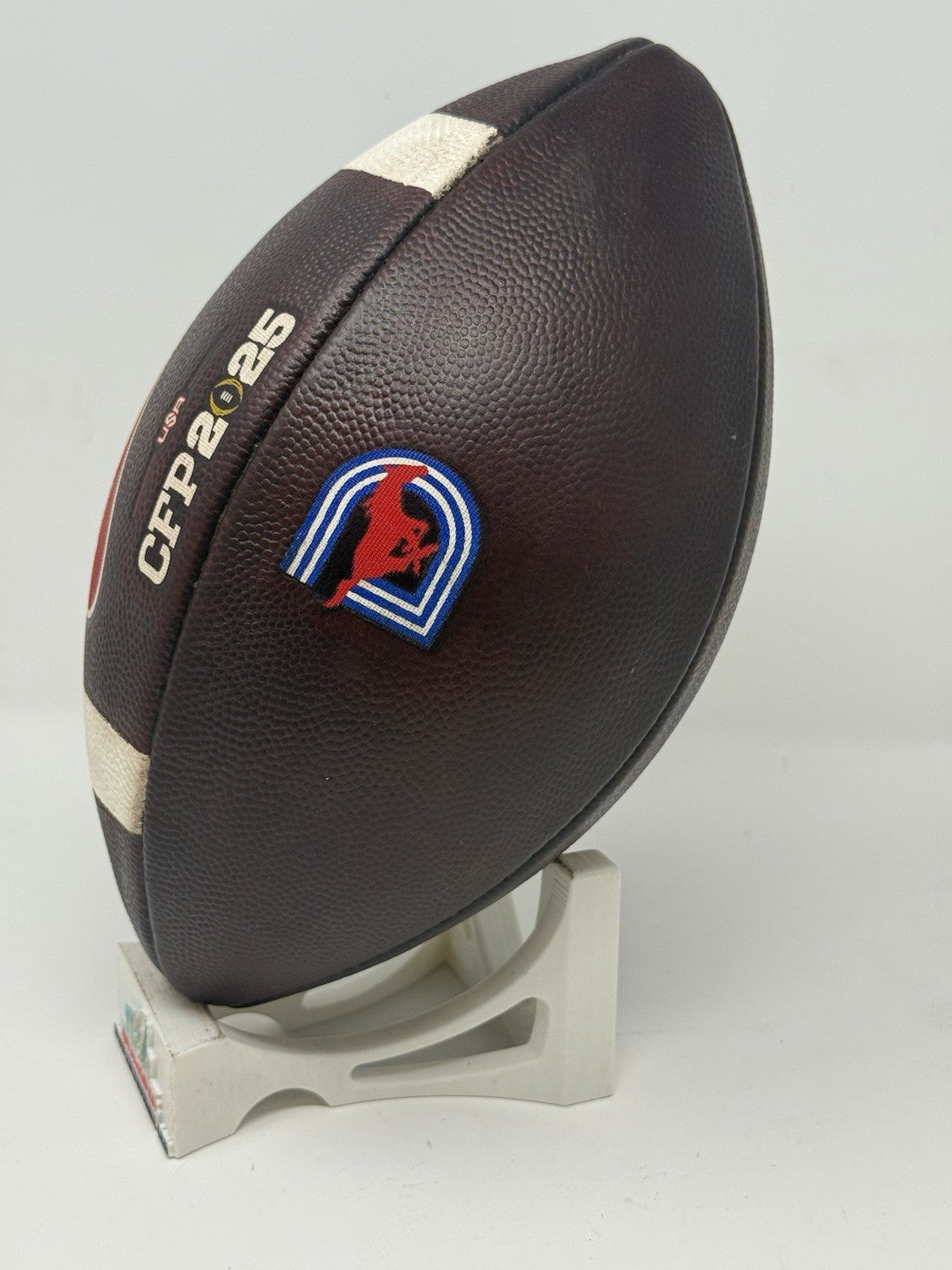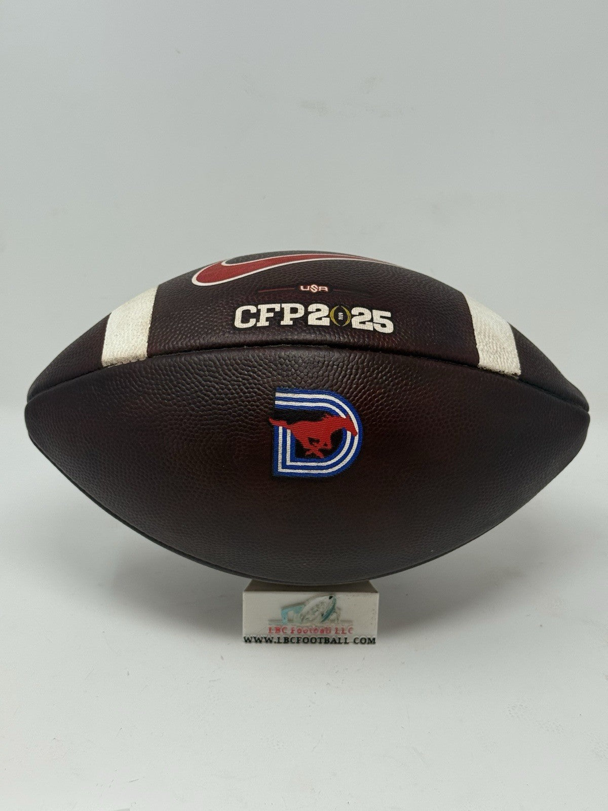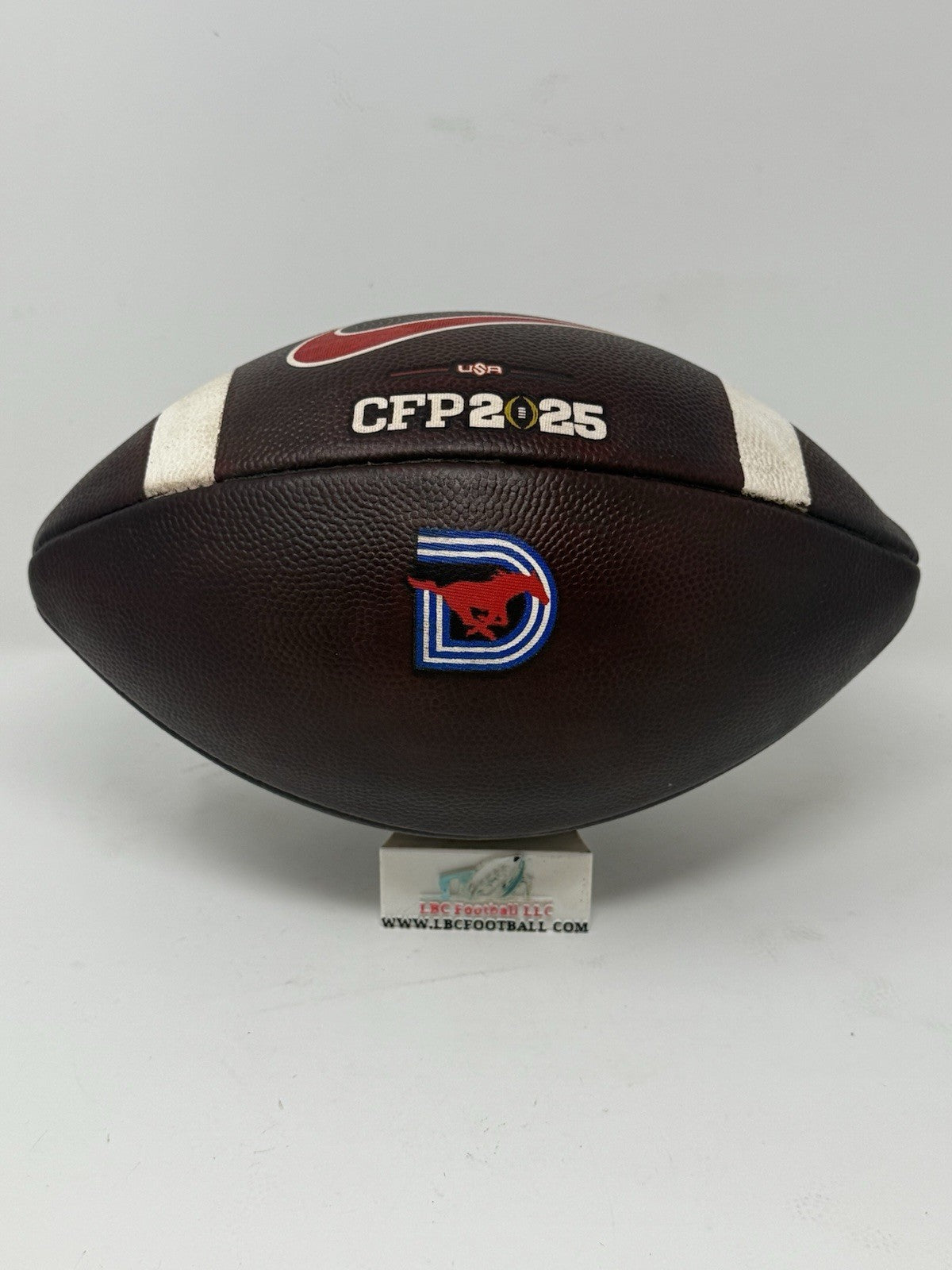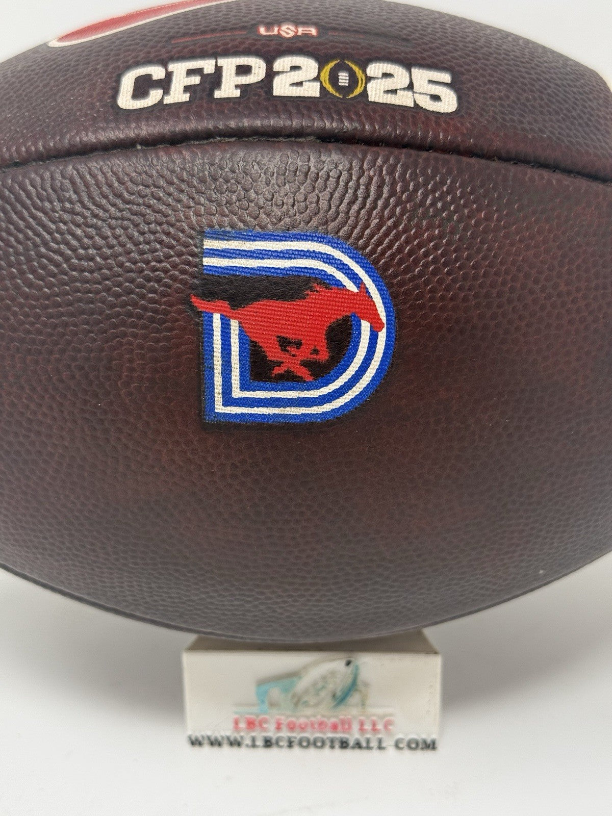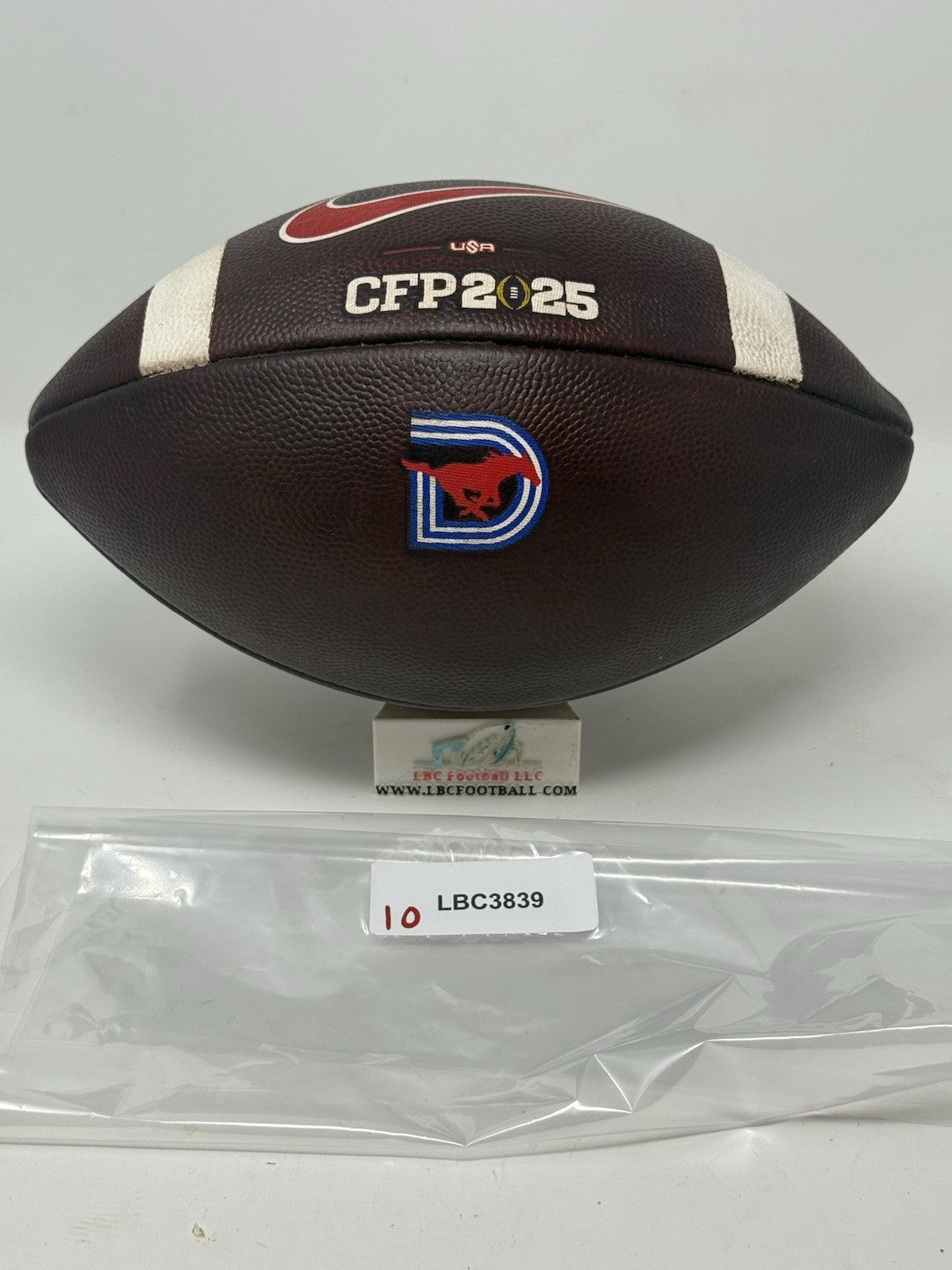 Recently fully game prepped and ready for usage (or display) on Day 1. The bladder holds air just fine, logos very well intact and the white stripes show some minor areas of scuff but overall, a great ball for any SMU fan or future star.