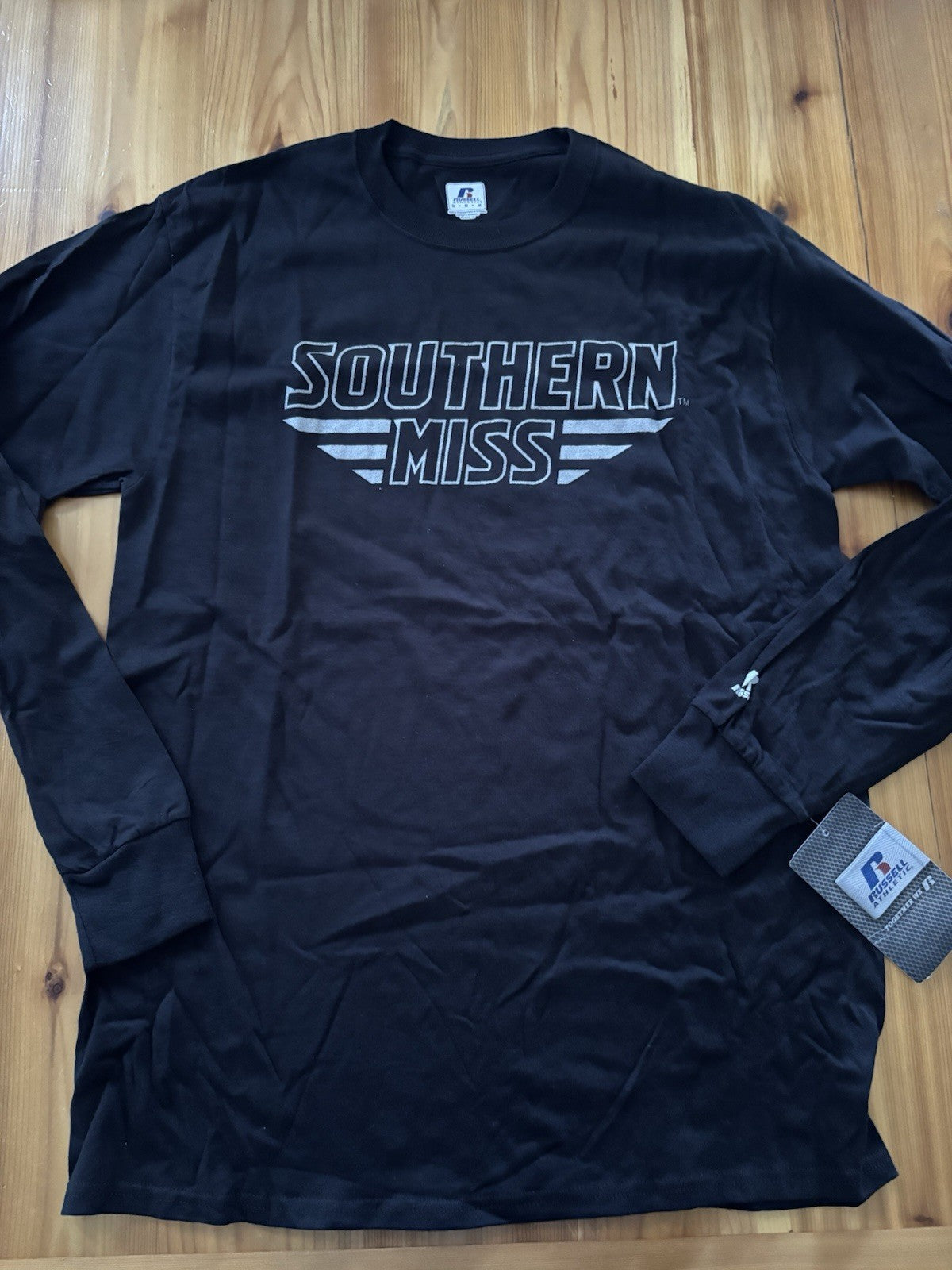 Rare Southern Mississippi Golden Eagles Football On-Field Sideline Team Issued Russell Athletic Black Long Sleeve Shirt, New with Tags but style worn by team a few seasons ago, back when Russell had the school sponsorship agreement.