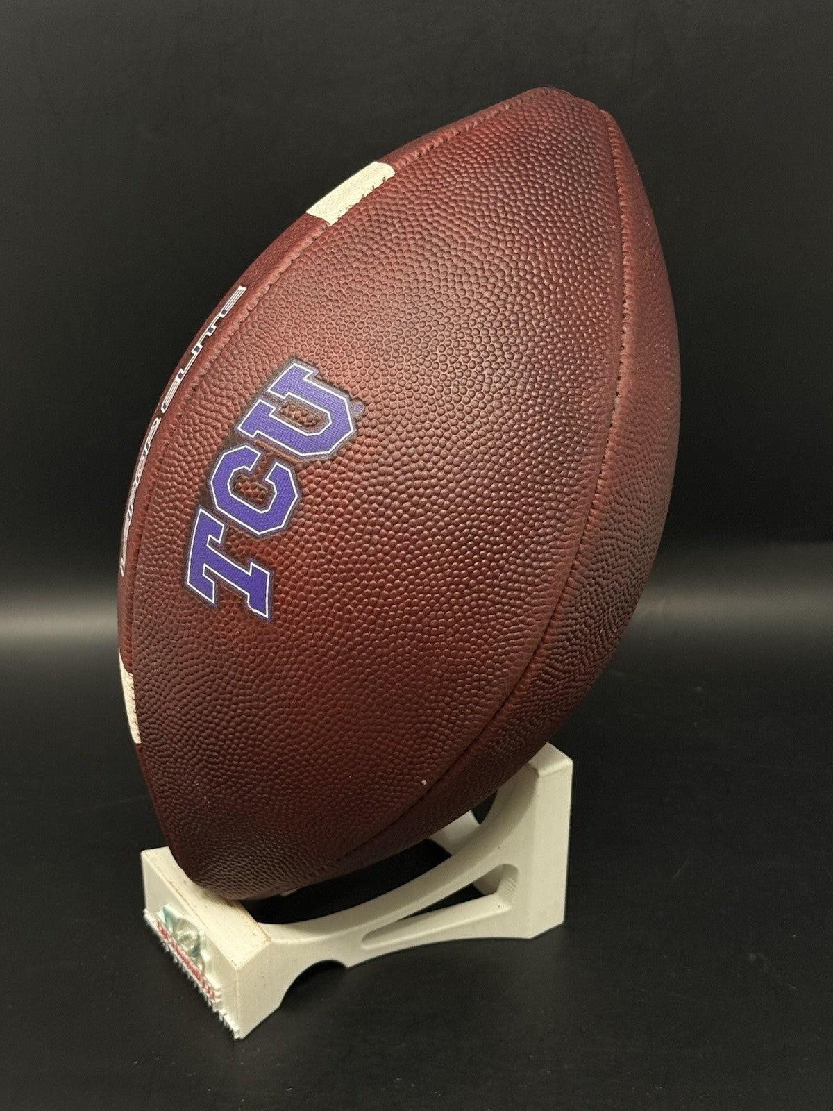This ball comes in very good condition with recently conditioned, tacked and brushed leather panels, a bladder that holds air just fine and logos that are very well-intact making this a great ball for any TCU fan or future star.