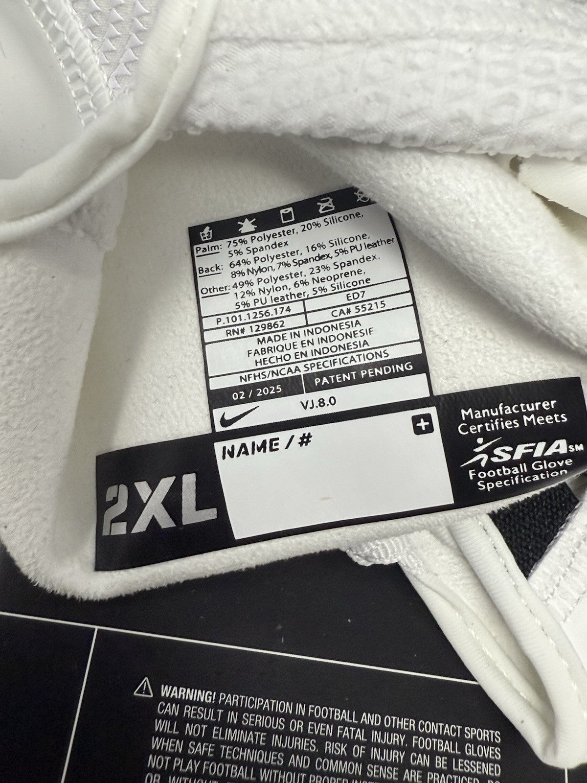 Size is Adult 2XL / XXL, and come new in original packaging. There are no rips, tears or defects on this pair of gloves and the tack/grip is still nicely intact, as expected. Perfect for usage or display in any Dawgs collection.