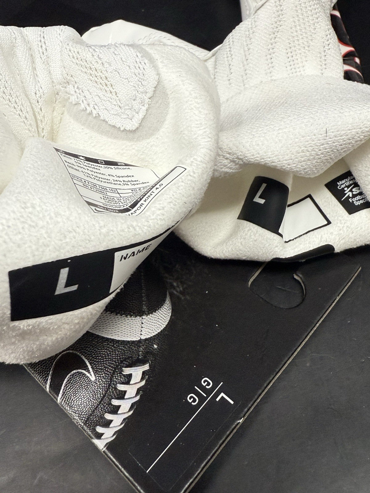Size is Adult Large, and this pair of gloves is new in its original packaging. There are no rips, tears or defects on this pair of gloves and the tack/grip is still nicely intact, as expected. Perfect for usage or display in any Dawgs collection.