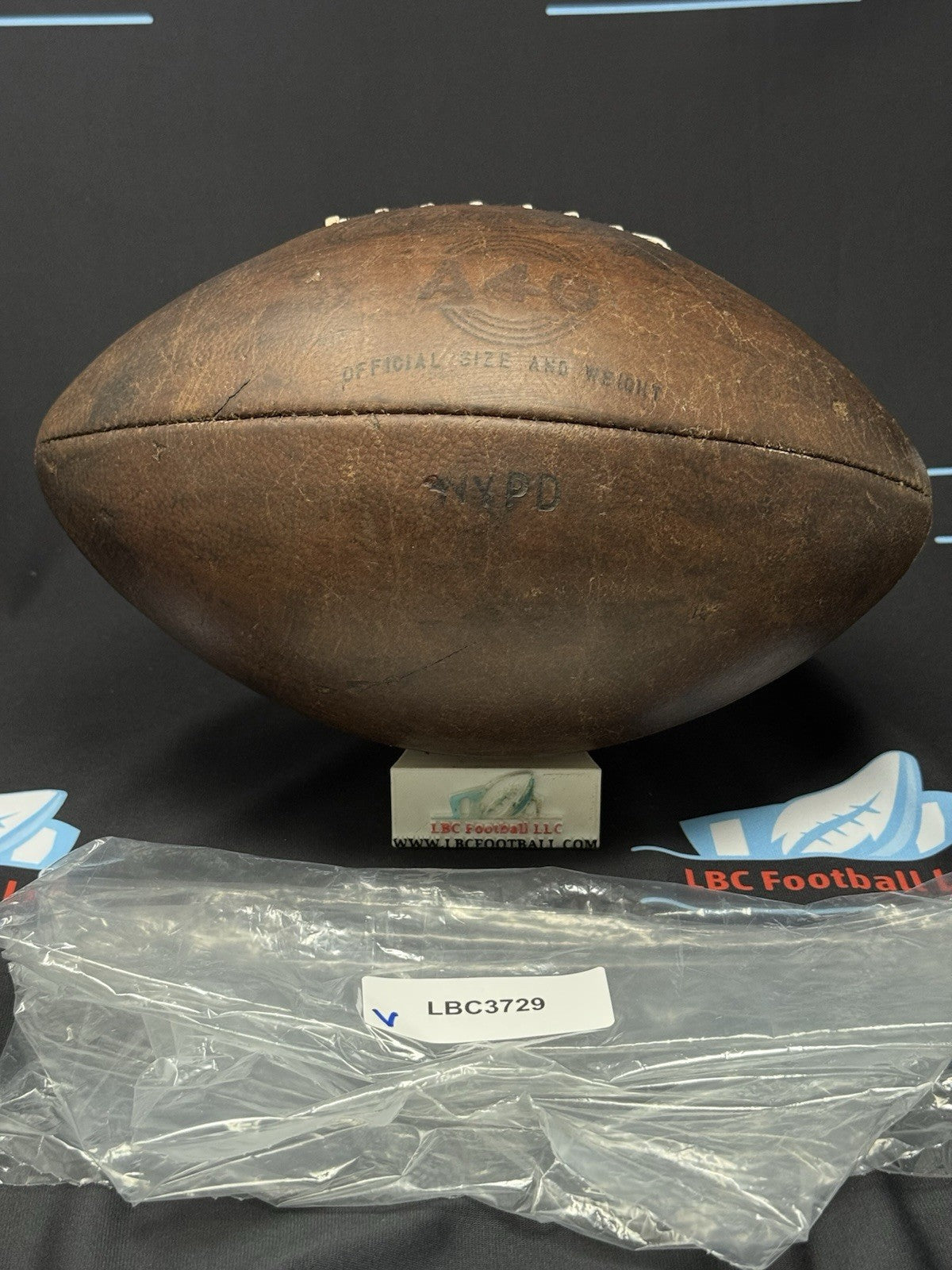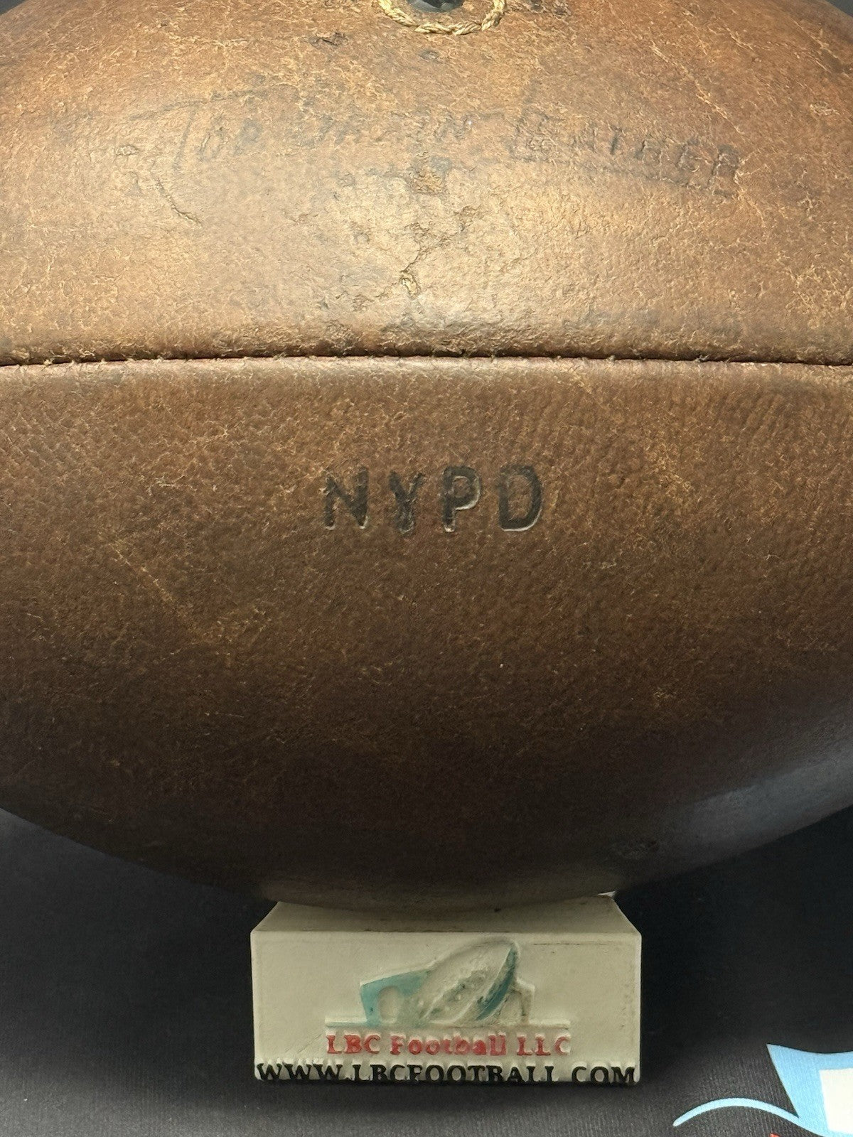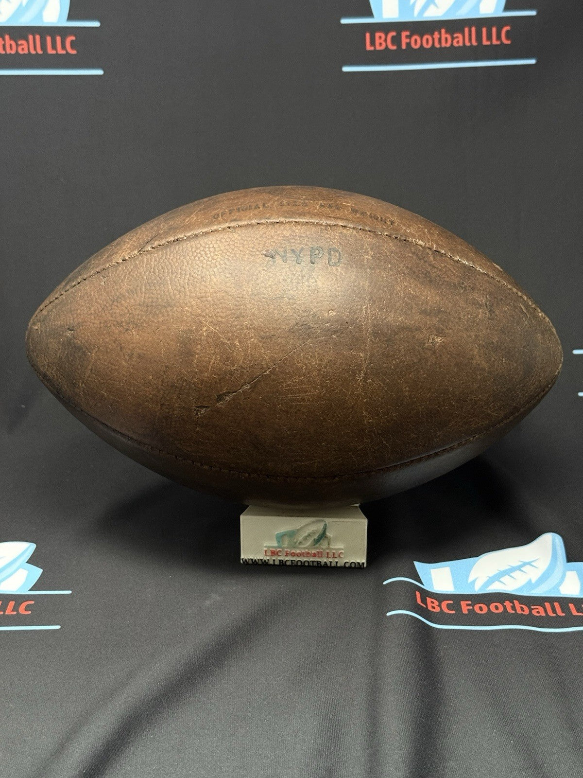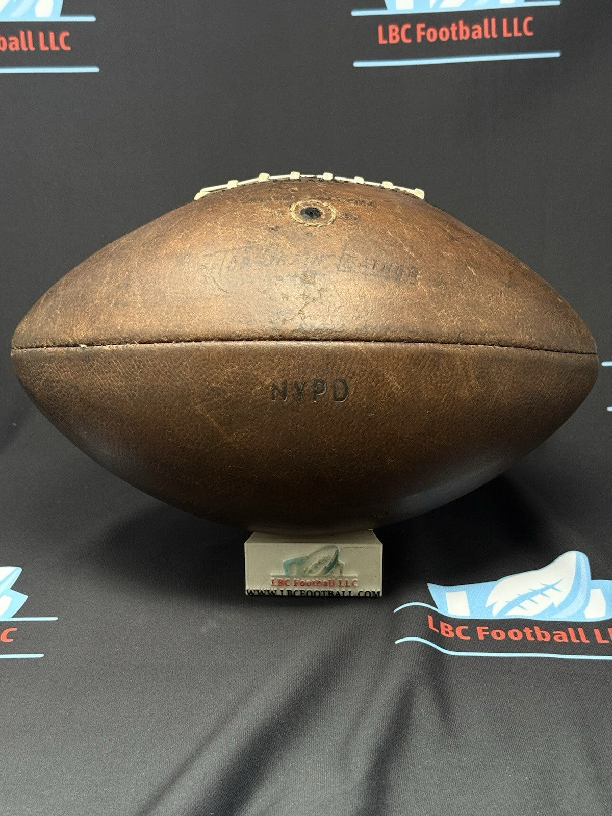 This vintage football was recently given a brand-new bladder and now holds air without issue. The leather panels were recently brushed and conditioned as well. The "NYPD" logo comes branded on the leather panel and original Rawlings logos are still intact on the panels as well.