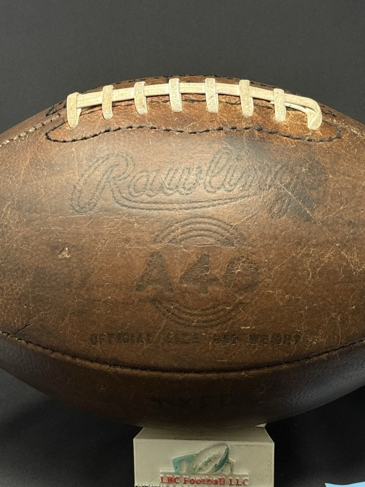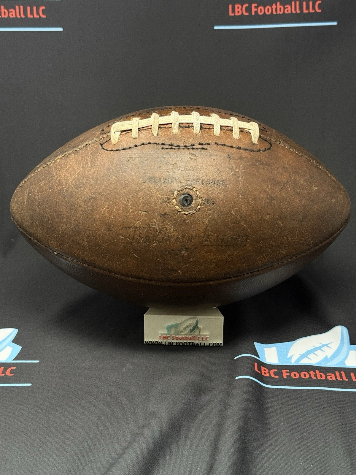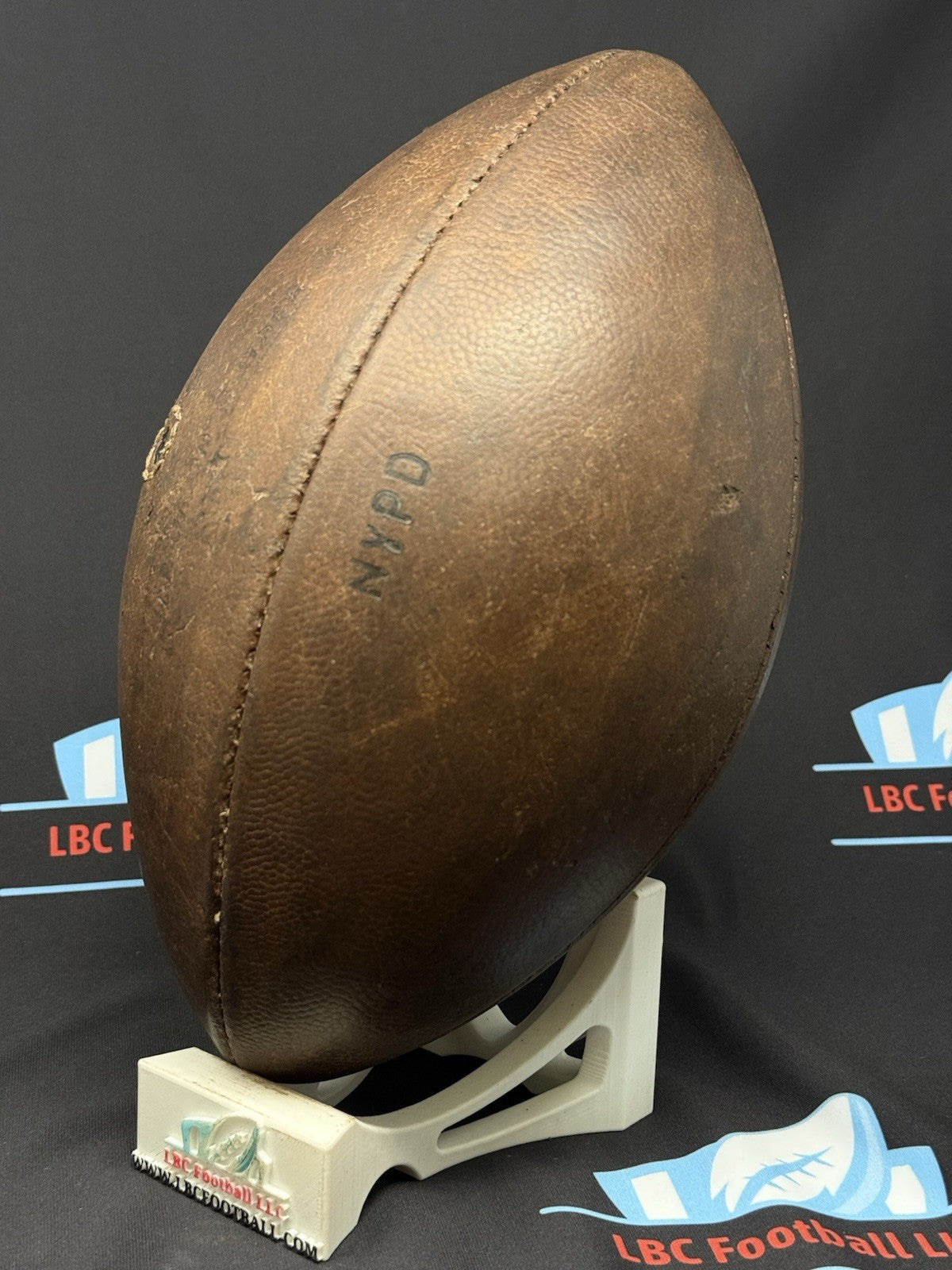 This vintage football was recently given a brand-new bladder and now holds air without issue. The leather panels were recently brushed and conditioned as well. The "NYPD" logo comes branded on the leather panel and original Rawlings logos are still intact on the panels as well.