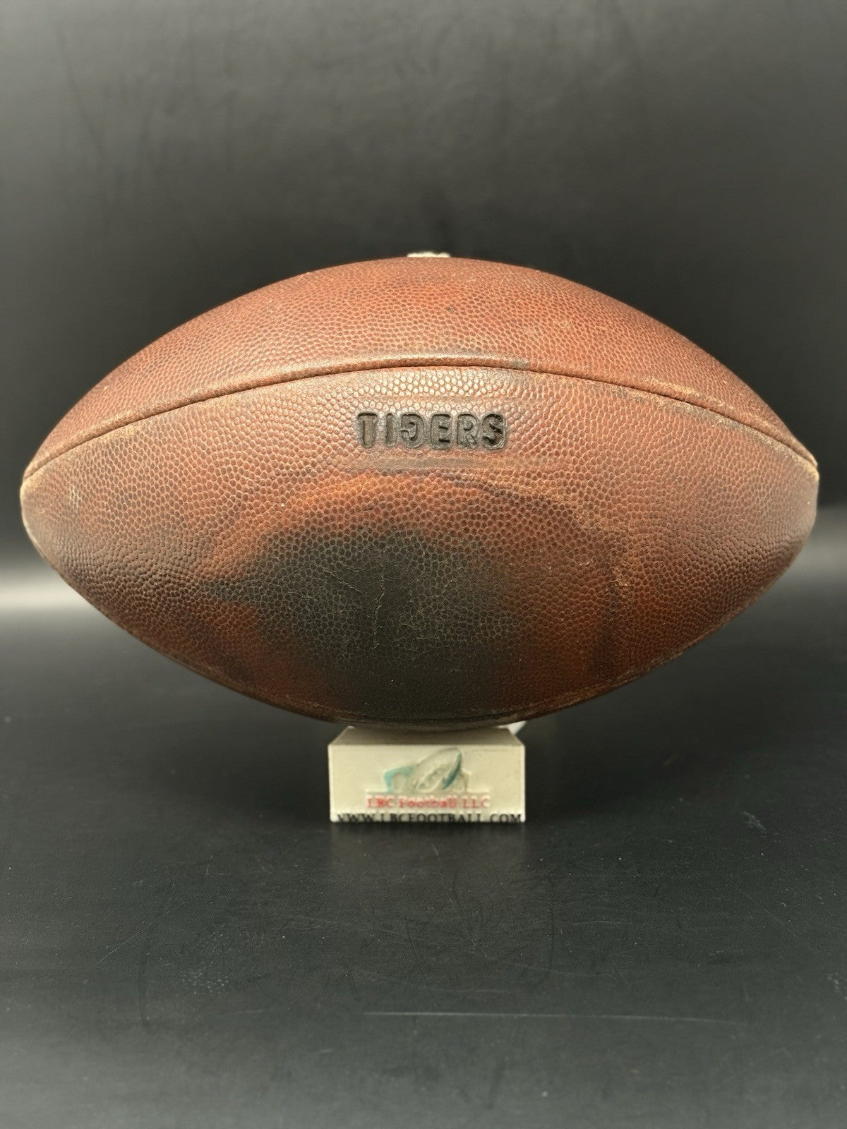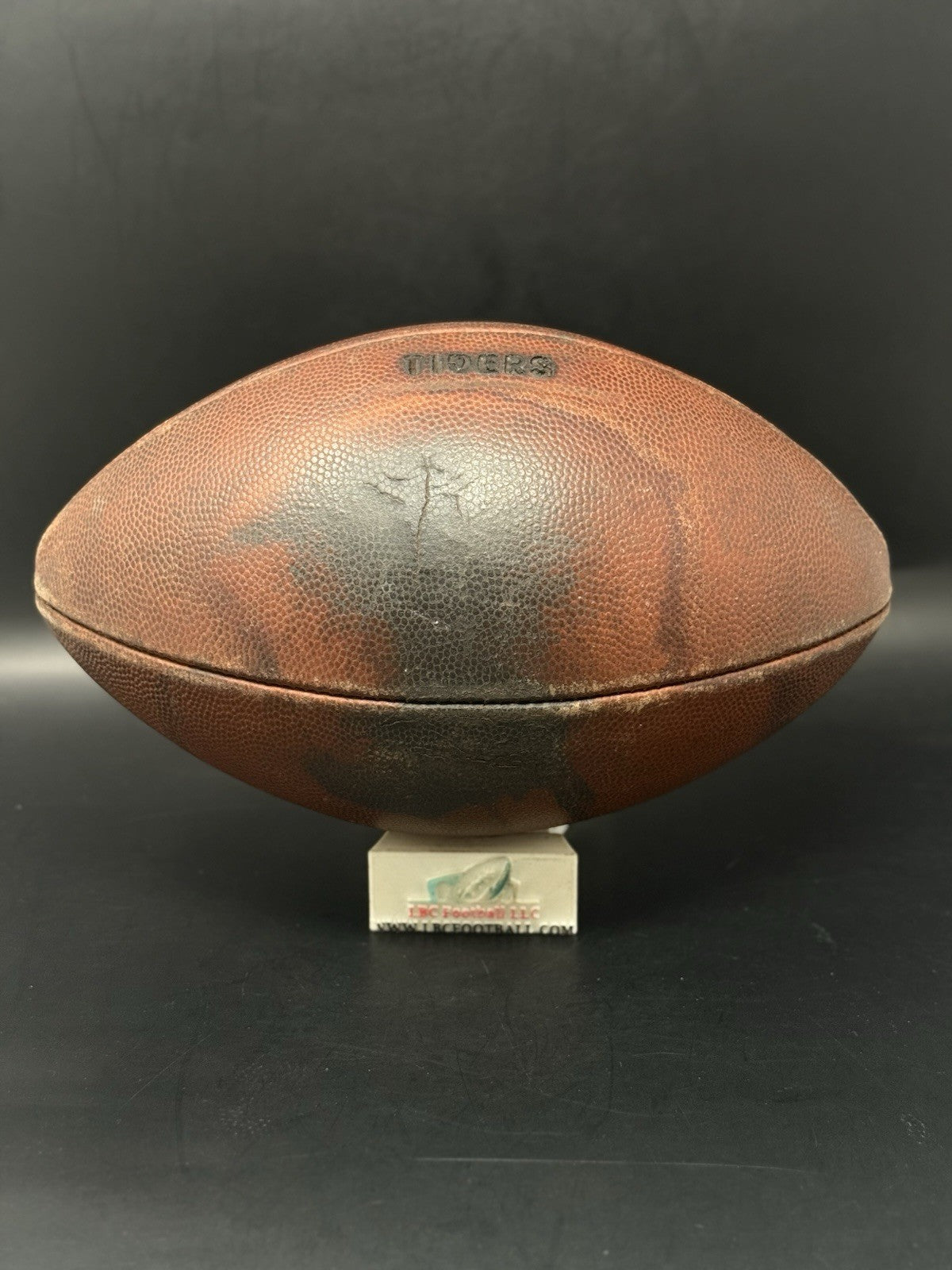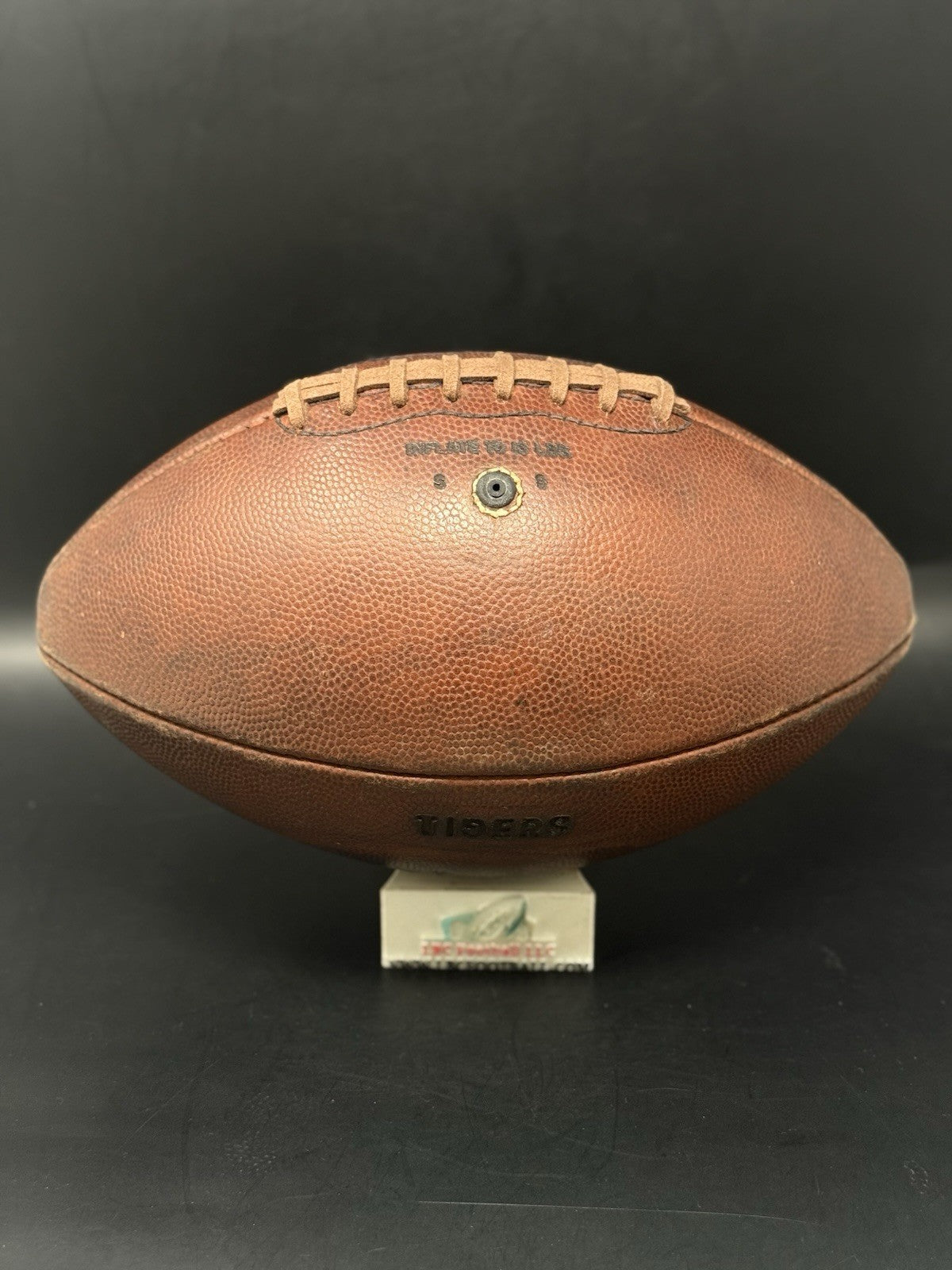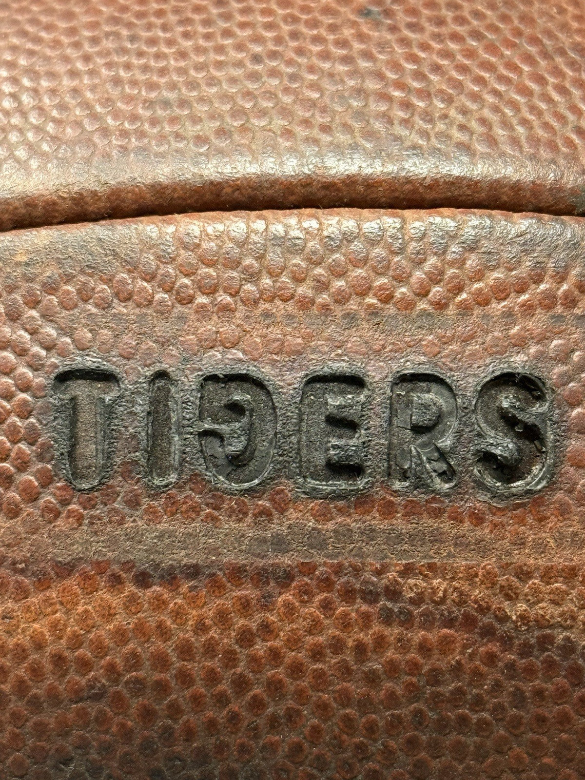 This vintage football was recently given a brand-new bladder and now holds air without issue. The leather panels were recently brushed and conditioned as well. The "TIGERS" logo comes branded on the panel with a unique backwards “G”. Cannot say for sure whether this was a LSU, Mizzou or another college program.