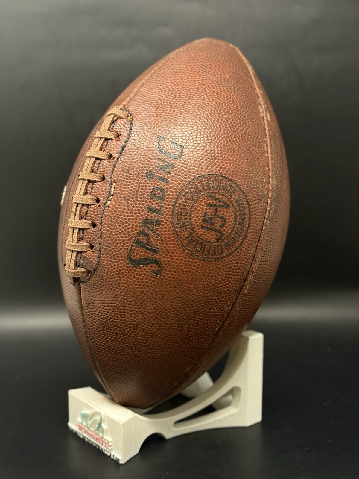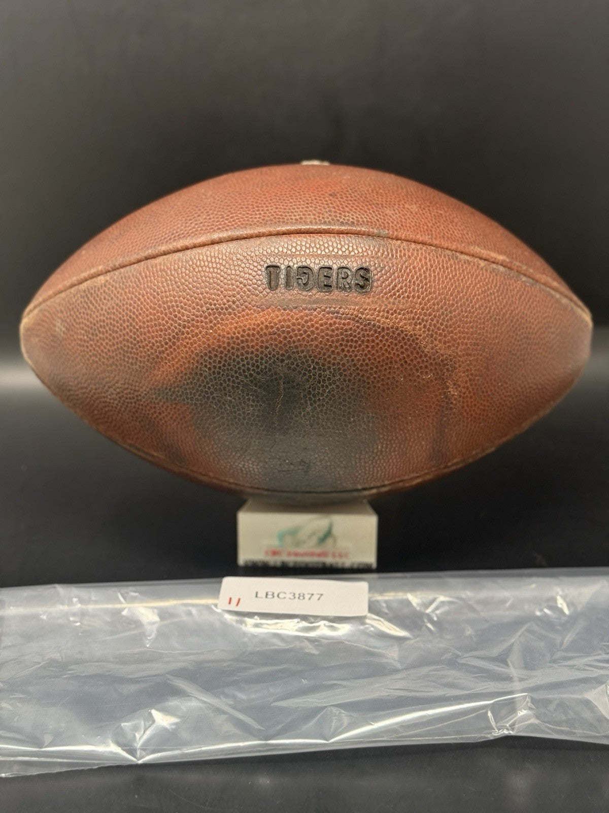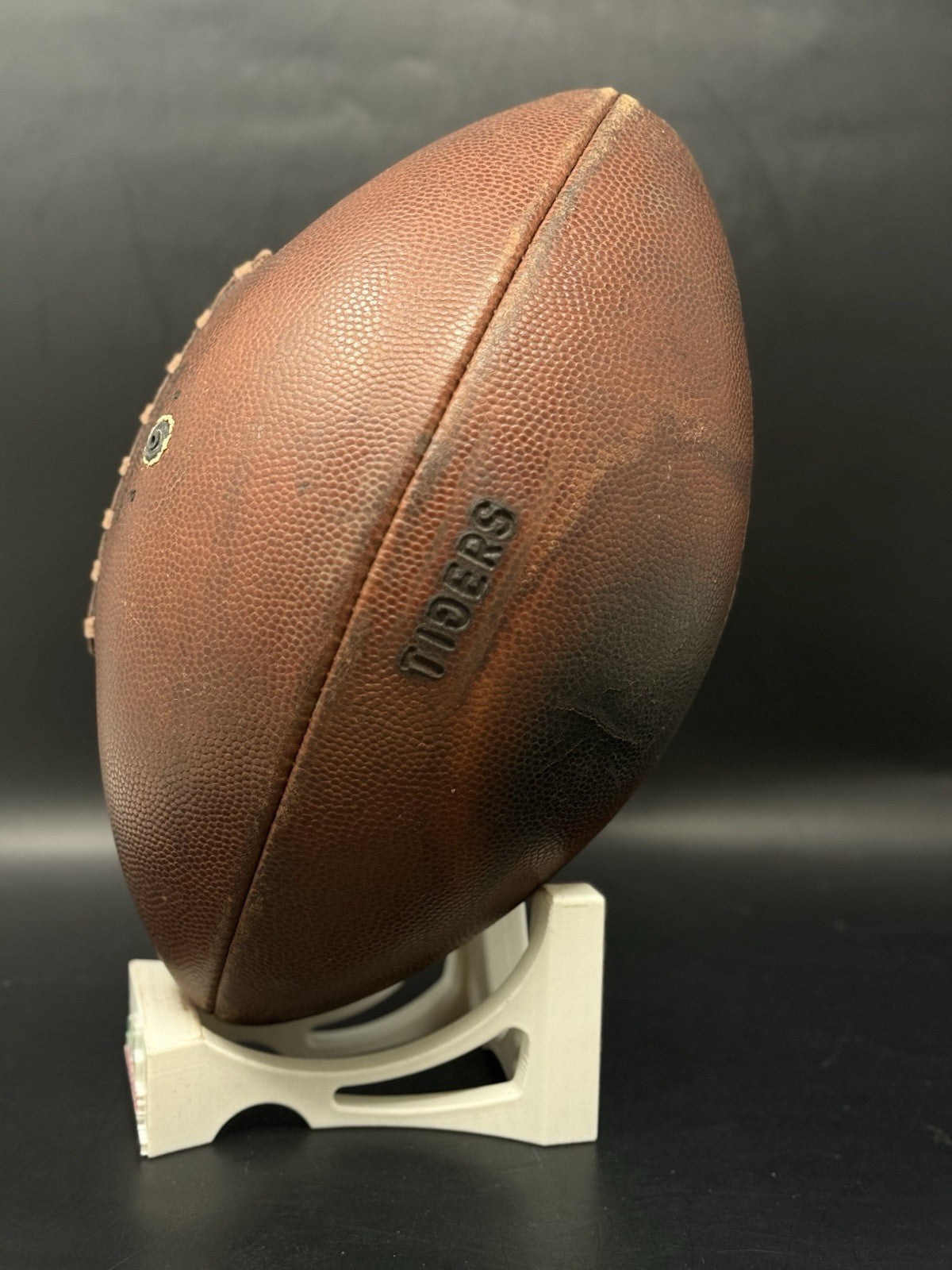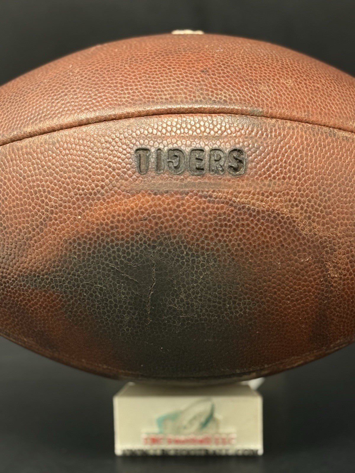 This vintage football was recently given a brand-new bladder and now holds air without issue. The leather panels were recently brushed and conditioned as well. The "TIGERS" logo comes branded on the panel with a unique backwards “G”. Cannot say for sure whether this was a LSU, Mizzou or another college program.
