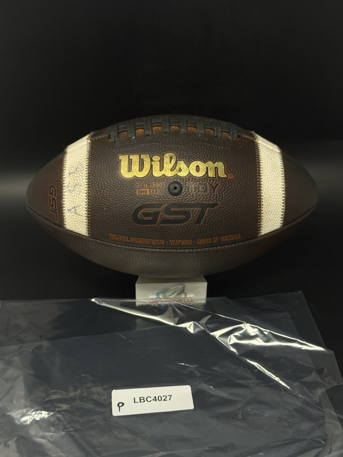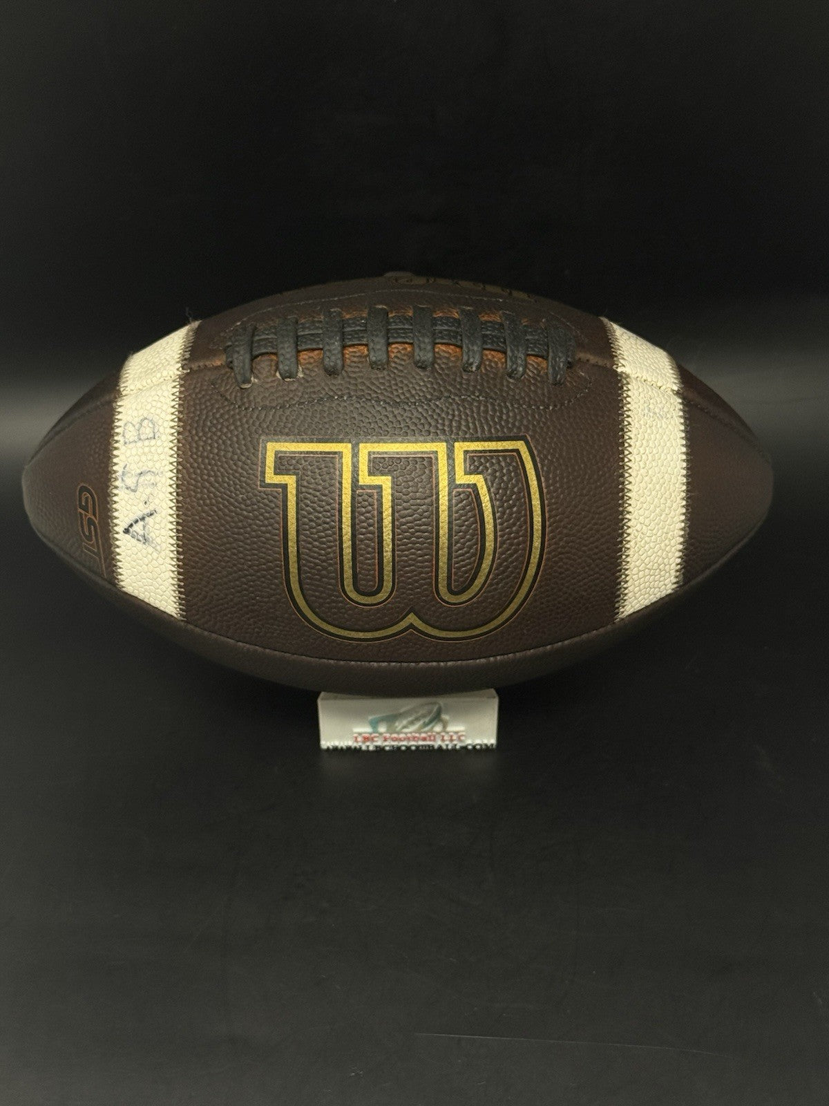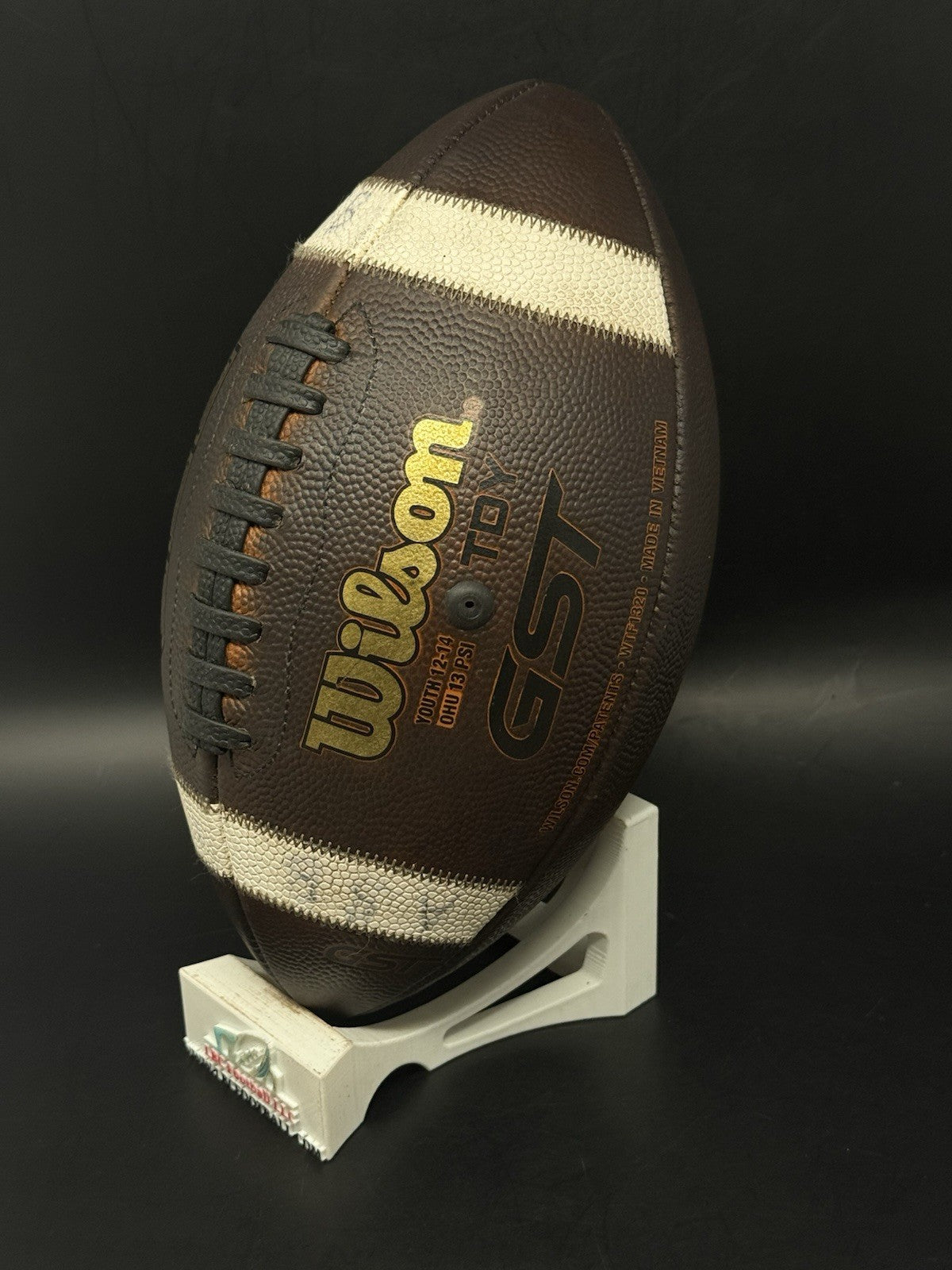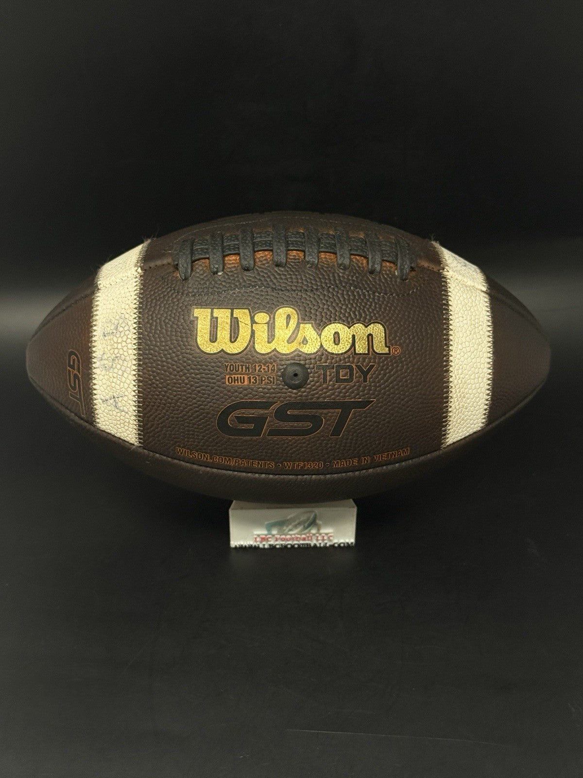 Wilson GST TDY Youth Size 8 (Ages 12-14) Leather Football that was just recently fully game prepped by LBC Football. Prior to being game prepped the spa was used for a very short period of time and is still in like new condition with exception to the previous owner marking the white stripes.