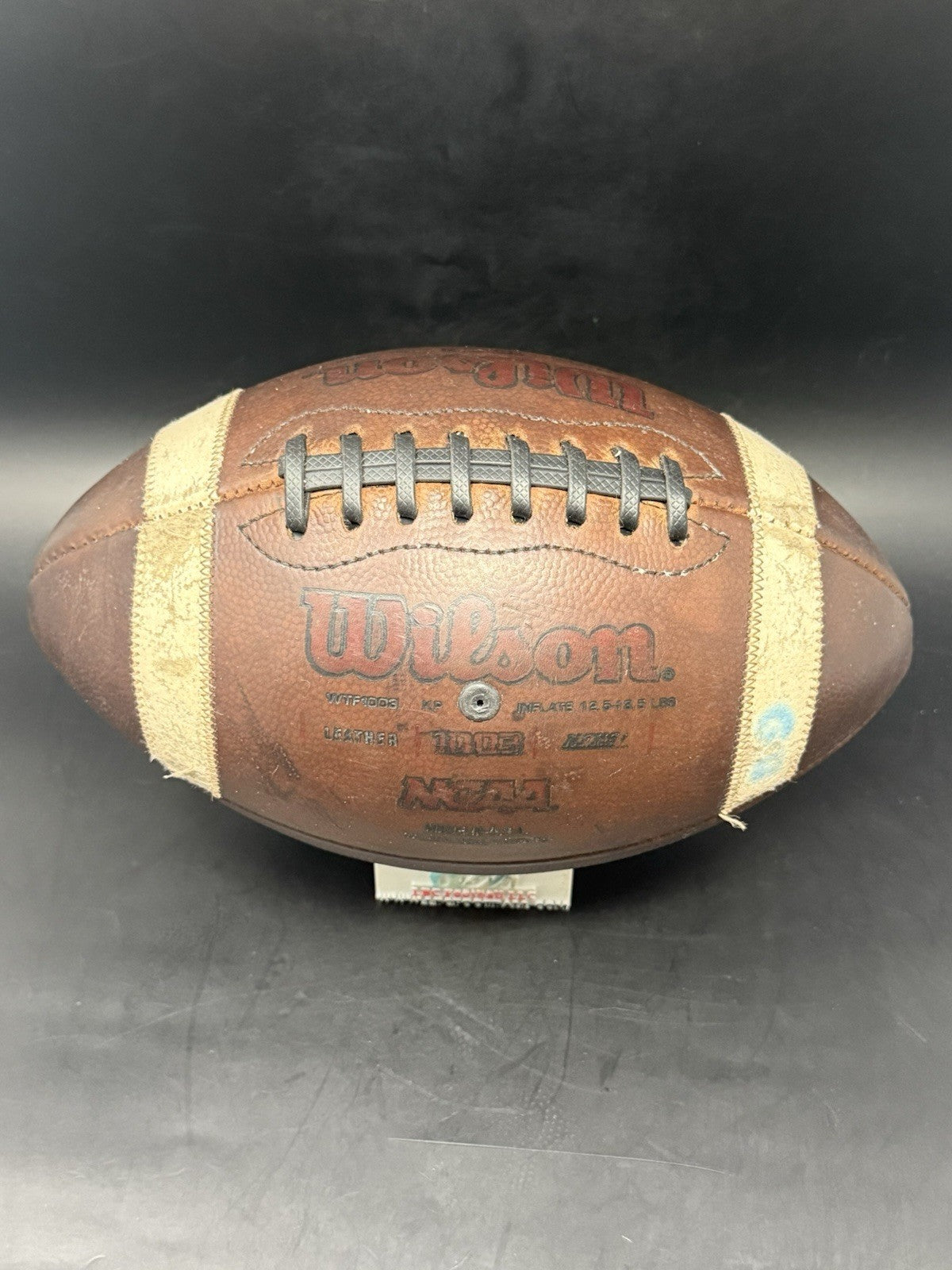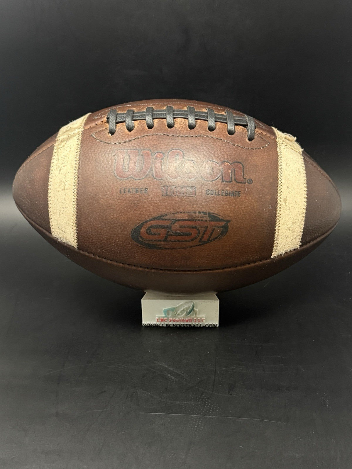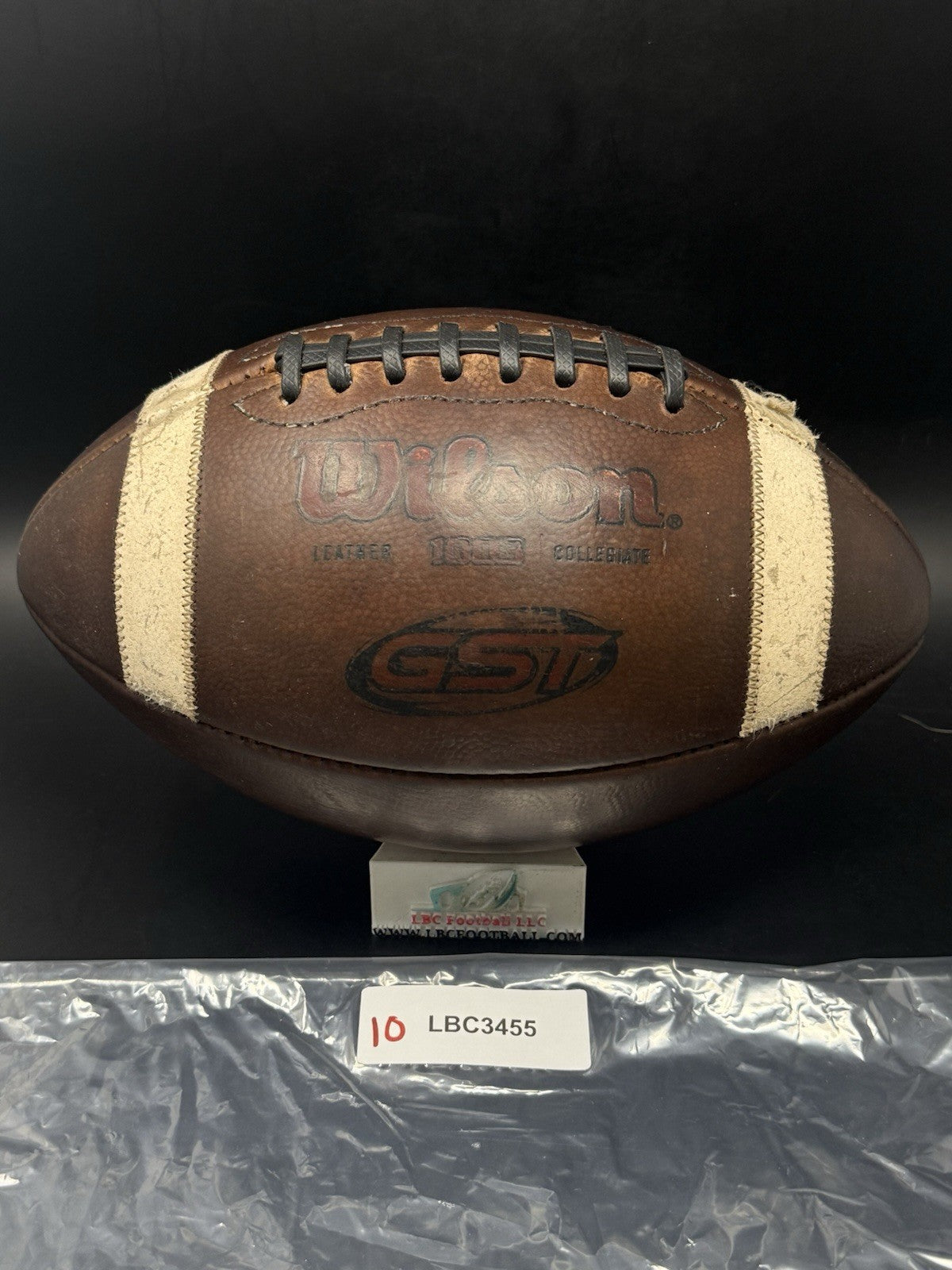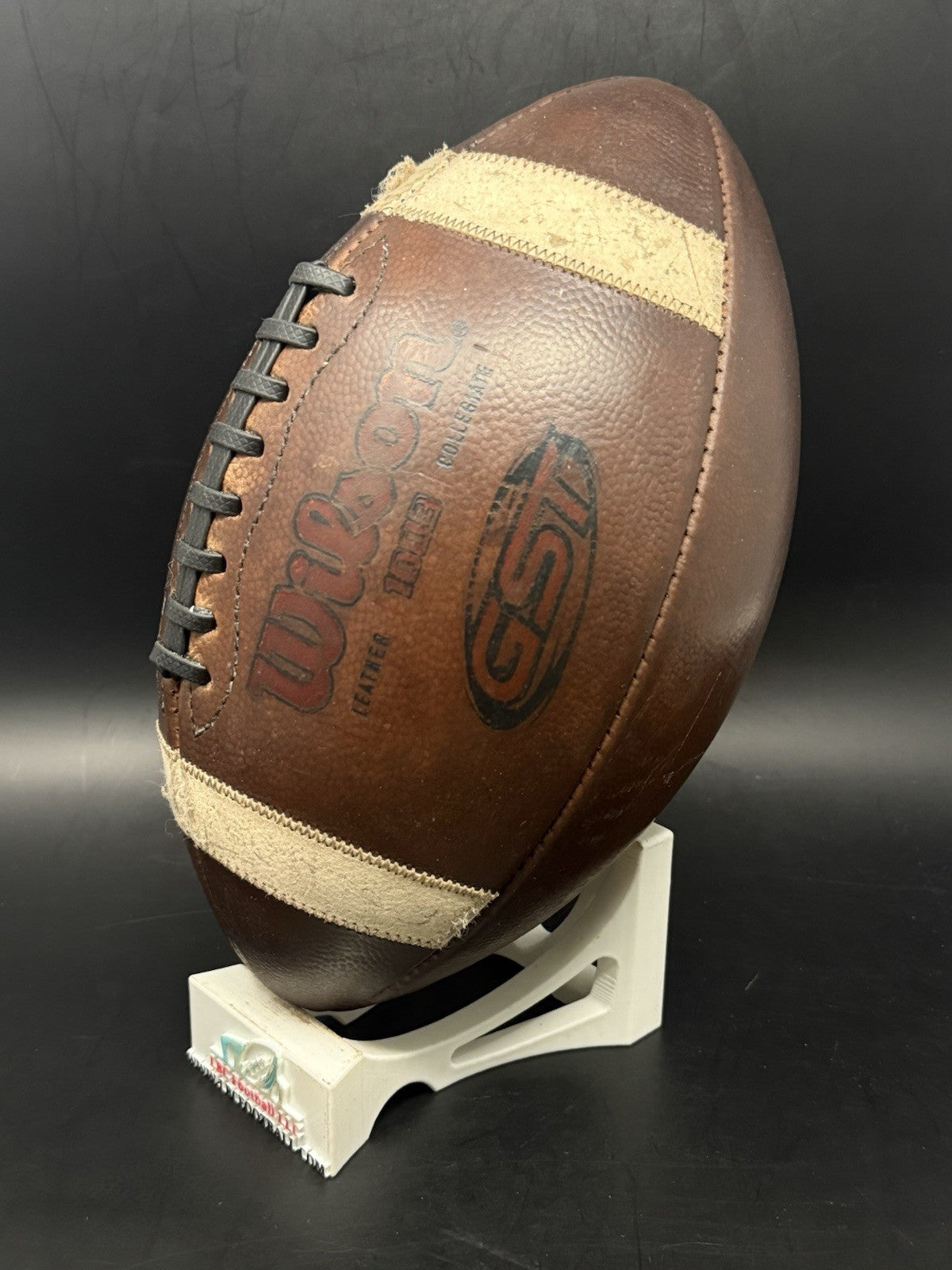 Used Wilson GST QB Football. Recently comes with a brand-new bladder and Black Tacky Diamond Pattern lacing. The panels are smooth due to prior usage and the leather was just re-conditioned, tacked and brushed. Sewn on white stripes have some fraying. Perfect for any training or practice sessions.