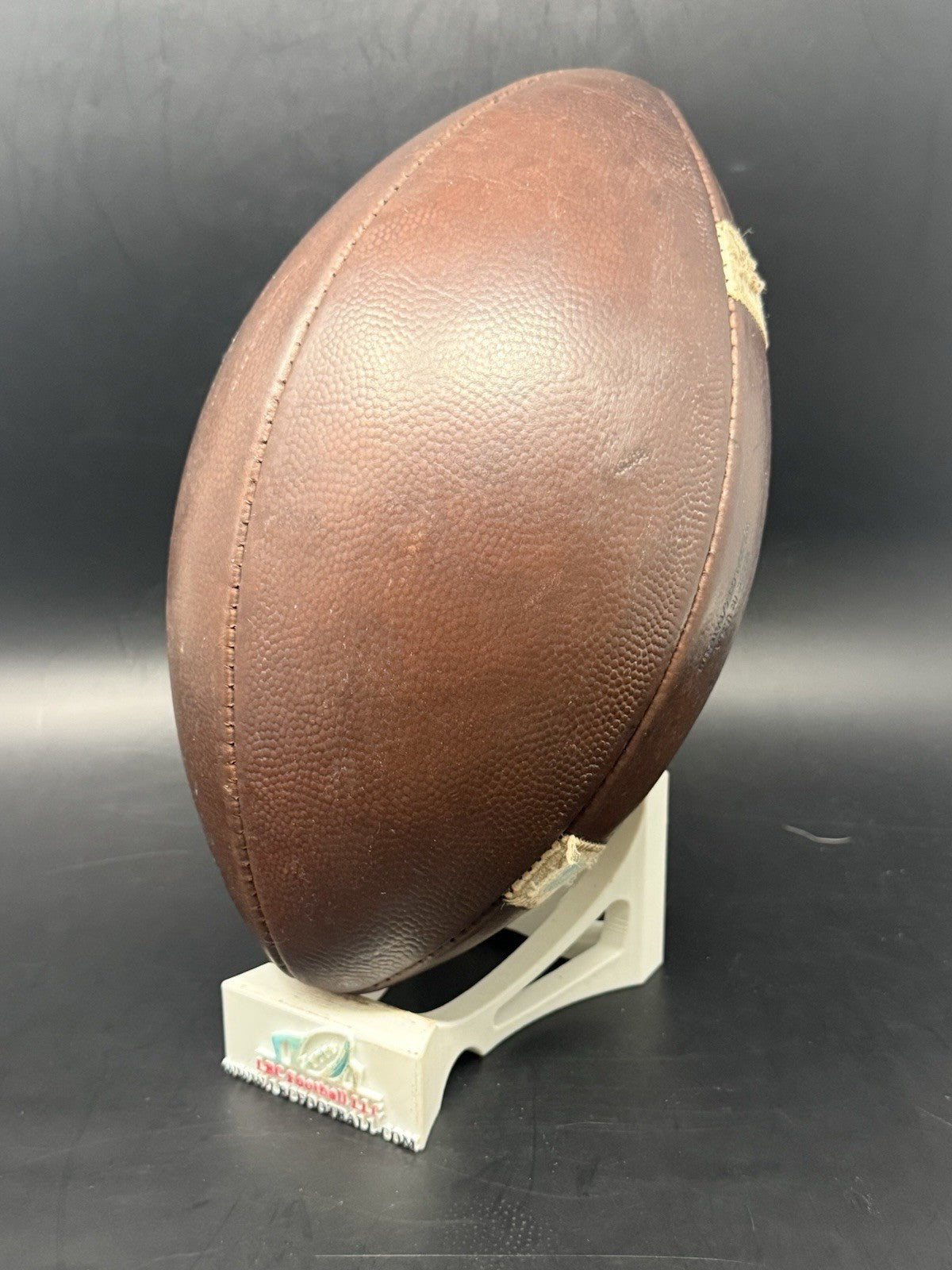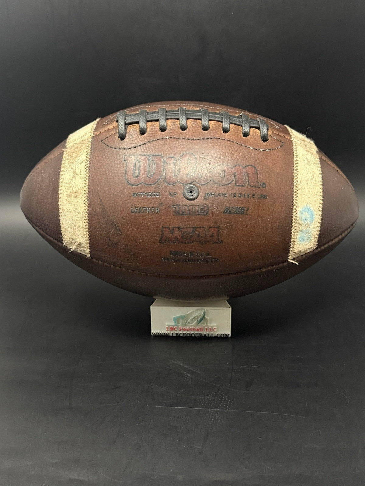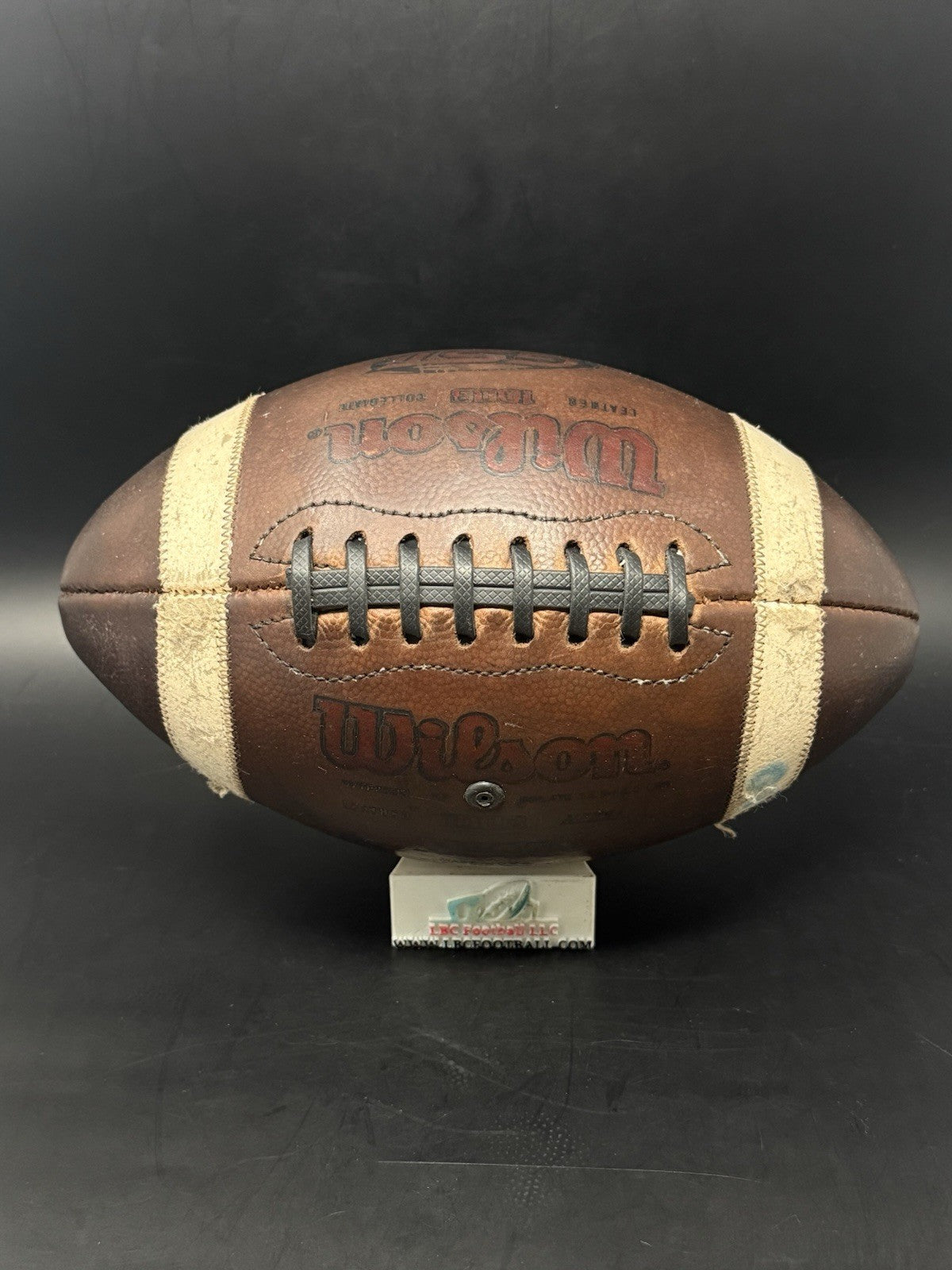 Used Wilson GST QB Football. Recently comes with a brand-new bladder and Black Tacky Diamond Pattern lacing. The panels are smooth due to prior usage and the leather was just re-conditioned, tacked and brushed. Sewn on white stripes have some fraying. Perfect for any training or practice sessions.